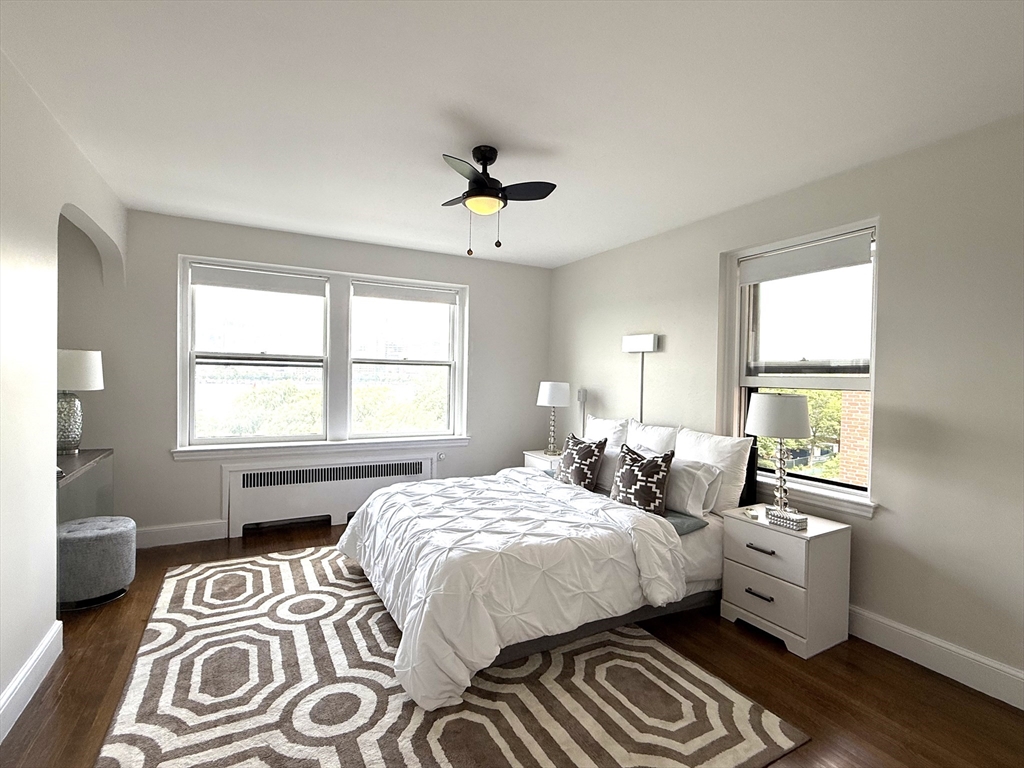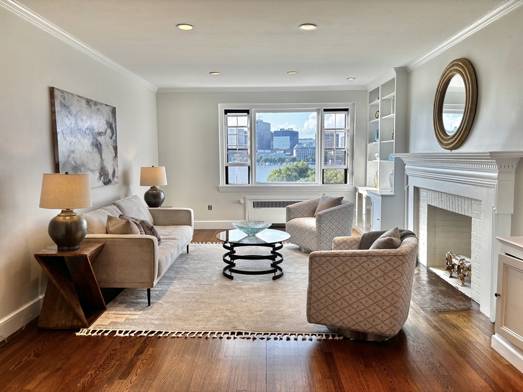Sophisticated WATER-VIEW home WITH A FRESH NEW LOOK! This stunning condo offers an open-concept kitchen, living & dining area with breathtaking views of the Charles River & Cambridge skyline. Take the elevator to floor 6; enter the chef-inspired kitchen, ideal for entertaining w/a sprawling island, high-end appliances, ample cabinetry, &elegant granite countertops. Custom built-ins add both charm & generous storage throughout the main living space. Wake up to sweeping views in the front-facing primary bedroom, complete with two closets, a cozy reading nook, and a private en-suite bath. The second bedroom is spacious &bright, also with an en-suite bath and sleek glass shower. A beautifully maintained common rooftop deck offers a front-row seat to the river and city beyond. Enjoy unbeatable proximity to the Esplanade, Newbury St, Boston Common, Copley Square, and the Prudential Center. Convenient access to mass transit, elevator building, on-site super. Sorry, no dogs permitted.
