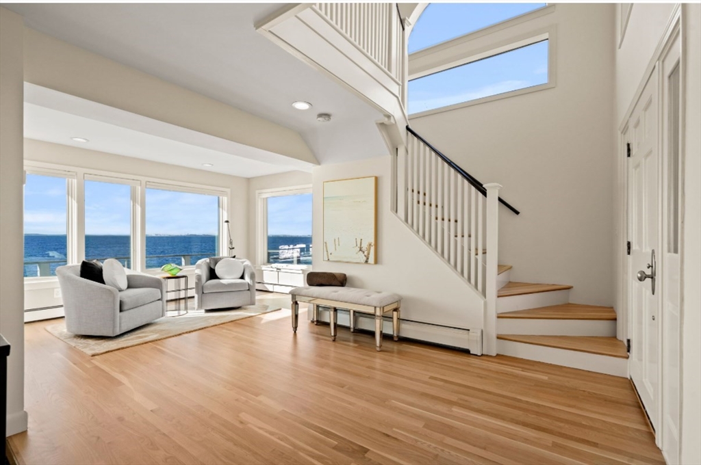 Imagine having your own rock formations in the sea & your own private beach. Step into a magnificent foyer w/endless views of the ocean & the Boston Skyline. A sun filled living rm w/beamed ceiling, nw white oak flrs, frplc & steps to an expansive 10 x 28 oceanside deck. The chef's kitchen showcases white cabnts, paired w/ss applncs & granite cntrs along w/an ocean view dining area. Next, a formal dining rm that lends a more intimate setting, ensuring comfort & privacy. A striking staircase w/custom half round & rectangular windows leads you upstairs to 3 lovely bedrms. The spacious south facing primary bedrm has an outside deck & a wall of windows that frame the oceanside cliffs & a luxurious en-suite w/skyline views. Two more bdrms & bthrm complete this flr. The 3rd level boasts vaulted ceilings & gorgeous wide plank pine flrs & an oversized 4th bedrm, private decks, a library/office, famly rm, laundry & bth. Large basement/workshop, huge backyard w/water access & 4 car prk.