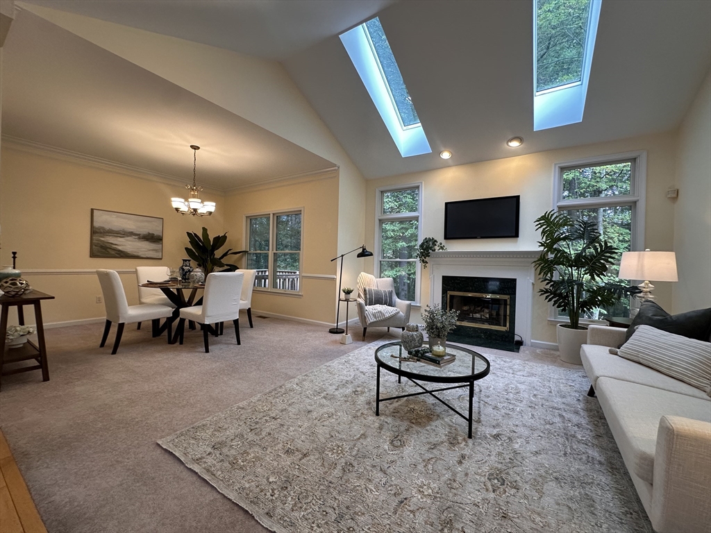 Exceptional single-level living in the serene community of Huckins Farm. This sun-filled home offers a vaulted living room with fireplace & skylights, a spacious eat-in kitchen with center island, & a formal dining room ideal for entertaining. Defined spaces include a 1st floor office & a charming sun porch off the kitchen. Two bedrooms on the main level, including a primary suite with dual closets & en-suite bath. The finished basement adds versatility with a full bath, bonus room & ample storage. Residents enjoy community amenities including horse paddocks, pool, tennis, fitness center & scenic trails. Tucked away for privacy yet convenient to local amenities, this unit is not to be missed. Take advantage of a great price improvement and schedule your appointment today.