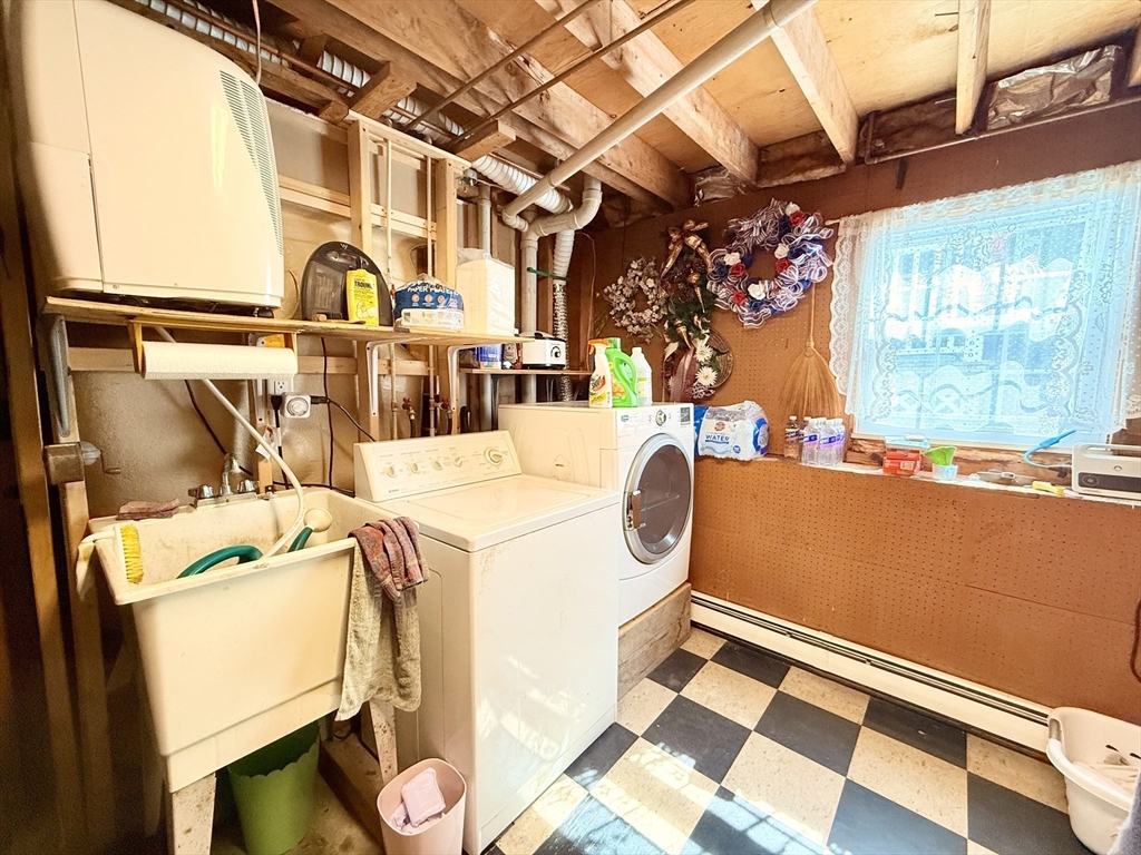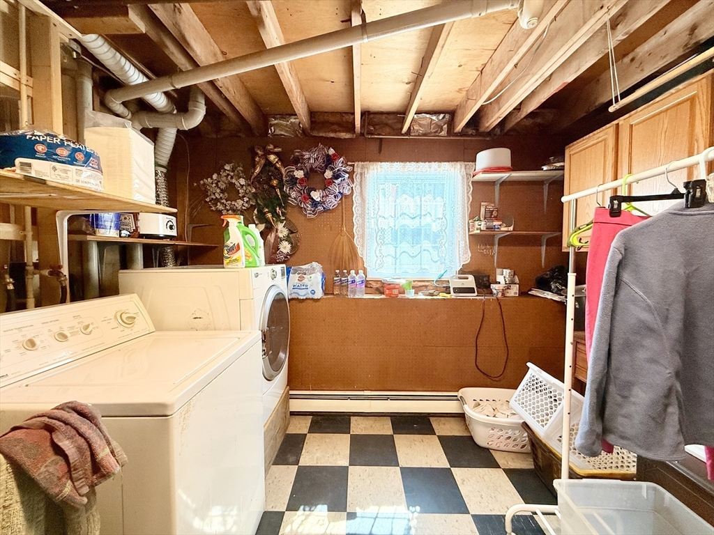 48' Raised Ranch w/Gambrel front / 1 car garage built-in / Braintree Highlands / Neighborhood surrounded by Braintree Forest, and with the new Middle School at the end of the street. Living room with raised hearth fireplace and bow window, hardwood floor / Open beam ceiling to Formal Dining Room with chair rail, hardwood floor, Split AC on wall, open to Kitchen, and a slider with access to the 3 season porch / Kitchen with hardwood floor, custom peninsula, corian countertop, smooth top electric range, dishwasher, disposal, built-in microwave with hood fan, pass through door to the 3-Season porch, Three Bedrooms, all with hardwood floors, 6-panel doors / Pull-down stair to attic access. Full basement with raised hearth Fireplace, wall to wall carpeting / Boiler closet with new Weil McLean Boiler / 3/4 bath with fiberglass shower / Office or study / and Laundry with Electric dryer, slop sink. Beautiful backyard with unground gunite free-form pool.