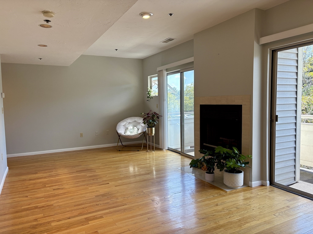 Welcome to "The Falls". Rare find 2 level top floor unit in highly desirable condominium in Quincy. South facing double sliding doors on the first floor and large surrounding windows on the 2nd floor bring in abundant natural sunlight. Hardwood floors throughout. Living room features fireplace and 2 sliding doors leading to the private balcony. 2 good size bedrooms both with high ceilings, large windows, skylights and large closets. 1 full bath on the 2nd fl and 1 half bath on the1st fl. In-unit laundry and central cooling and heating. 1 deeded parking spot and an abundance of visitor parking. Freshly painted throughout. Professionally managed, pet-friendly community with superintendent on-site. Convenient location with walking distance to Faxon Park, shops, restaurants. Easy access to highways and public transportation.