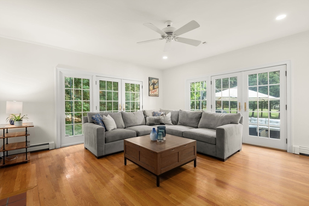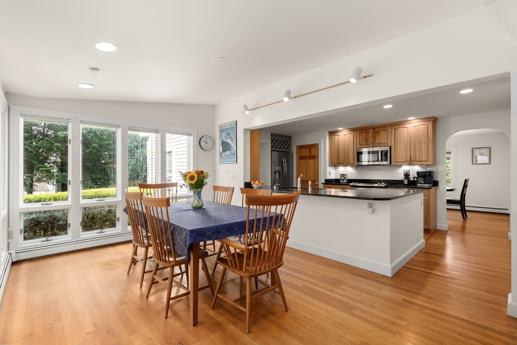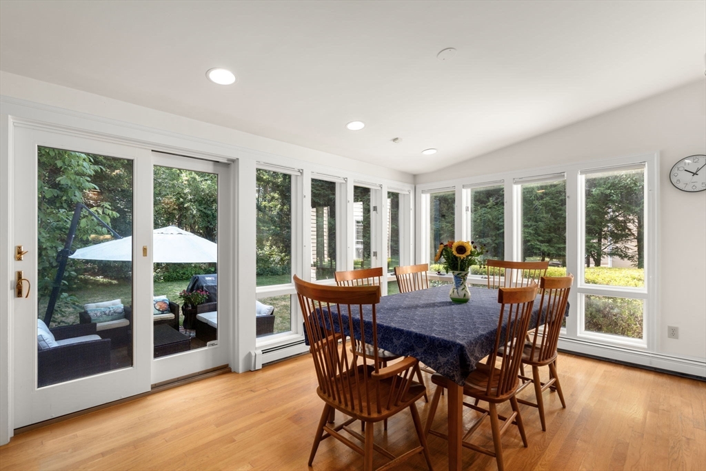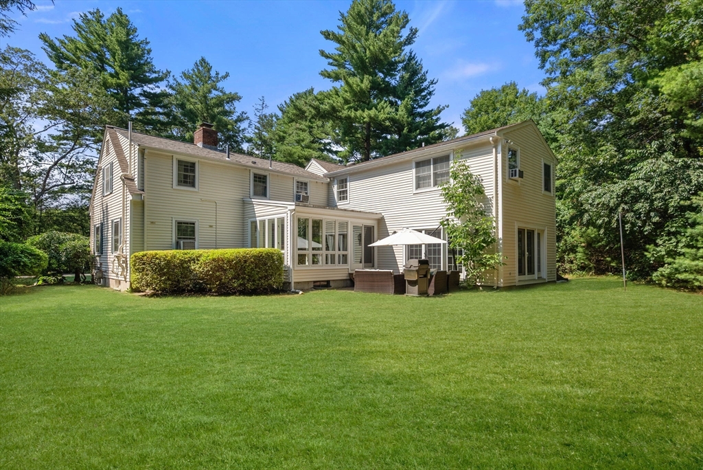 Welcome home to this beautifully expanded and updated 4-bedroom, 3-full-bath Cape, ideally situated on just over an acre of wooded privacy in a popular neighborhood. The eat-in kitchen, complete with newer stainless appliances, opens effortlessly to a sun-drenched sunroom and inviting family room with built-ins and a wood-burning fireplace—perfect for everyday living and entertaining. A spacious front-to-back living room, formal dining room, and hardwood floors add timeless appeal and functionality. Step outside to enjoy a tranquil backyard oasis featuring a brick patio surrounded by mature trees and lush landscaping. Additional features include a newer gas heating and hot water system, two-car garage, abundant natural light, generous storage throughout, and a lower level with great potential. All this, in a prime location in Weston’s top-rated school district & a short walk to the commuter rail. This home offers the perfect blend of comfort, convenience, and classic New England charm.