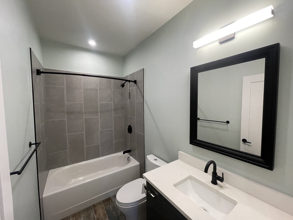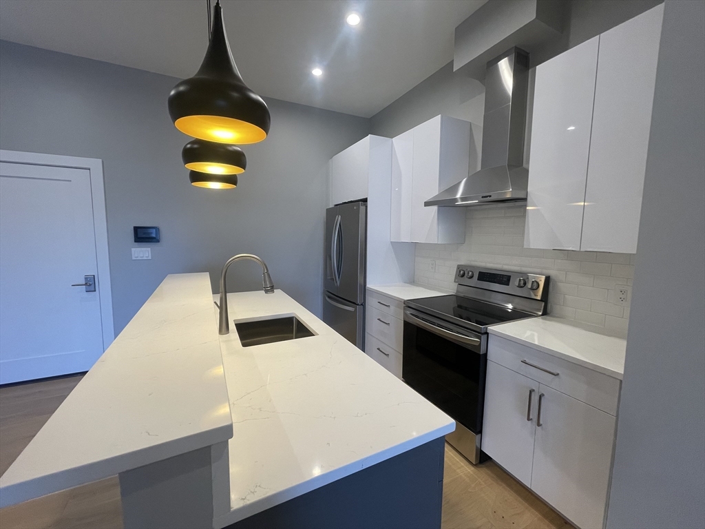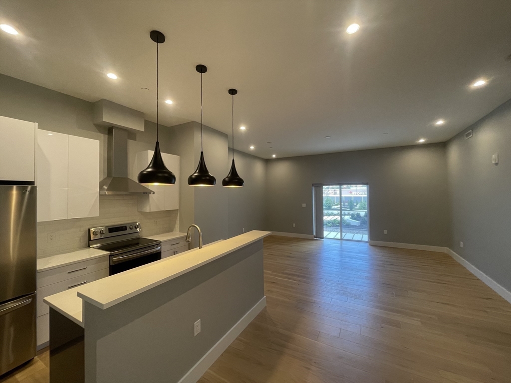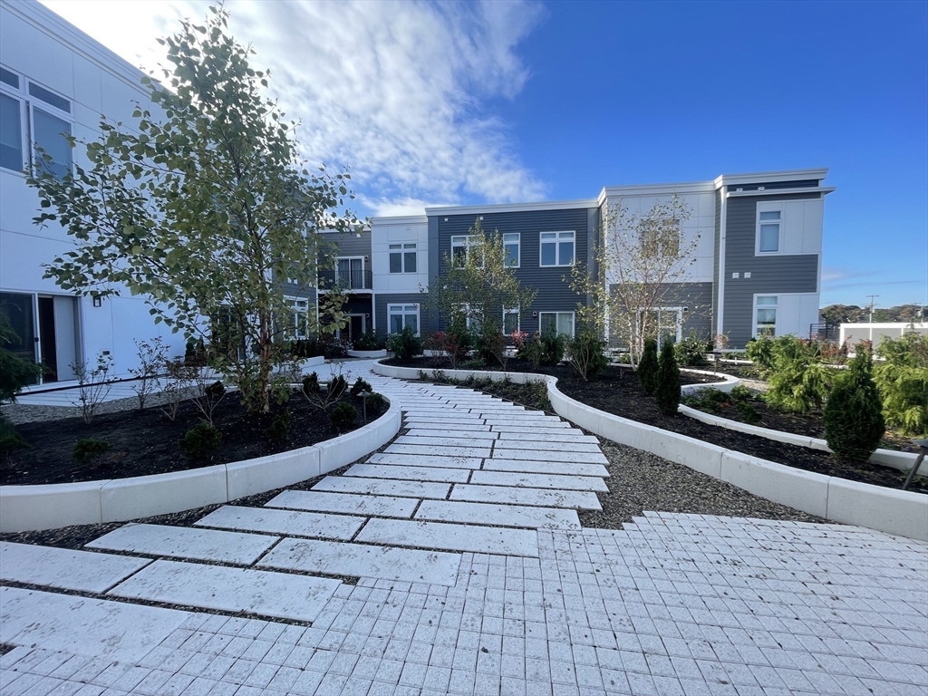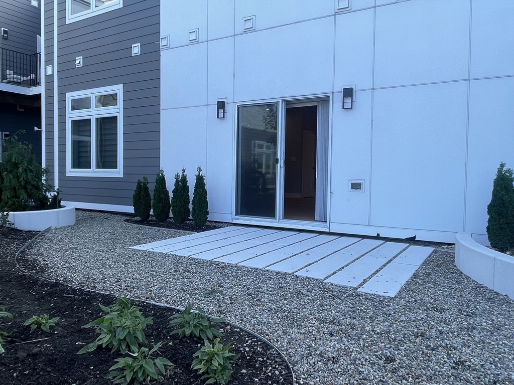 Stunning 2 bed, 2 bath condo with exclusive outdoor space and garage parking for 2 cars in new construction building. Open concept living with 9 ft ceilings, recessed lighting, striking kitchen with granite countertops, ss appliances & custom cabinets and large glass sliding door providing direct access to exclusive patio & common roof terrace. Spacious bedrooms with plenty of closet space with primary offering master bath walk in closet. In unit laundry, central AC, modern tile bathrooms and luxury finishes throughout. Building offers community room with kitchen, common courtyards, access to public green space, mail room, bike storage and main lobby. Tenant responsible for gas, electric and water/sewer utilities. Just steps from Assembly Row shopping, dining & Orange Line T and easy access to Cambridge, I-93 & Downtown Boston. Walk Score- 90, Bike Score- 86.