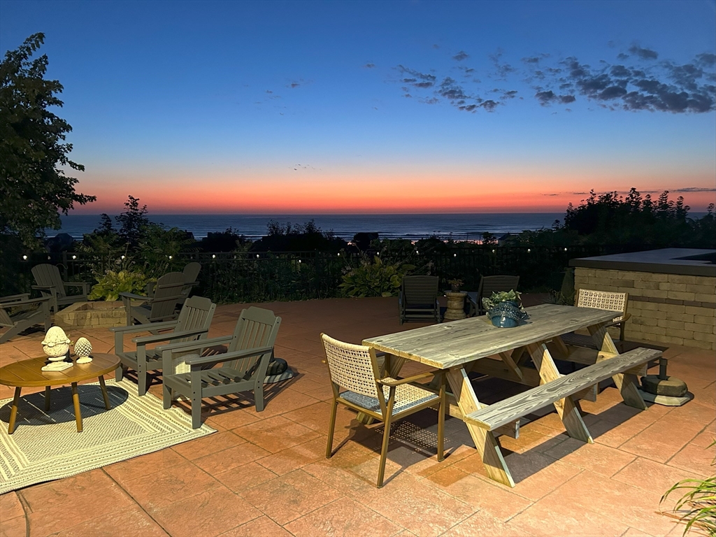 *PRICE IMPROVEMENT* This exceptional home offers a vacation lifestyle every day! Bask in the spectacular, panoramic ocean views from nearly every room. Situated on Strawberry Hill, this property boasts one of Hull's most sought-after vantage points. The main bedroom's private deck and a massive private patio offer ideal spots for relaxing and soaking in unforgettable sunrises and moonrises over the majestic Atlantic. Soothing sea breezes flow across the patio as you take it all in. Inside, the spacious kitchen is a chef's dream, featuring a large island, a breakfast nook, a butler's pantry, and beautiful white soft-close cabinetry with quartz counters. The kitchen flows seamlessly into the open living and dining rooms, creating a comfortable gathering space for family and friends. Sliders in both the living room and kitchen provide easy access to the patio. The main suite includes a private bath, walk-in closet and a private deck; The laundry is on the 2nd floor. *NO FLOOD INSURANCE*