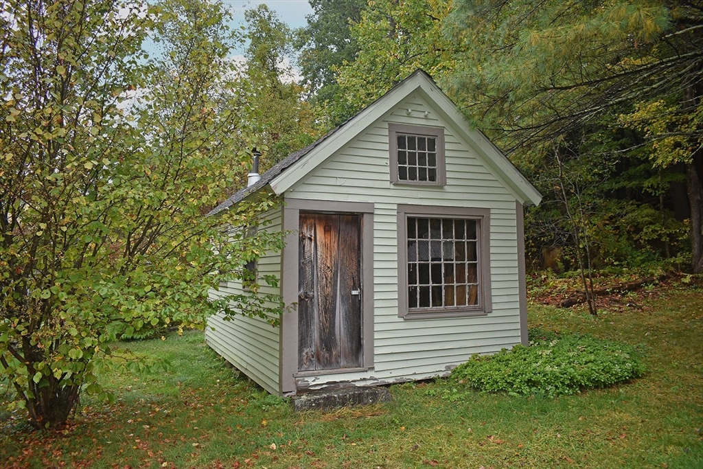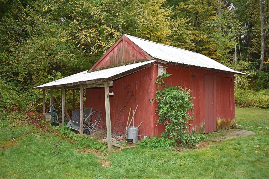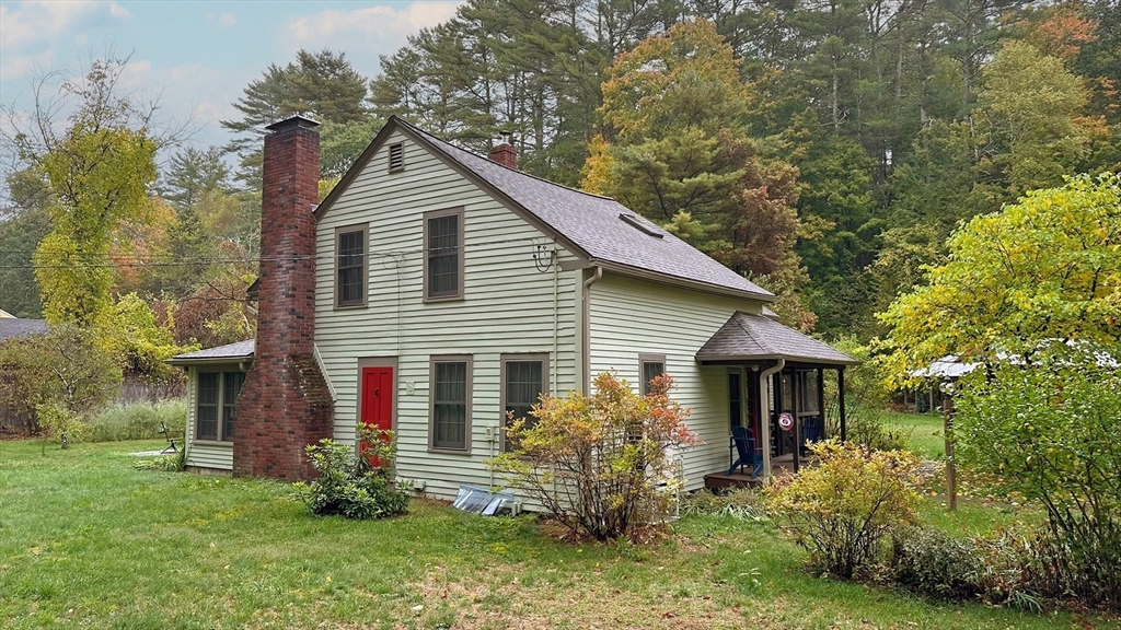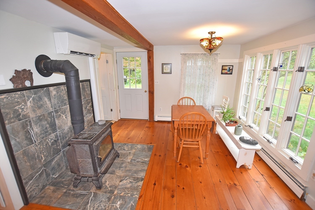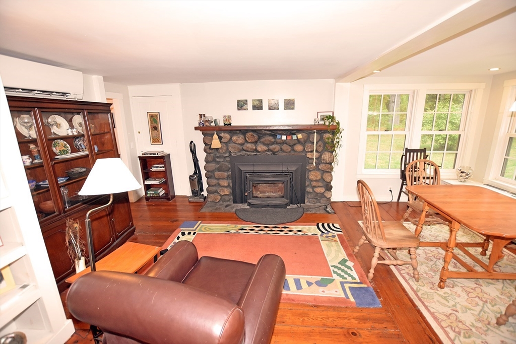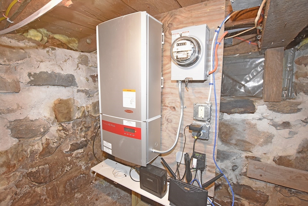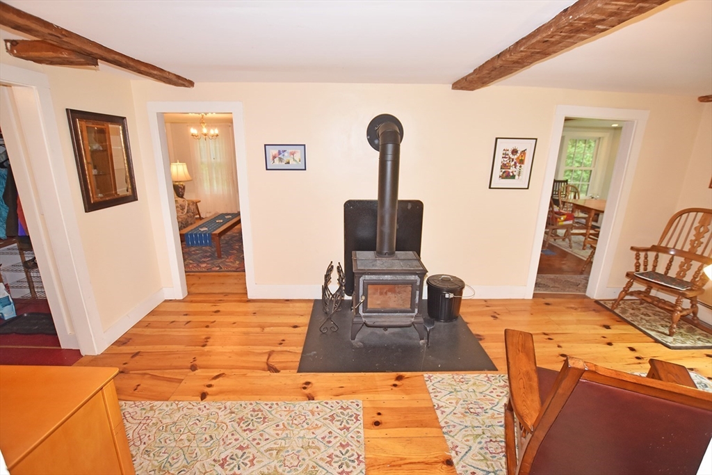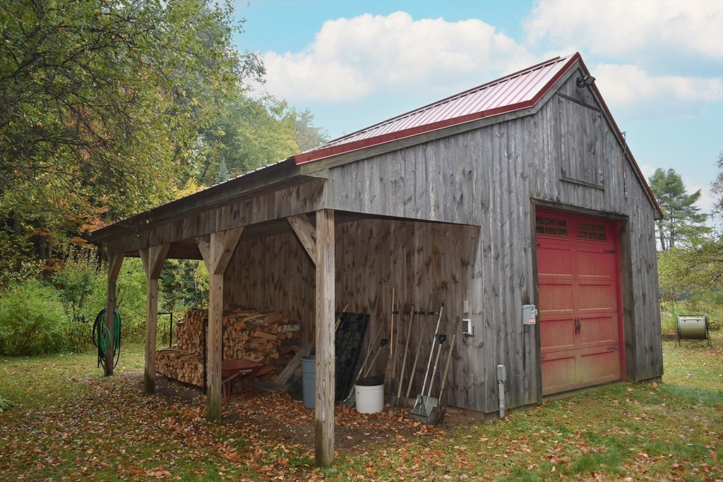 Antique warmth meets state of the art systems. The front of this house is a post and beam antique with a beautiful stone fireplace that has a recent wood insert, sitting room, Living room and dining room with two bedrooms and a bath upstairs. The framed addition in rear has a modern kitchen and bath and master bedroom upstairs. Both baths have been recently updated as has the kitchen. Very recent post and beam garage has storage and solar panels on roof that supplement panels placed at edge of field earlier. Basement has newer Buderus boiler, hybrid hot water heater and a battery storage system to supply the house when power goes out that has its own subpanel to critical house services like heat, water, fridge and lights. Screened porch off the kitchen is mahogany, patio outside dining room is Goshen Stone. Two more outbuildings have potential for horses and guest cottage. Meadow of over an acre is an opportunity for equestrian use. Swift River reservation land is across the street.