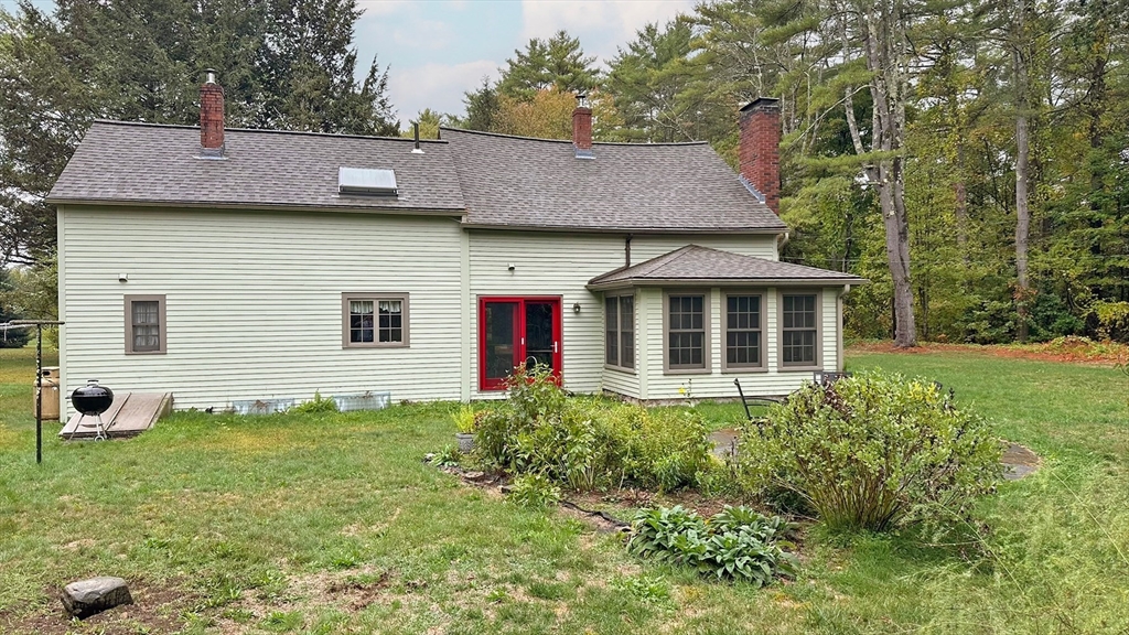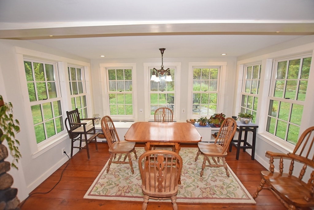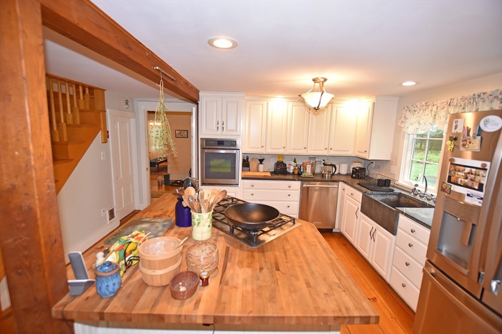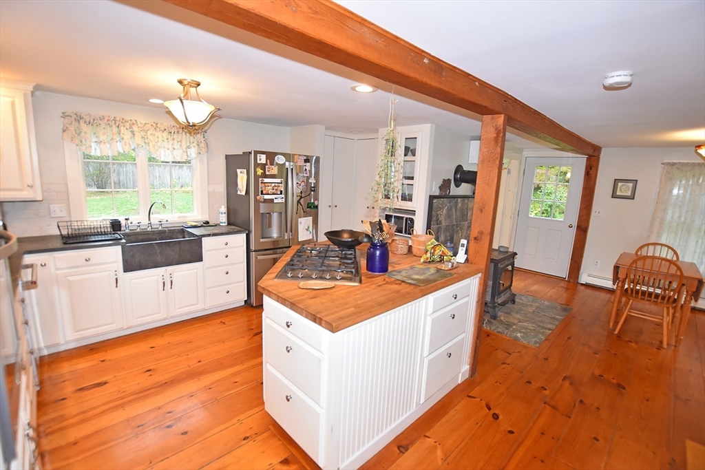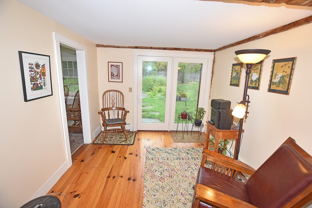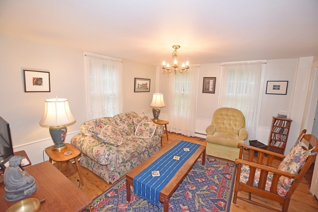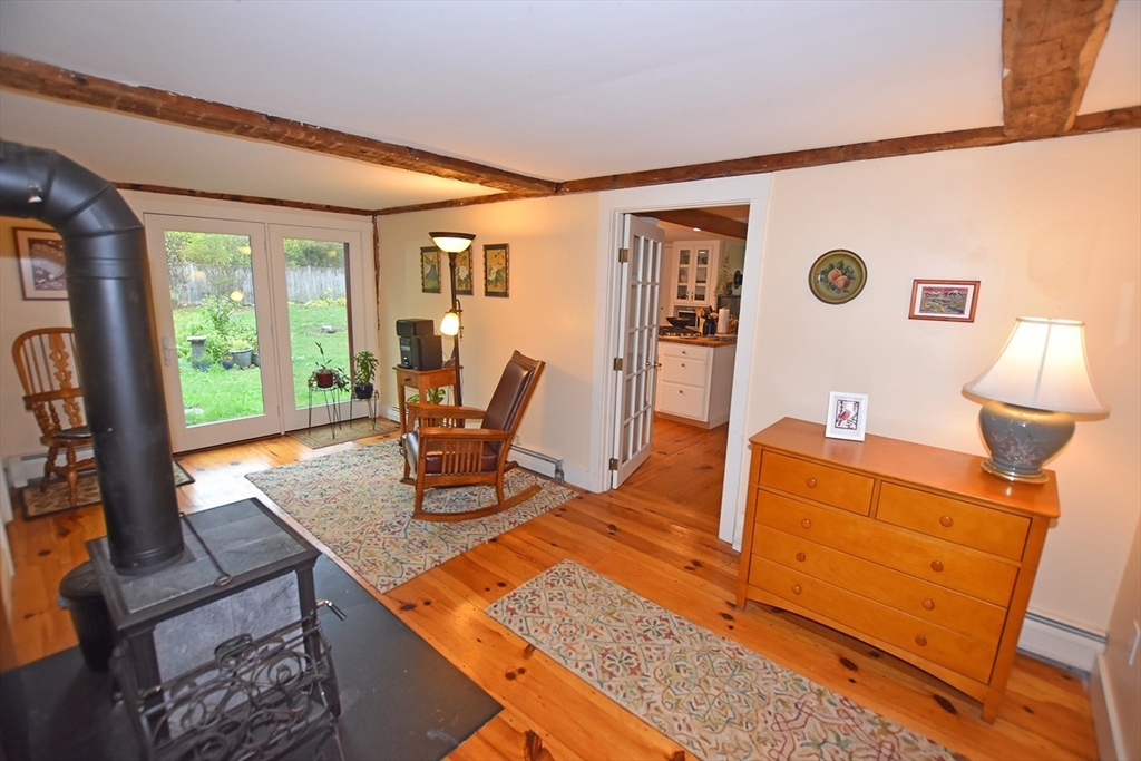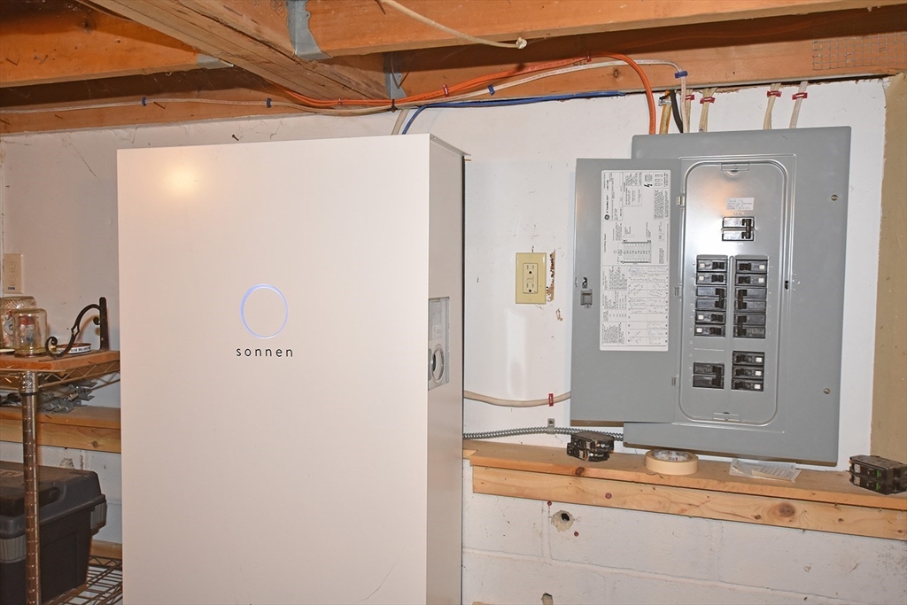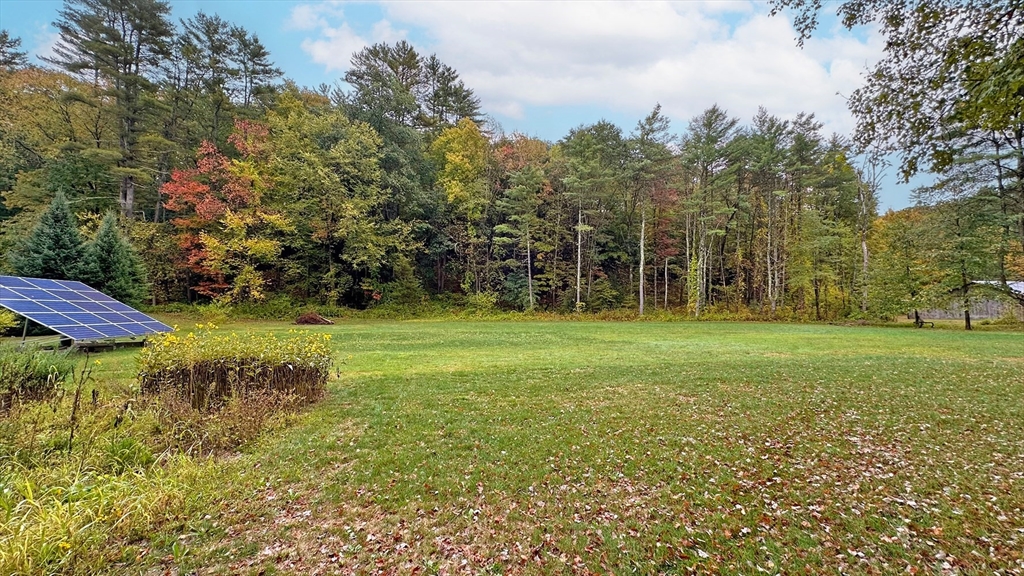 Antique warmth meets state of the art systems. The front of this house is a post and beam antique with a beautiful stone fireplace that has a recent wood insert, sitting room, Living room and dining room with two bedrooms and a bath upstairs. The framed addition in rear has a modern kitchen and bath and master bedroom upstairs. Both baths have been recently updated as has the kitchen. Very recent post and beam garage has storage and solar panels on roof that supplement panels placed at edge of field earlier. Basement has newer Buderus boiler, hybrid hot water heater and a battery storage system to supply the house when power goes out that has its own subpanel to critical house services like heat, water, fridge and lights. Screened porch off the kitchen is mahogany, patio outside dining room is Goshen Stone. Two more outbuildings have potential for horses and guest cottage. Meadow of over an acre is an opportunity for equestrian use. Swift River reservation land is across the street.