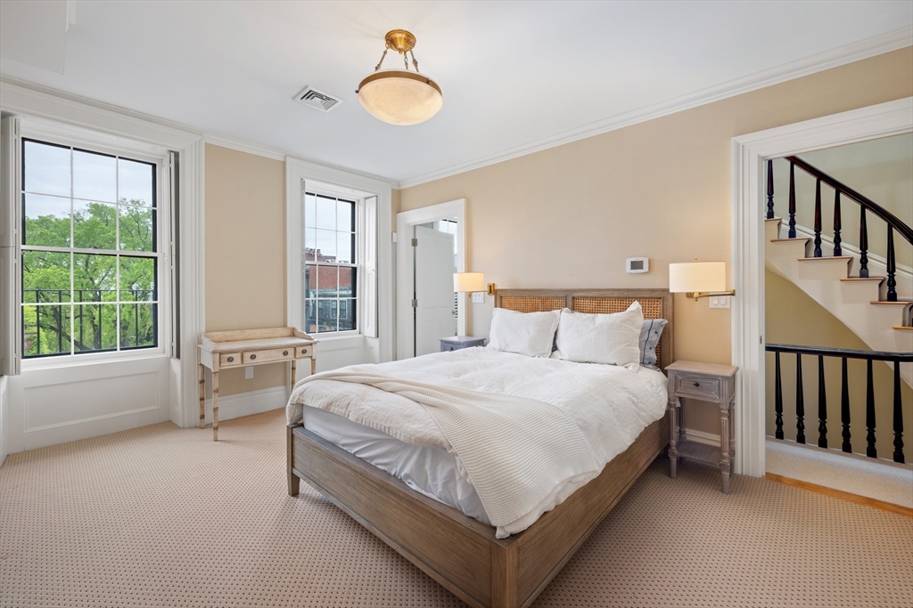 Grand and wide South Slope single family townhouse with elevator to every floor! This gracious ultra wide Beacon Hill home has been fully renovated and upgraded with many recent capital improvements to systems and structure. Offering 5+ bedrooms, 4 full and 2 half baths, this wonderful home has an excellent scale with enormous floor to ceiling windows, soaring ceiling heights on every floor, a level and wide staircase and a large elevator. A parlor level eat in kitchen has ample storage, top-of-the-line appliances and access to a deck and an enclosed garden. Opposite the eat-in kitchen is a large formal dining room with views of Walnut St and a fireplace. A grand "Piano Nobile" is ideal for entertaining with its enormous scale, oversized windows and gas fireplace. A primary suite has ample closet space and an attached marble bath. 4 guest suites share 3 full baths and a full staircase leads to a captivating roof top deck with sensational views of Boston and The Charles River!