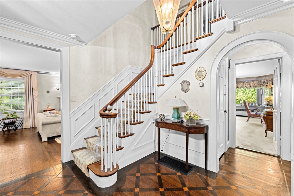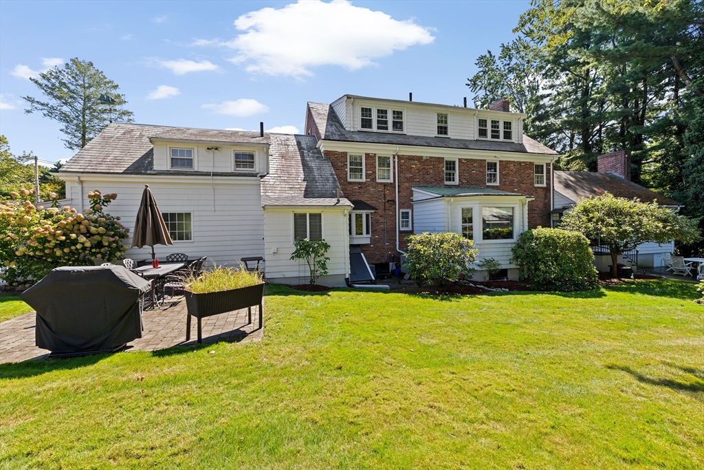 Stately center entrance Colonial Revival perfectly situated on a corner lot beside Braeburn Country Club. This stunning 4,280sf residence blends classic charm with modern updates. The gracious foyer opens to a spacious fireplaced living room, formal dining room, private office, & a family room with soaring beamed ceilings & a dramatic stone fireplace, ideal for relaxing or entertaining. The updated kitchen offers both style and function. Step outside to a secluded, manicured rear yard, your own private oasis, offering 2 spacious patios & a custom-built playhouse/shed that will delight children and adults alike. Elegant details abound throughout, from rich hardwood floors to timeless moldings, making this home a one-of-a-kind offering in a coveted neighborhood. Experience refined living in a grand home close school, Waban village, T station and easy access to Boston via the Mass Pike or Rte 9.
