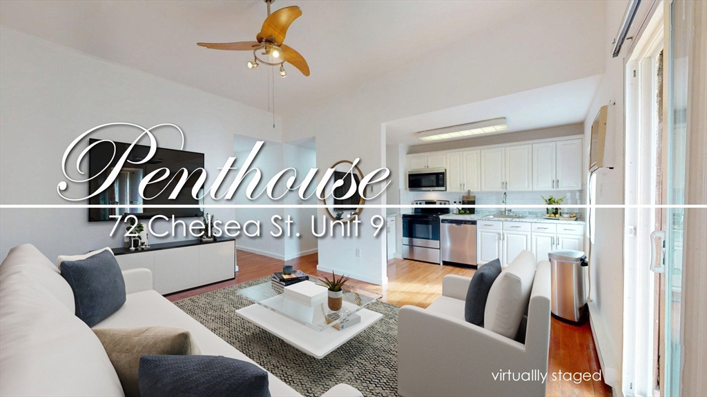 Penthouse 2-bedroom, 1-bath condo in East Boston’s sought-after neighborhood four minute walk to Maverick Sq, this bright and airy top-floor unit features an open-concept layout with hardwood floors, high ceilings, and abundant natural light. The updated kitchen with stainless steel appliances, white cabinets, flowing seamlessly into the spacious living room—perfect for entertaining. Bedrooms are a good size with ample closet space. Primary bedroom has a walk-in closet. Gorgeously renovated bathroom. Enjoy modern touches like recessed lighting, and a private balcony. Just minutes from MBTA station, the waterfront, parks, and East Boston’s vibrant dining scene. A rare opportunity to own a stylish, move-in ready home in one of Boston’s most desirable neighborhoods!
