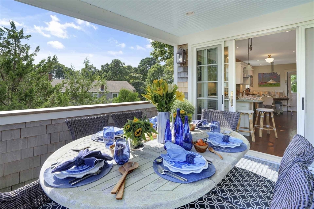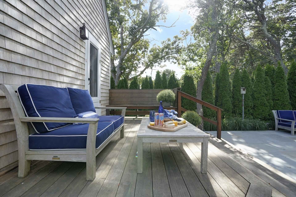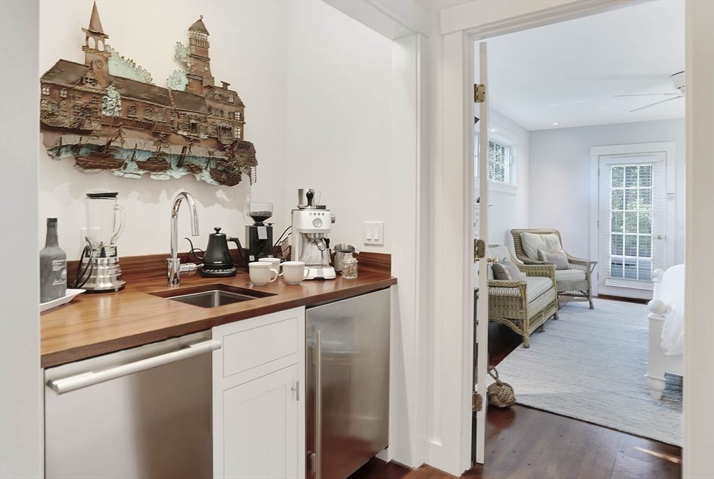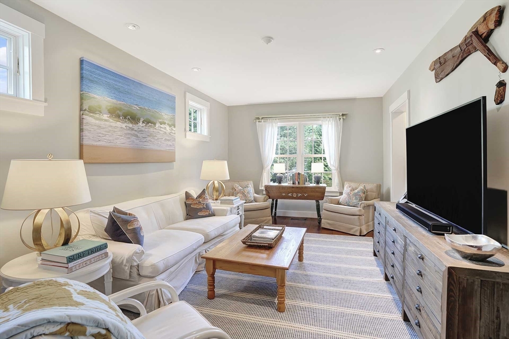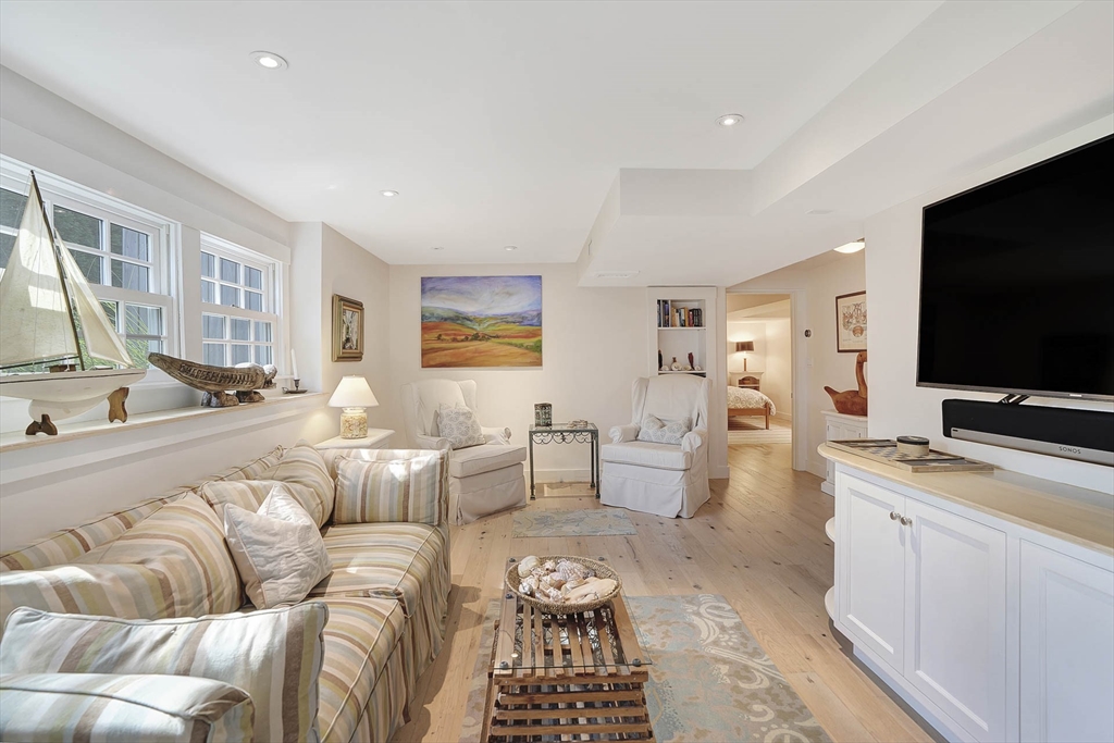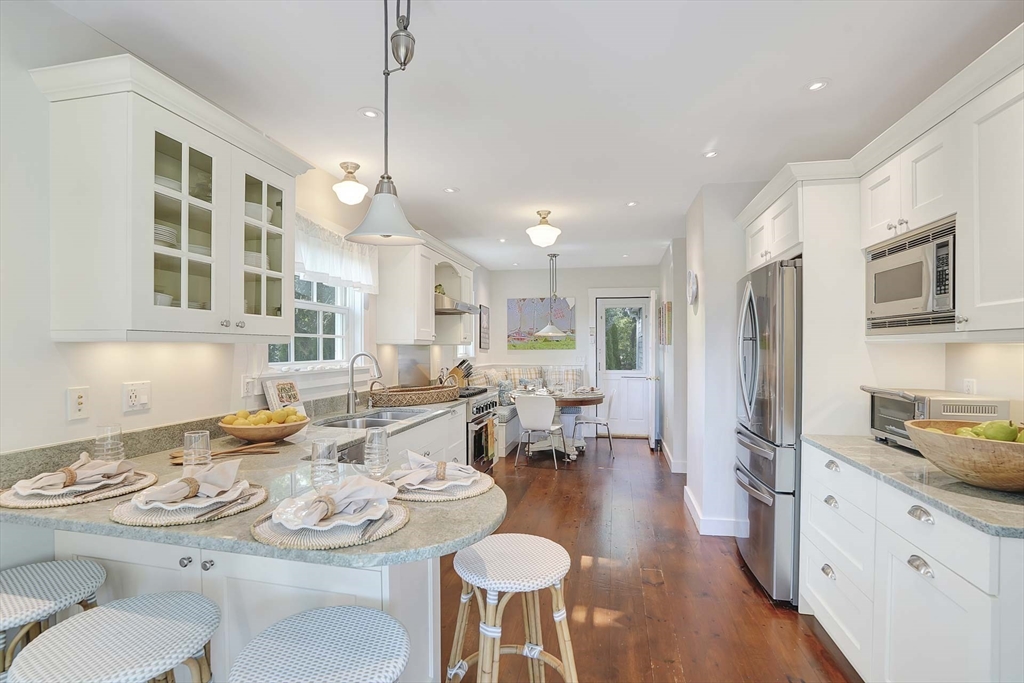 Nestled just a short stroll from all the best of Edgartown Village, this beautifully renovated retreat offers the ideal balance of Vineyard charm and modern convenience. Designed across three levels of living spaces, the home provides a flexible layout that works beautifully for entertaining, relaxing, or hosting guests. The main floor welcomes you with an inviting living room and a custom bar area. The covered porch offers a perfect spot for enjoying al fresco summer dining and relaxation. A sun-filled eat-in kitchen features a Viking gas range, granite countertops with a hint of sea glass green. The primary bedroom offers private access to the pool terrace. On the second floor, two well-sized bedrooms share a full bath, while the Lower Level offers additional space for gathering or guests, including a large lounge with media area, a bedroom and full bath, and a laundry room. Step outside to your private backyard oasis, where a heated 8x19 saltwater pool is framed by a stone terrace.