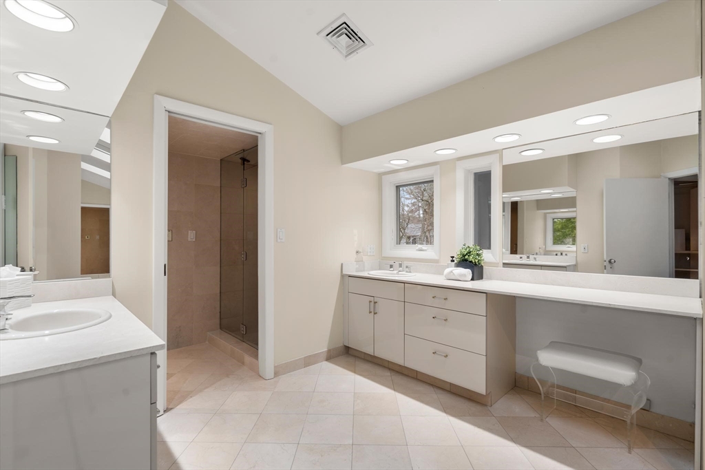 Welcome to this stunning, meticulously maintained South Side contemporary home offering nearly 6,000 square feet of luxurious living space! A dramatic two-story, granite foyer welcomes you to a multi-tiered living room with walls of glass, soaring vaulted ceilings and French doors leading to a patio providing picturesque views of your private yard and in-ground pool. The main floor also features an elegant dining room perfect for holiday gatherings, a chef’s kitchen, and a family room. Work in style in your own Oval Office, and enjoy the convenience of two powder rooms on this floor. The home boasts five generously sized bedrooms, two en suite, including the opulent primary suite with vaulted ceilings, two walk-in closets, and a private deck to enjoy your morning coffee. The spa-like primary bath with vaulted sky-lit ceiling offers double vanities and a sunken tub. The lower level is a retreat with an exercise room, playroom, additional family room, laundry room and plenty of storage!