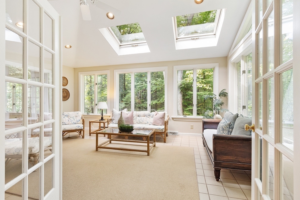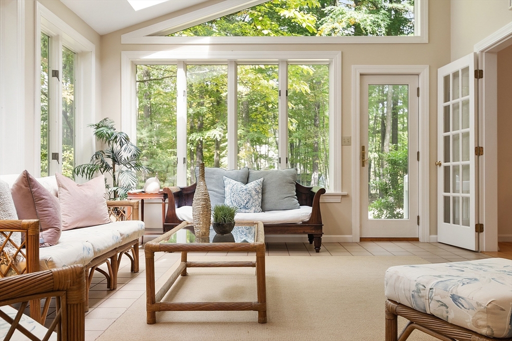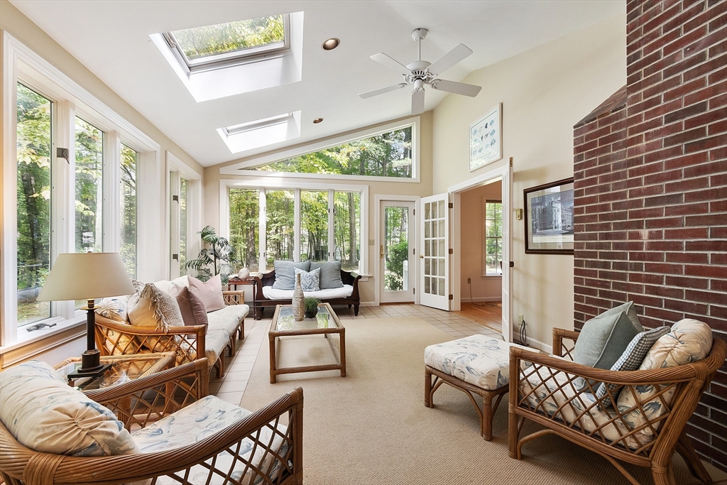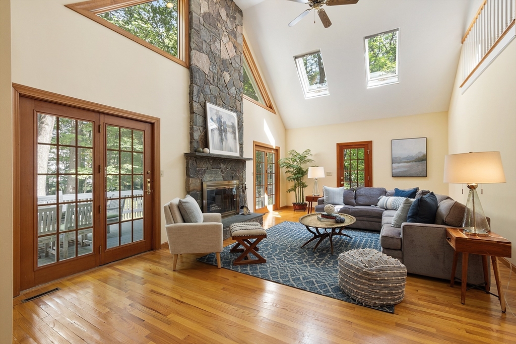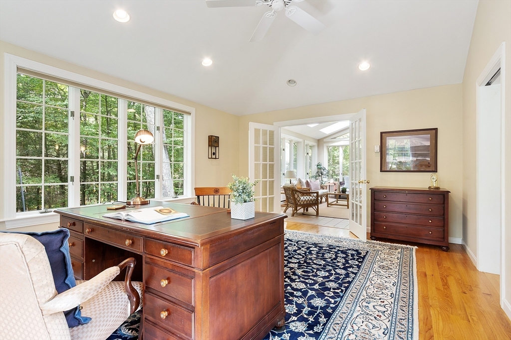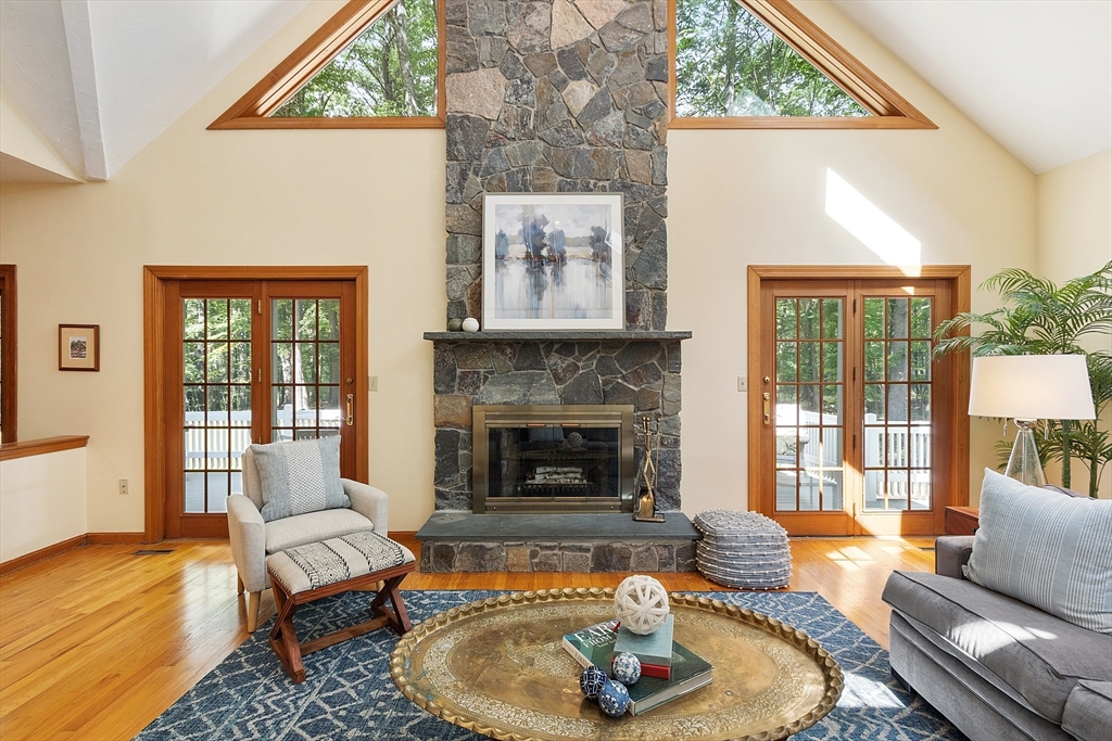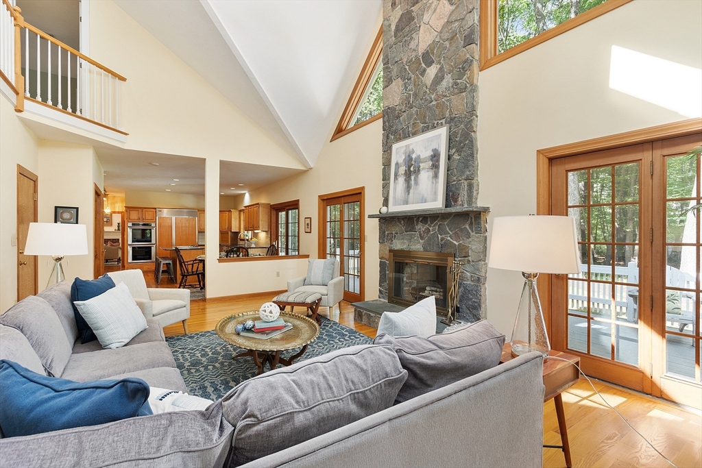 Privately sited at the end of a quiet cul-de-sac off sought-after Pope Road, this spectacular Colonial blends neighborhood charm with natural beauty, with nearby access to trails and conservation land. Sun-filled interiors include an expansive kitchen that opens seamlessly to the cathedral-ceiling family room with its dramatic fieldstone fireplace—the heart of the home. An elegant dining room, bright home office, and a window-filled sunroom provide versatile living spaces. Upstairs, the inviting primary suite offers a walk-in closet and a private sitting area overlooking the family room below, complemented by three additional bedrooms and a full bath. Outdoor living shines with an entertainment-ready deck and beautiful spacious yard with mature plantings, offering both privacy and a picturesque setting.