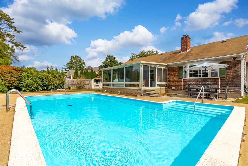 Welcome to this spacious 2,000+ sq ft Ranch style home featuring 3 bedrooms and 1.5 baths, nestled on a spacious fenced-in lot perfect for entertaining and relaxing. Step into a large living room complete with a cozy fireplace, custom built-ins with direct access to the sunroom overlooking the pool where you can unwind and enjoy the peaceful views allowing for a seamless indoor-outdoor connection. The heart of the home boasts a kitchen with custom cabinetry, gas countertop range, wet bar, and a convenient dining area, ideal for hosting guests or enjoying family meals. Enjoy spacious bedrooms with ample closet space, including a primary bedroom that connects to the shared full bath. Fenced yard and easy access to the laundry area with a shower stall, perfect for post-swim cleanup. Additional highlights include: 2 car garage, central air, gas heat & generator connection. All parties to verify the information contained herein.