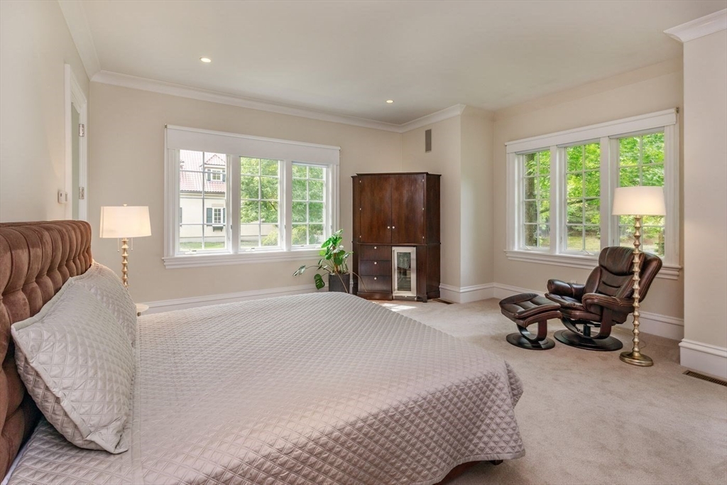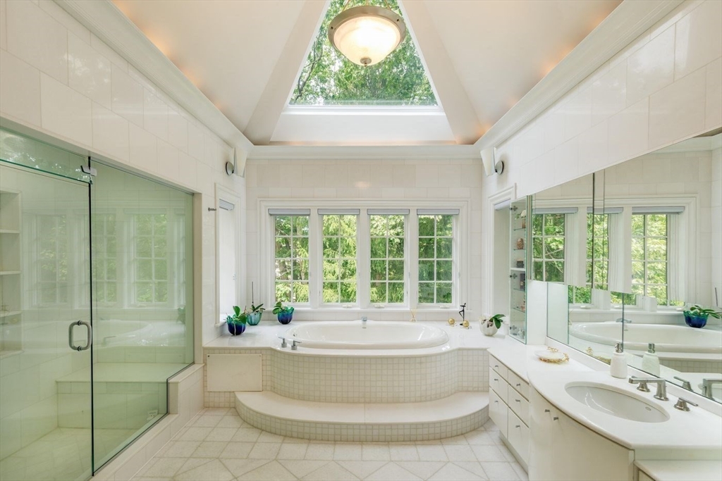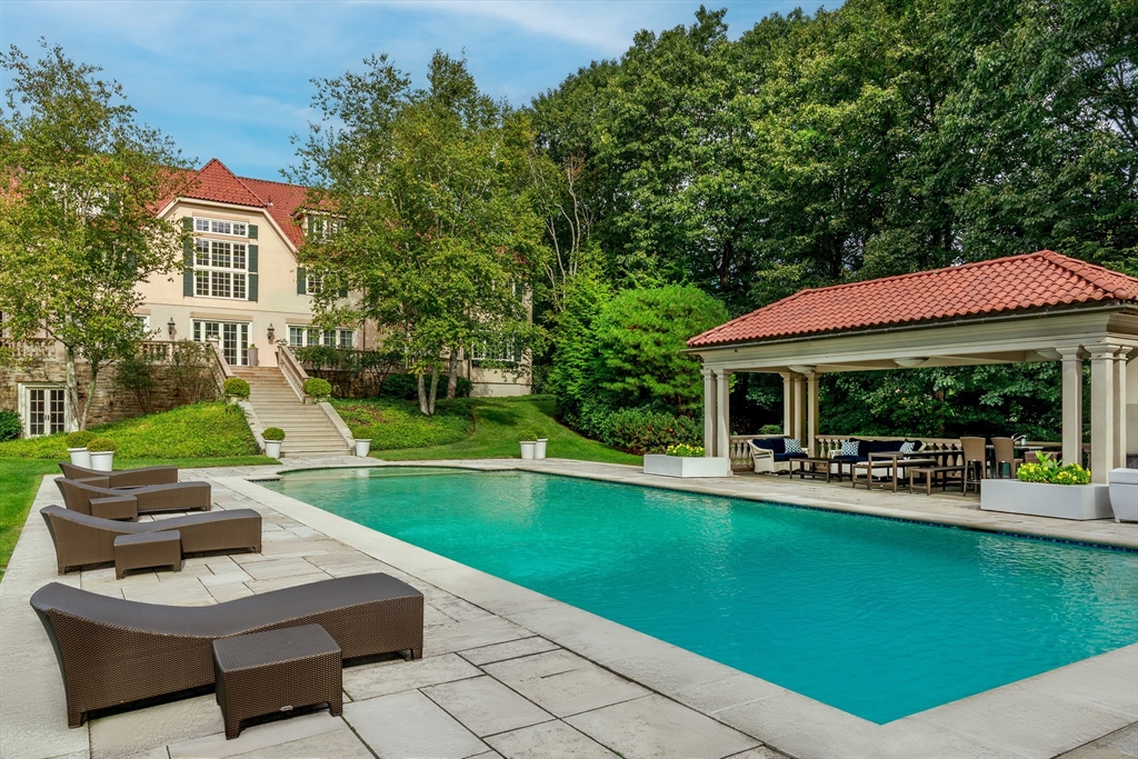 Located in the highly sought-after Stevens Farm neighborhood of Westwood, this gated estate is set on 3.48 acres of beautifully landscaped grounds and was designed by noted architect Patrick Ahearn. The foyer, with its dramatic three-story atrium, leads to French doors opening on a 70’ terrace overlooking a spectacular pool and cabana. Formal living and dining rooms flow seamlessly off the atrium. The striking new chef’s kitchen adjoins the family room, casual dining room, and a separate terrace. A mahogany-paneled study with lounge and wet bar is ideal for private conferences. The residence offers 8+ en-suite bedrooms, including a grand primary suite with dual baths and a 20’x25’ walk-in closet. Two guest suites provide flexibility, each with a private entrance. The lower level includes a gym, sauna, steam, changing rooms, playroom, theater, wine cellar, and billiard room. Close to Rte 128/95 and top-rated schools, this residence is perfect for everyday living and formal entertaining.