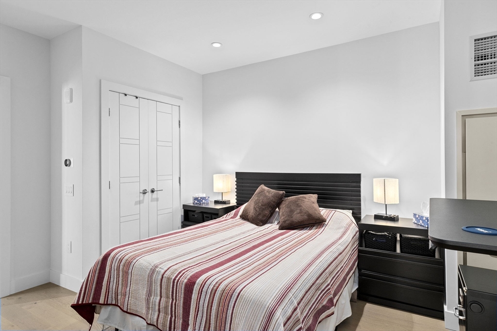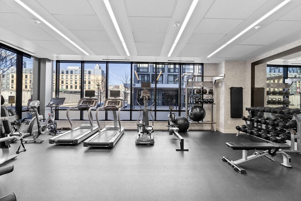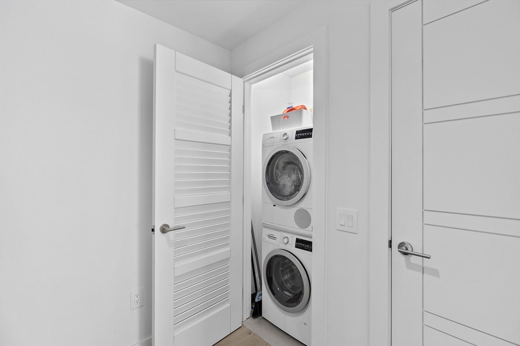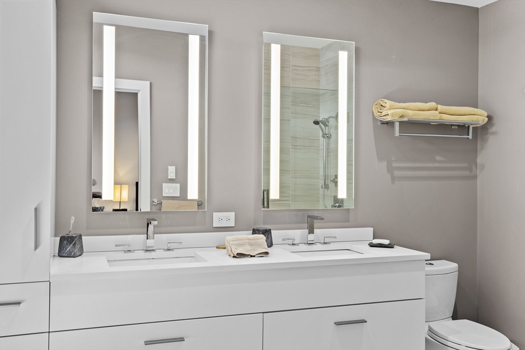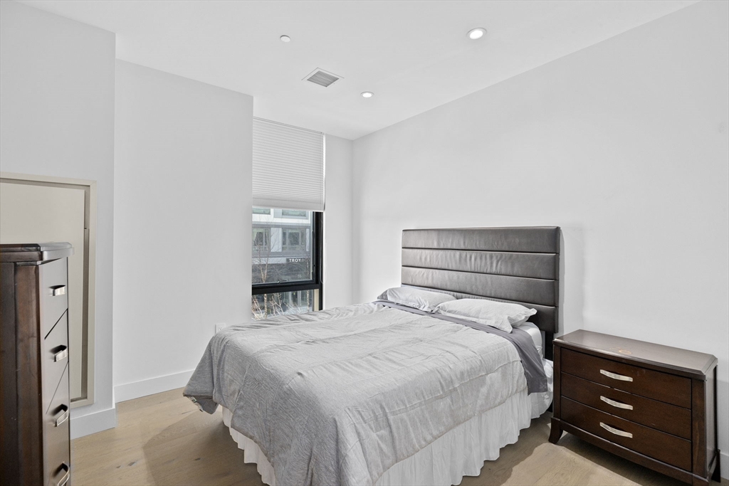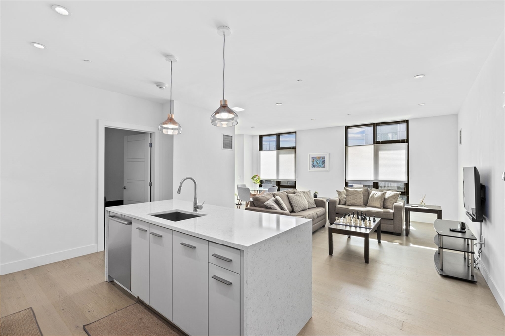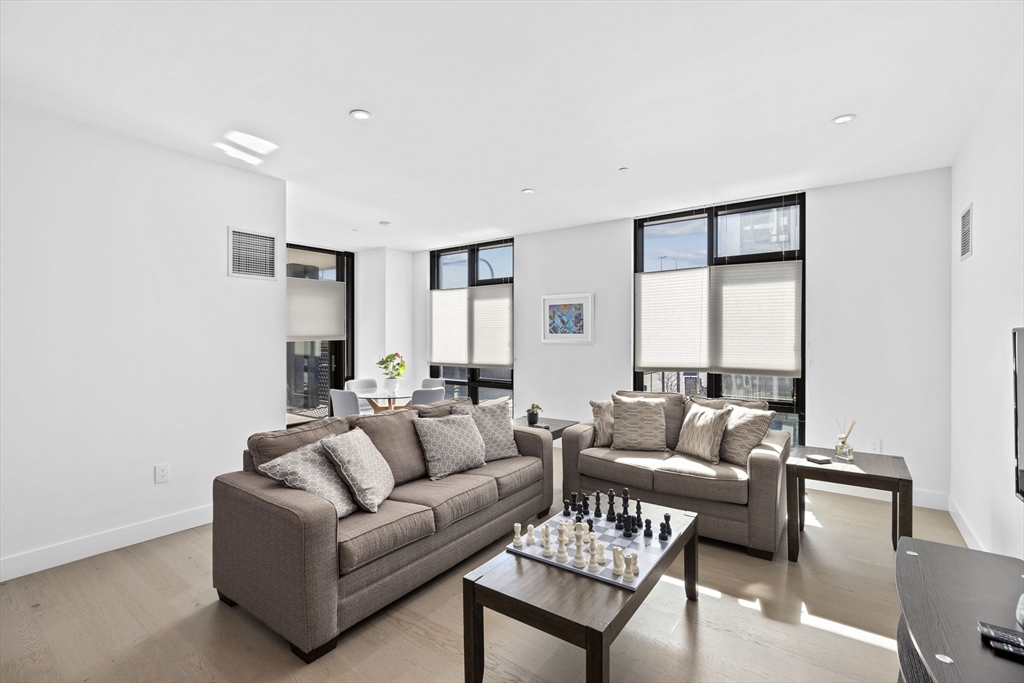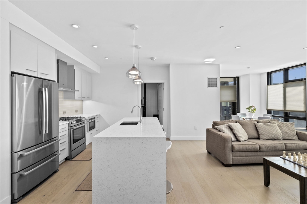 Siena-Ink Block desirable urban living neighborhood. Corner sun-filled unit boasts with high ceilings, floor to ceiling soundproofing windows - 2bd 2ba with contemporary fixtures. Offers a gorgeous open concept floor plan -living room, Premium appliance kitchen -gas 5 burner stove, sleek glass backsplash, quartz countertop, Center Island spacious to dine at with saddle stools Expansive sun filled entertaining space, dine area- leads to your private deck. Custom walk-in closets, soaking tub and glass enclosed shower bath are few amenities. Ample hall closets, elevator,24/7 concierge, bike storage, fitness center, clubroom on first level and rooftop sky lounge /roof deck with fireplace -entertain friends and family outdoor grills. Heated garage with EV charges #84 parking, heat, A/C, recessed and Lutron lights, custom blinds, pantry at entry, stack Bosch W/D. Walking neighborhood with Tatte, Whole Foods, Bar Mezzina many restaurants, I-90, 93 highways, amtrack nearby. Prof managed.