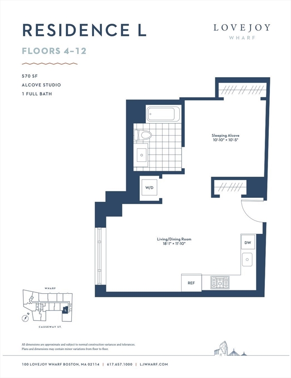 Elegant studio with separate sleeping alcove, full kitchen, and in-unit washer/dryer at Lovejoy Wharf — Boston’s premier luxury waterfront residence designed by Robert A.M. Stern. Residents enjoy over 2,000 sq. ft. of health and wellness amenities, striking architectural design, and a full suite of premier services. Ideally located just steps from Prince Street Park, surrounded by some of the city’s best restaurants, and offering effortless access to all major highways.