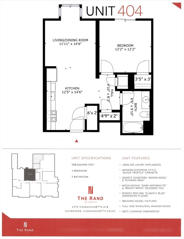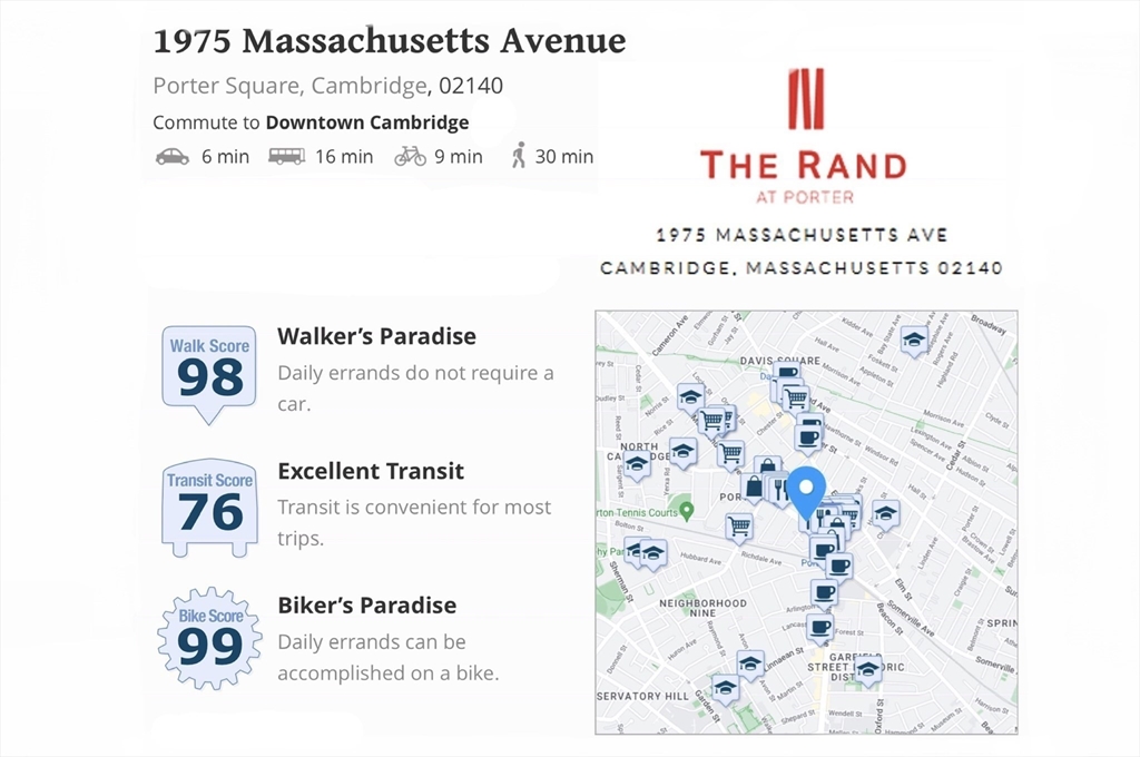 AVAILABLE NOW: 360 Virtual Tour Available! ---BEAUTIFUL ONE BEDROOM PH LEVEL on 4th Floor 1 ASSIGNED COVERED GARAGE & 1 ASSIGNED STORAGE & BIKE STORAGE! --- Completed in 2017 “THE RAND AT PORTER” Invoking the majestic history of the former Rand Estate in Porter Square. Elegantly designed new building with Modern & Timeless appeal. Located at 1975 MASSACHUSETTS AVENUE minutes from all the cultural Amenities, Restaurants & Shopping venues that make PORTER SQUARE one of the finest neighborhoods in Cambridge. CUSTOM EXTERIOR FINISHES of brick and metal panels frame OVERSIZED WINDOWS for the OPEN FLOOR PLAN on the upper three floors of the boutique building. ONLY 20 RESIDENTIAL UNITS with various layouts, designer finishes like Jenn Air appliances, Quartz Counters, NEST Thermostats, Custom Tile & Cabinetry. WASHER/DRYER In Unit. A sizable COMMON ROOF DECK makes a great amenity & place for people to mingle. Sleek Lobby, Elevator. ---3 Minutes to Porter Square T Red Line, Shops & Restaurant.