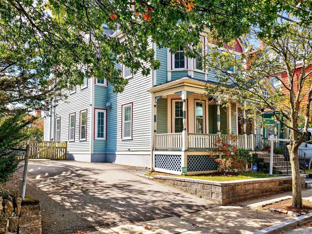 Nestled on a tree-lined street close to Jamaica Pond and Centre Street’s vibrant shops and restaurants, this 3-bed plus office, 2-bath home combines historic charm with modern ease. A private entry leads upstairs to a bright, flowing layout where the living room’s fireplace and bay windows create an inviting gathering space. The open dining area connects seamlessly to a spacious kitchen with ample storage and a central island—perfect for everyday meals or casual entertaining. Step out to your private deck for morning coffee or evening relaxation with views of the shared yard below. Upstairs, the primary suite is a true retreat with skylights, multiple closets, and a wood stove, while two additional bedrooms and a light-filled office offer flexibility. Central A/C, in-unit laundry, and two-car parking add everyday comfort. The large common yard with patio and garden space extends the lifestyle outdoors.