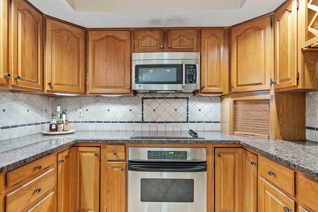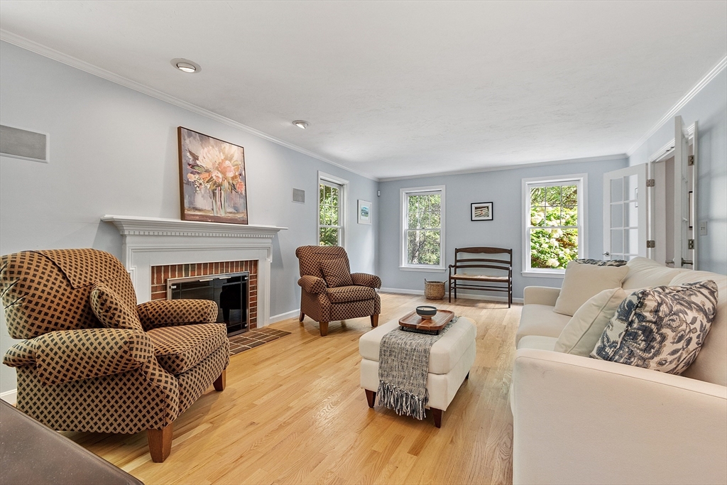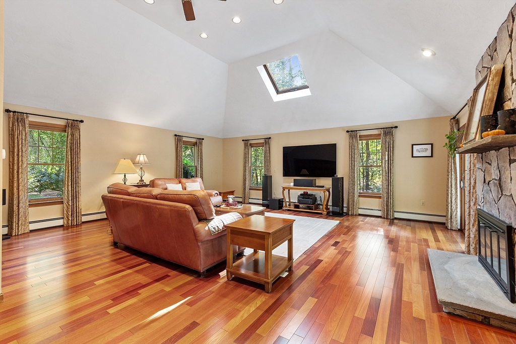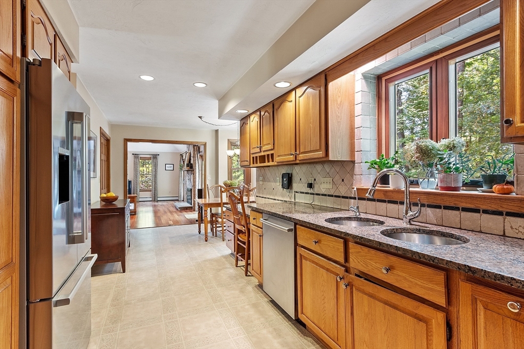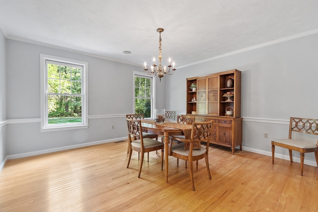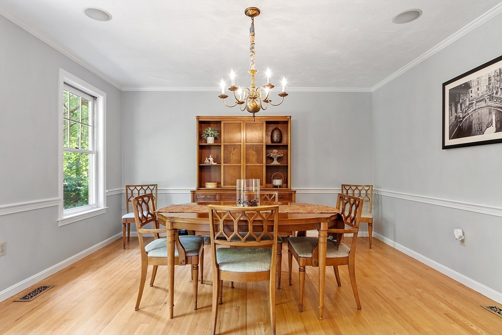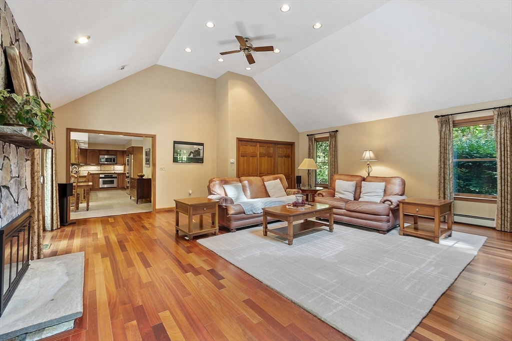 Welcome to this beautifully maintained home where comfort, thoughtful design, and location come together. The expansive family room features hardwood floors, a fieldstone wood-burning fireplace, and two sliders to an oversized deck—perfect for entertaining or quiet mornings. The efficient eat-in kitchen offers charm and convenience. The formal dining room with hardwood floors suits both casual meals and special occasions. A front-to-back living room includes French doors and a gas fireplace for added warmth. Upstairs, the cathedral-ceiling primary suite offers an updated ensuite bath and walk-in closet, plus three additional spacious bedrooms and a full bath. The partially finished walk-out lower level to a patio provides flexible space for an office, gym, or playroom. With proximity to the Harvard track and playground, this inviting home is ready to support your lifestyle inside and out.
