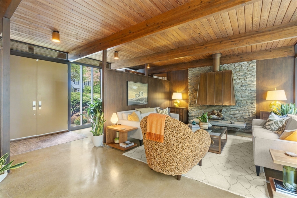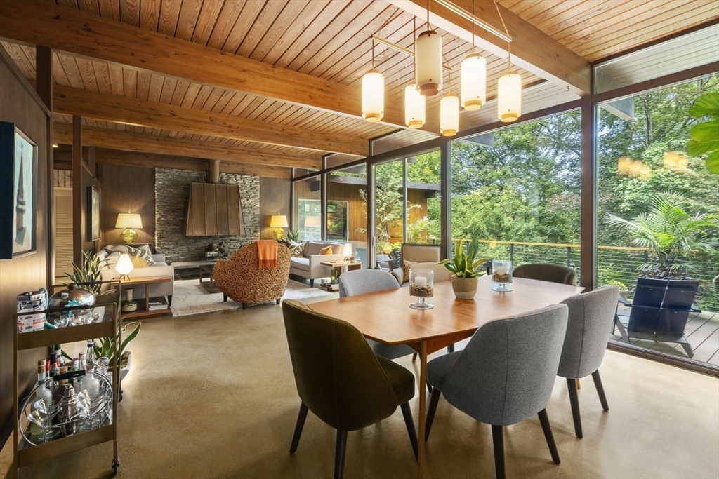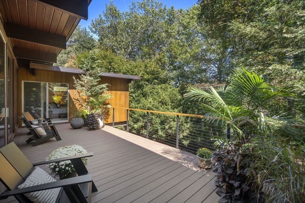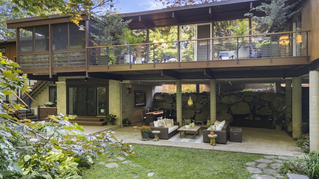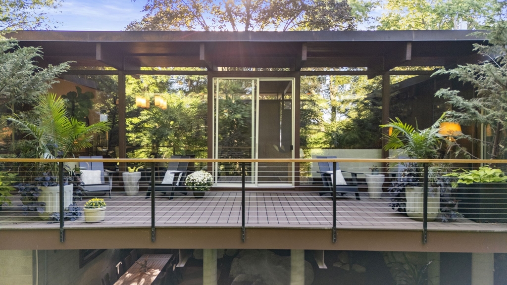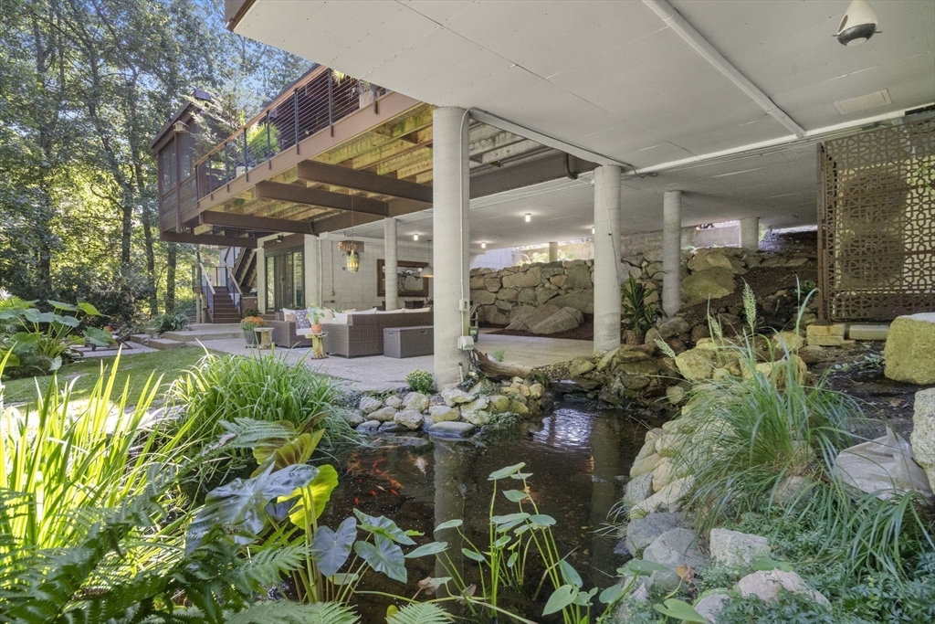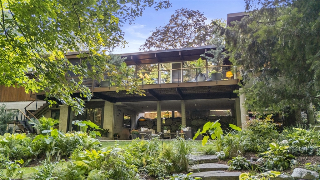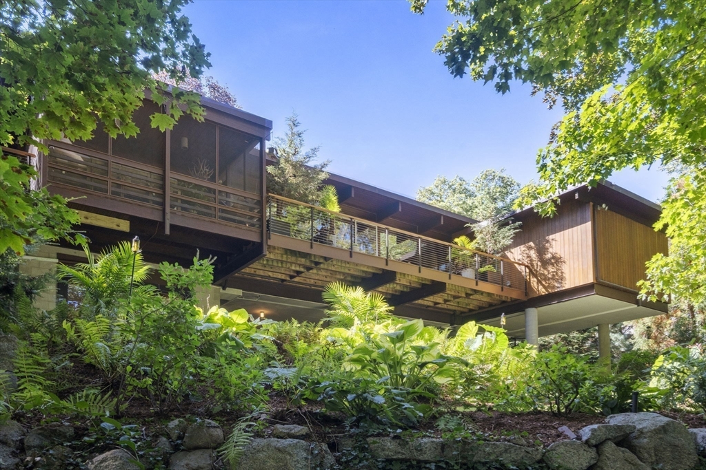 Iconic Mid-Century showstopper in desirable Melrose east side country club neighborhood located 15 minutes from Boston. This impressive, lovingly restored, 3 bed, 2 full, 2 half bath redwood deck house is the real deal built by a world-renowned architect resulting in a perfect floorplan that flows seamlessly throughout and embraces an indoor/outdoor lifestyle. A few features include a 30+ ft glass wall leading to an expansive deck with tree top views accessible from the living-dining,kitchen and primary suite, floating walnut panel walls, polished concrete radiant heated floors, and a double lot with hidden multi-tiered landscaped grounds worthy to call your own arboretum. There are several gathering spaces for every kind of entertaining including a one of a kind, grotto/covered patio w koi pond/water feature and a media fam room w wetbar that easily converts for guests. The home is complete with great storage, a gym and garage. This is sophisticated mid-century living at its finest.
