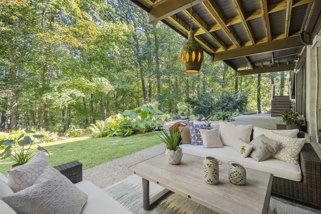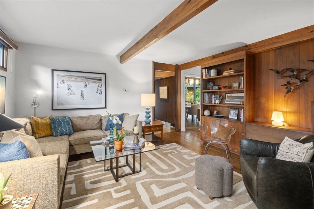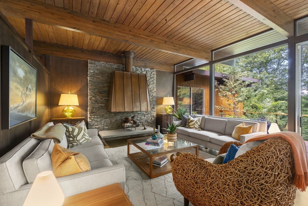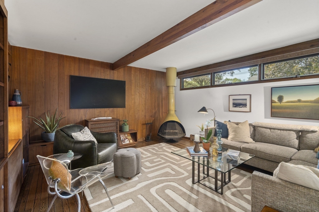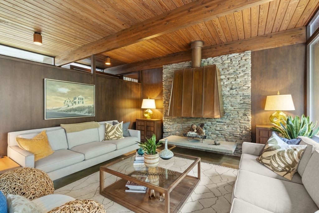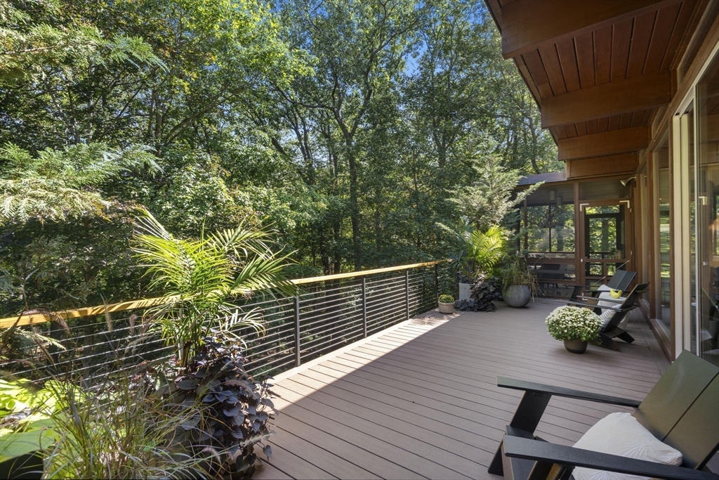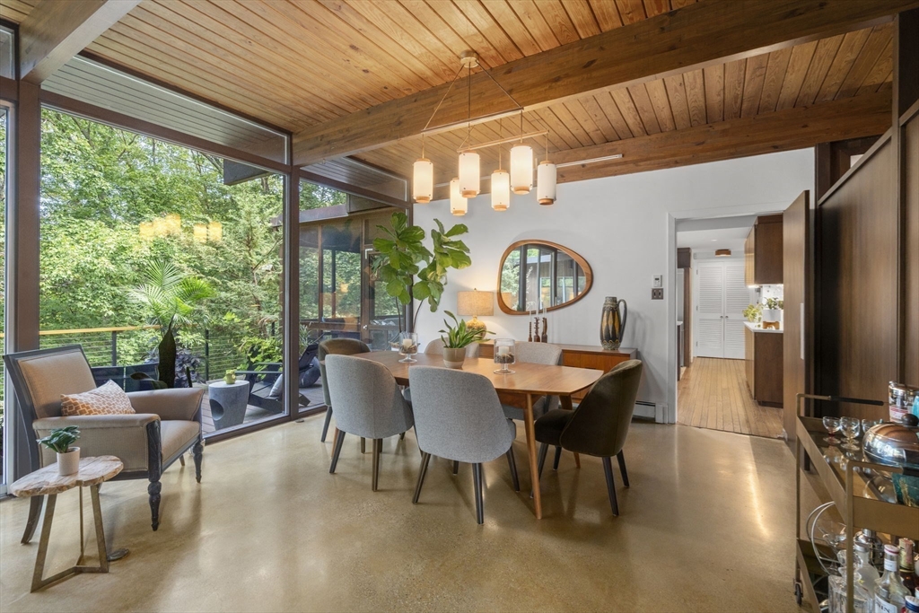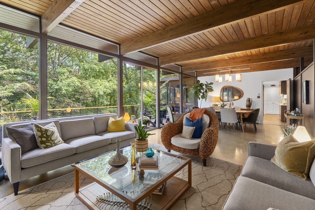 Iconic Mid-Century showstopper in desirable Melrose east side country club neighborhood located 15 minutes from Boston. This impressive, lovingly restored, 3 bed, 2 full, 2 half bath redwood deck house is the real deal built by a world-renowned architect resulting in a perfect floorplan that flows seamlessly throughout and embraces an indoor/outdoor lifestyle. A few features include a 30+ ft glass wall leading to an expansive deck with tree top views accessible from the living-dining,kitchen and primary suite, floating walnut panel walls, polished concrete radiant heated floors, and a double lot with hidden multi-tiered landscaped grounds worthy to call your own arboretum. There are several gathering spaces for every kind of entertaining including a one of a kind, grotto/covered patio w koi pond/water feature and a media fam room w wetbar that easily converts for guests. The home is complete with great storage, a gym and garage. This is sophisticated mid-century living at its finest.