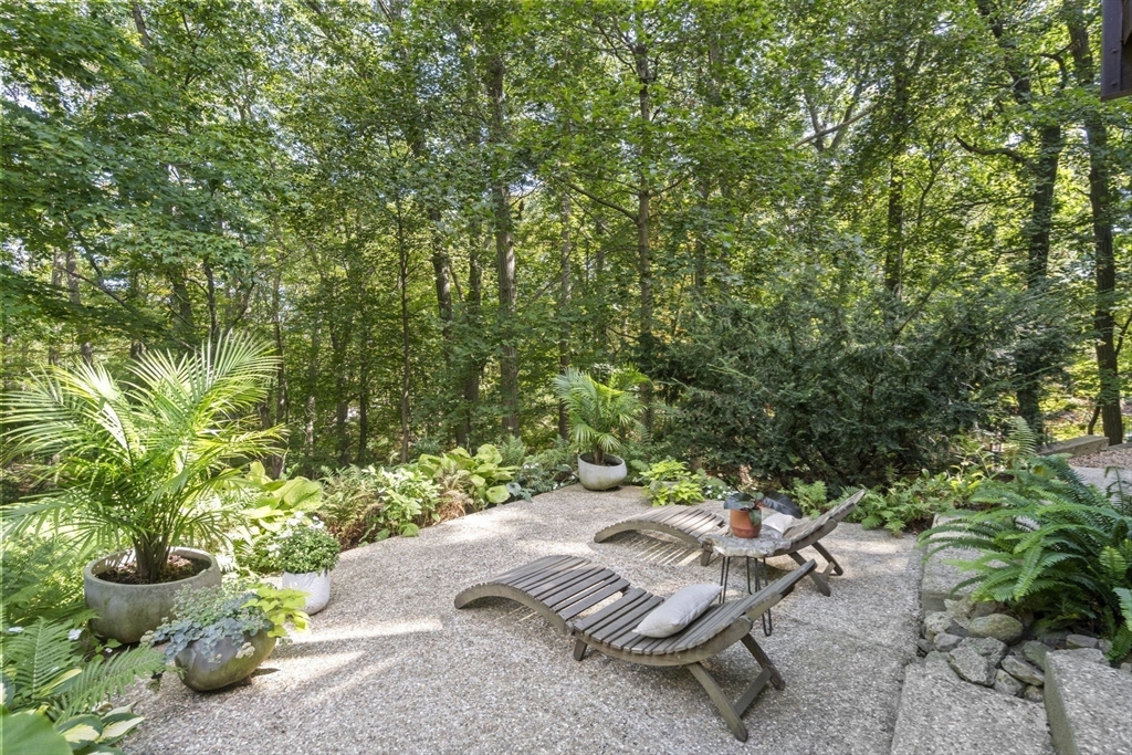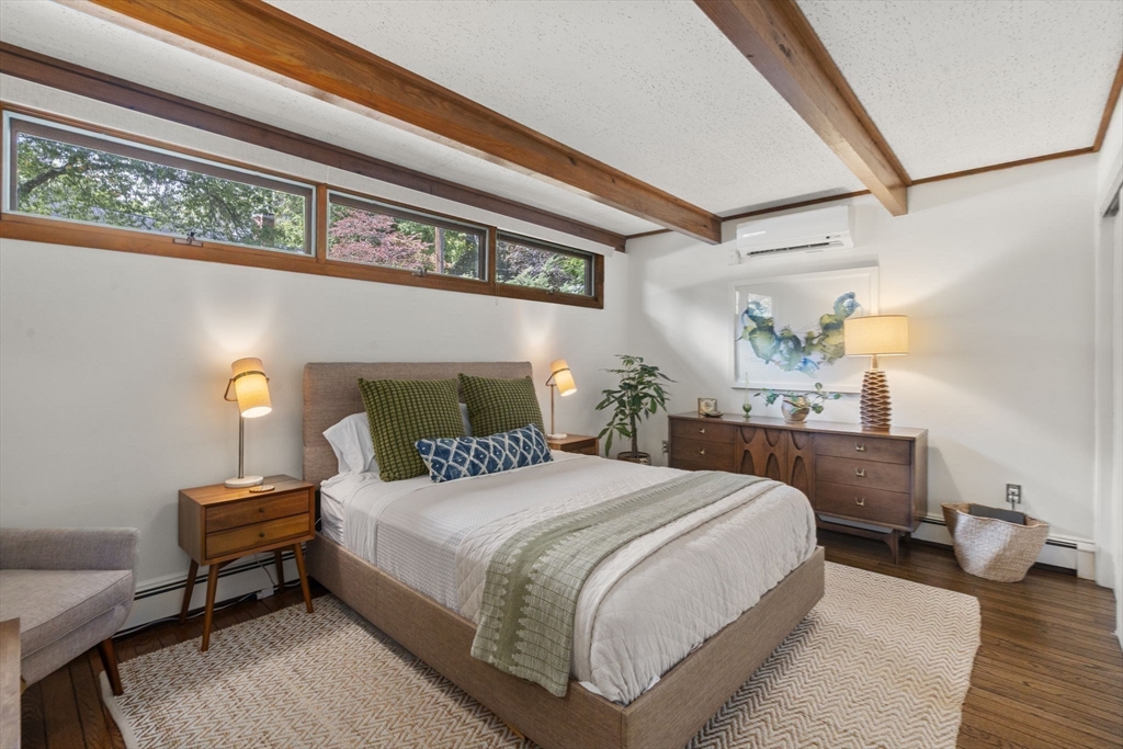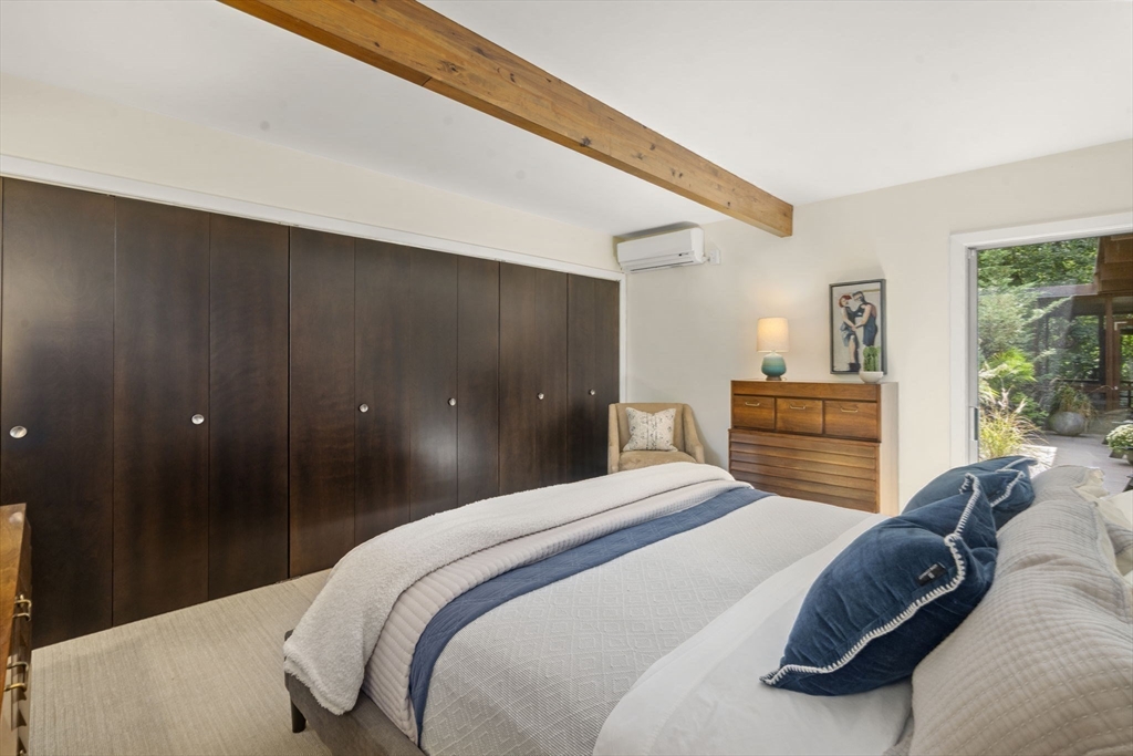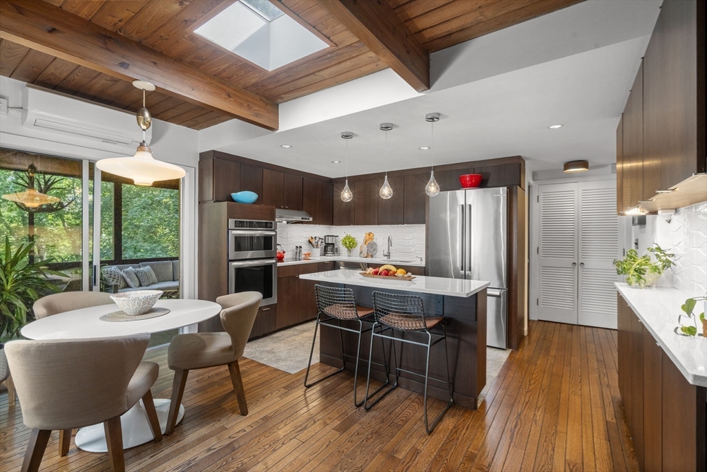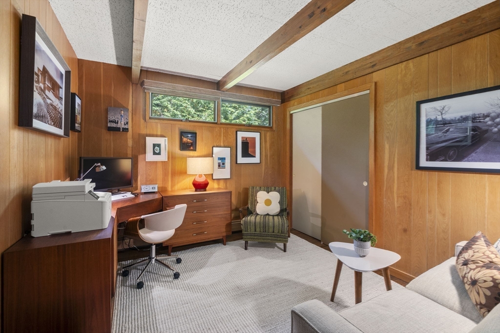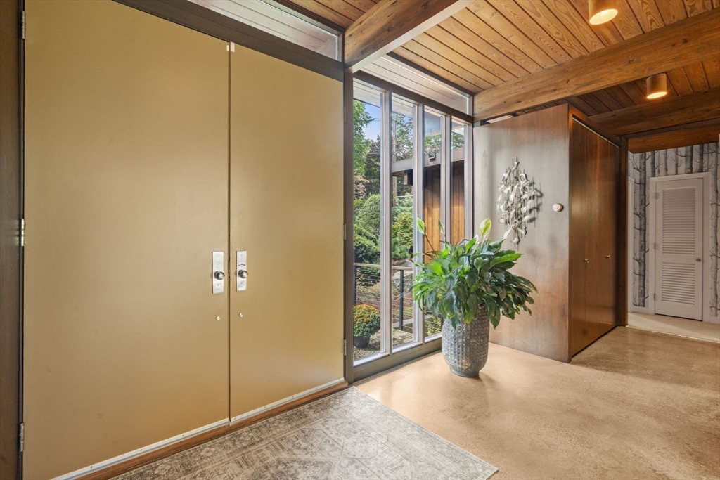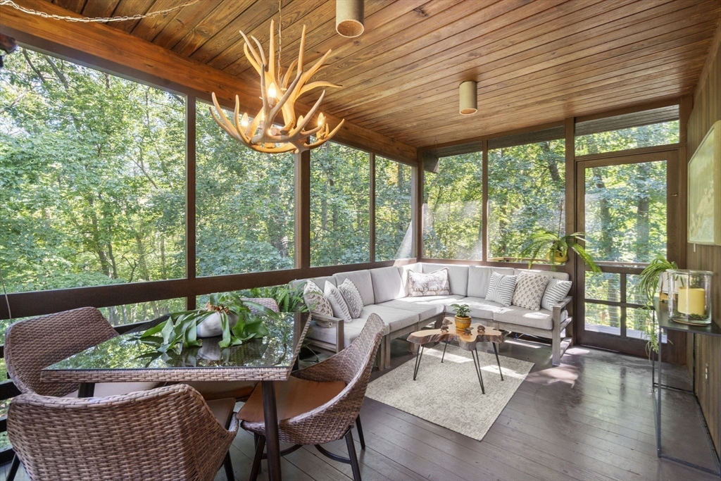 Iconic Mid-Century showstopper in desirable Melrose east side country club neighborhood located 15 minutes from Boston. This impressive, lovingly restored, 3 bed, 2 full, 2 half bath redwood deck house is the real deal built by a world-renowned architect resulting in a perfect floorplan that flows seamlessly throughout and embraces an indoor/outdoor lifestyle. A few features include a 30+ ft glass wall leading to an expansive deck with tree top views accessible from the living-dining,kitchen and primary suite, floating walnut panel walls, polished concrete radiant heated floors, and a double lot with hidden multi-tiered landscaped grounds worthy to call your own arboretum. There are several gathering spaces for every kind of entertaining including a one of a kind, grotto/covered patio w koi pond/water feature and a media fam room w wetbar that easily converts for guests. The home is complete with great storage, a gym and garage. This is sophisticated mid-century living at its finest.