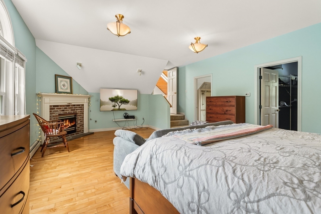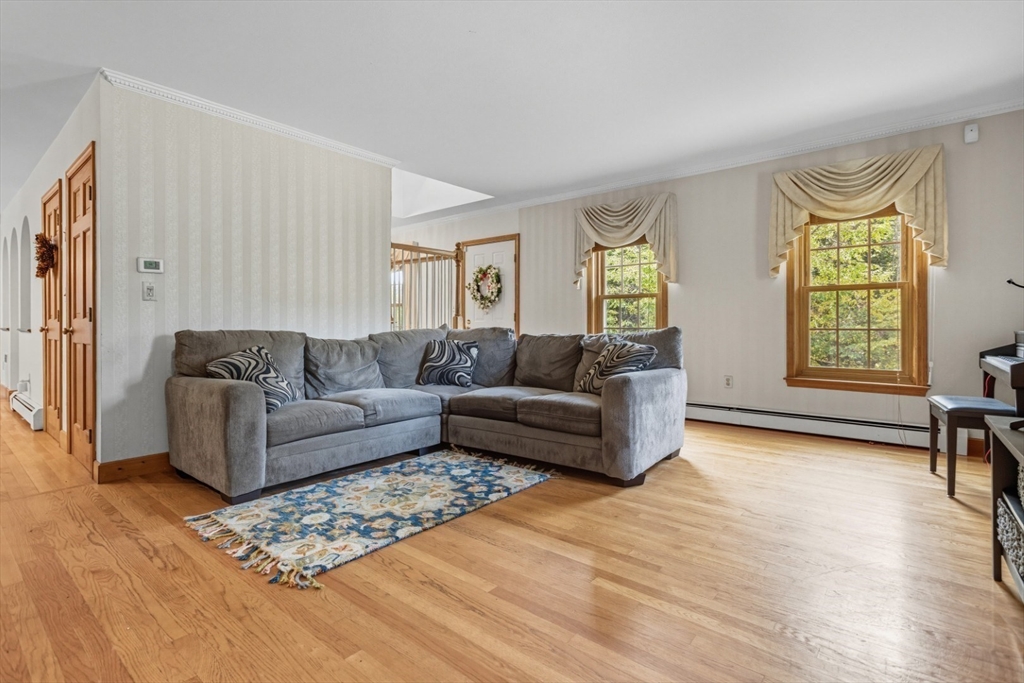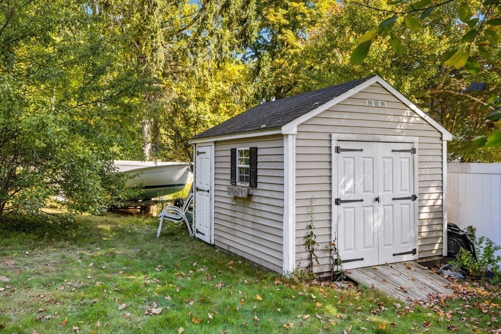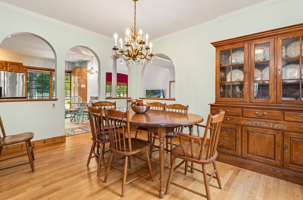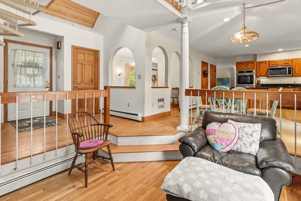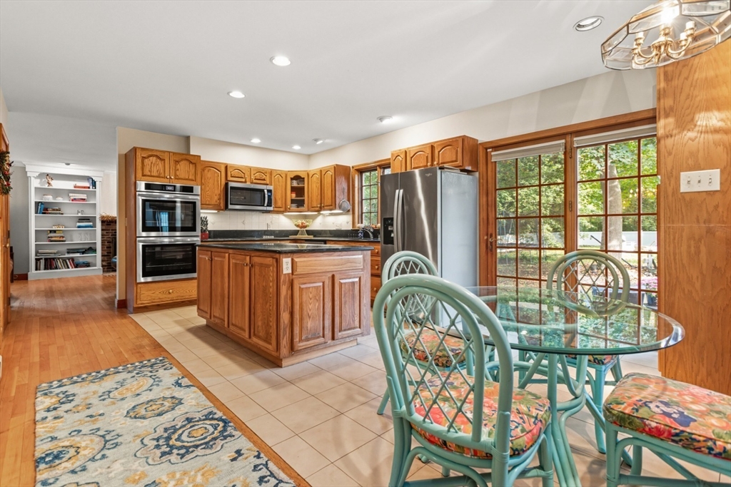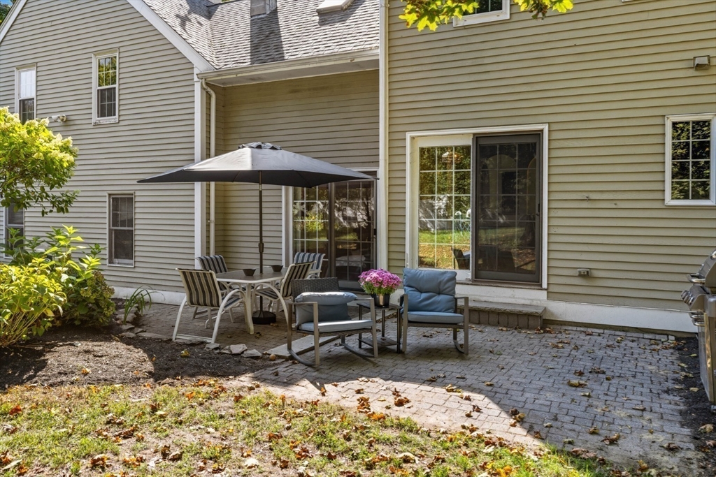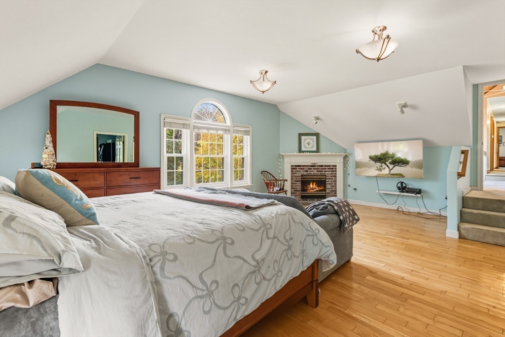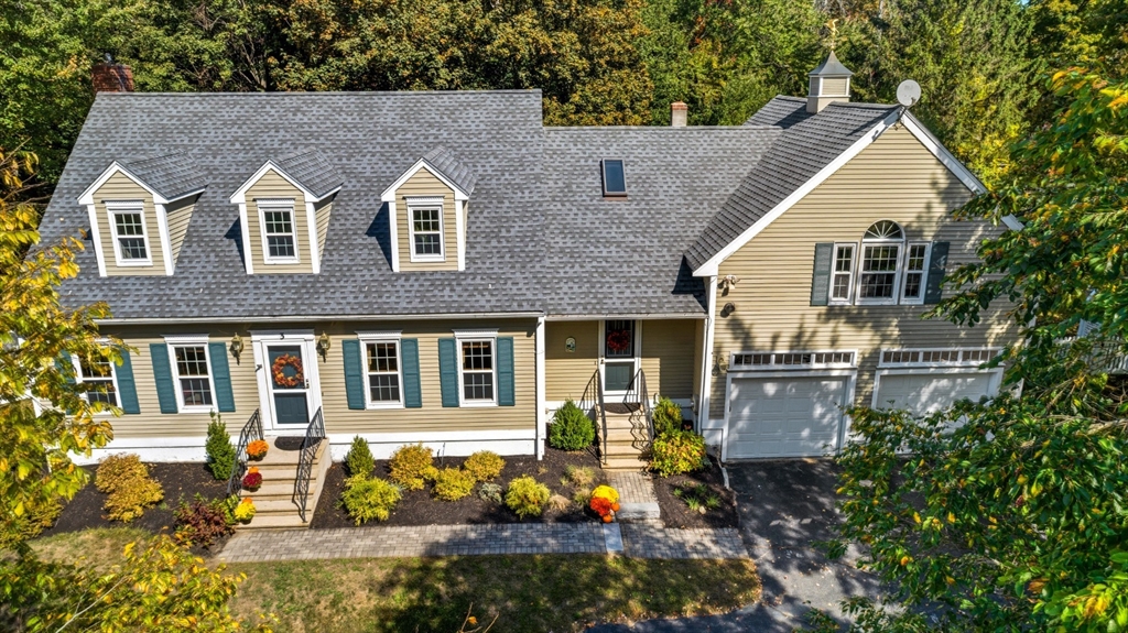 Your Private 4 bed/ 2.5 bath Oasis awaits in West Newbury. Unique Central Entrance dormered Cape on a quiet street. Newer stainless steel appliances in kitchen including a double oven with granite counter tops and center Island, a perfect gathering spot. Open concept sunken sitting area off the kitchen expands entertaining possibilities with doorways to the private backyard and Patio. Fenced in level yard with storage shed and fruit trees. Kitchen is just off elegant dining room and spacious living room that boast propane fire place and twin built in bookcases.Hardwood floors thru-out the first floor. The four spacious bedrooms upstairs includes a secluded master suite, master bath, and its own propane fireplace. Radiant heat in Master Bath floor and kitchen.Convenient Upstairs Laundry. Oversized two car garage parking. Back-up Generator.Partially finished basement. Close to town center, schools, tons of trails that West Newbury has to offer and the Merrimack River.