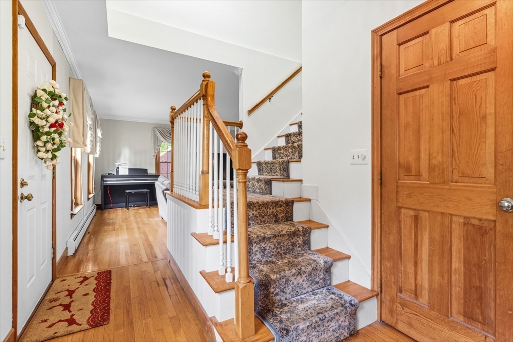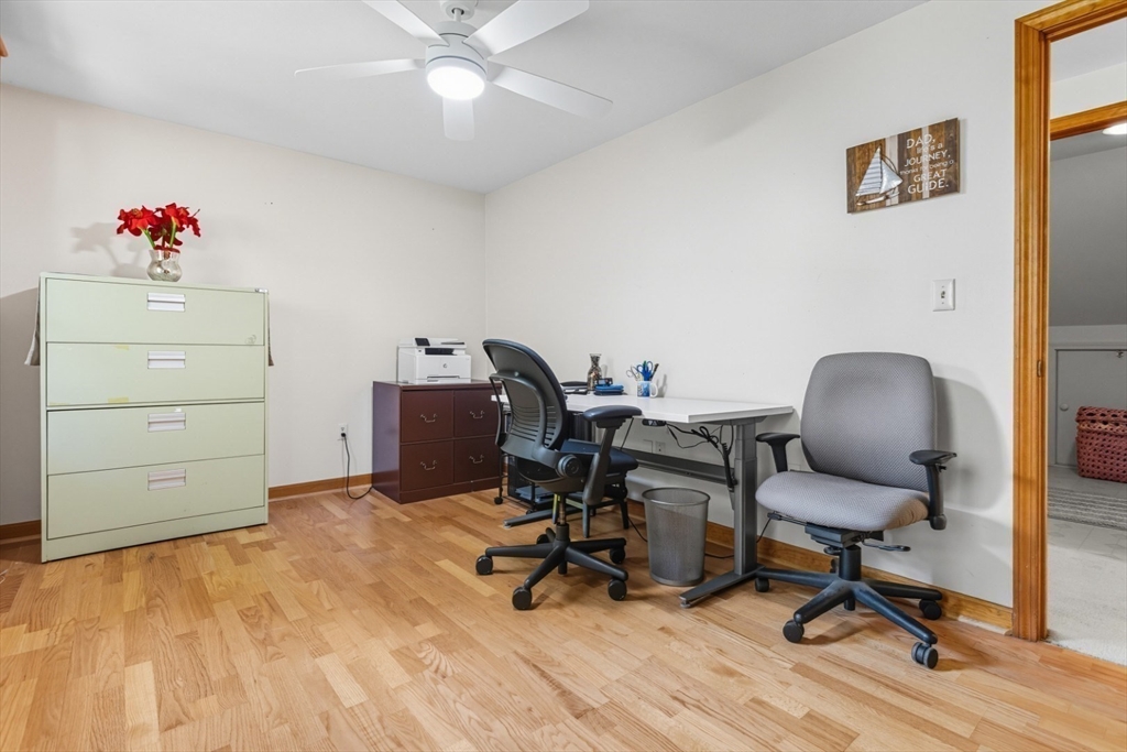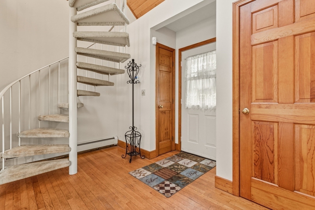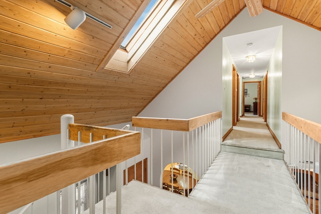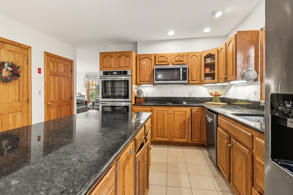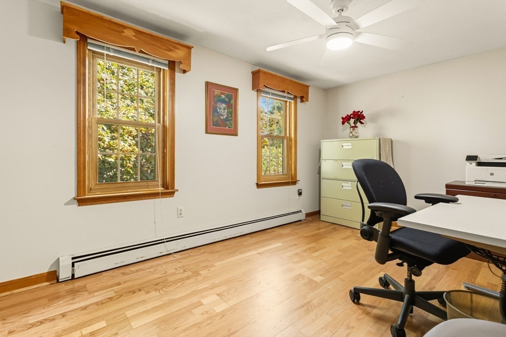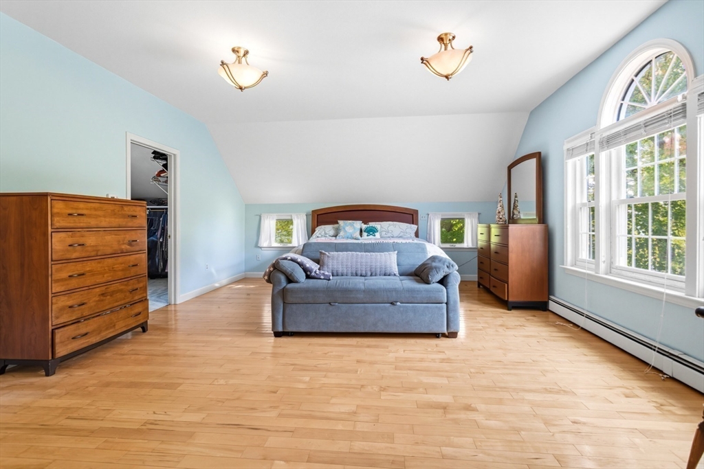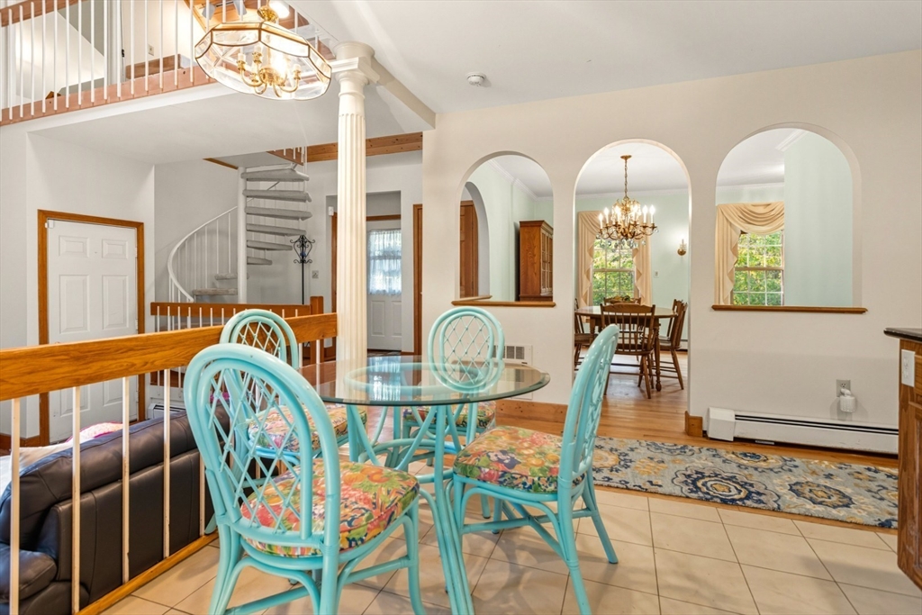 Your Private 4 bed/ 2.5 bath Oasis awaits in West Newbury. Unique Central Entrance dormered Cape on a quiet street. Newer stainless steel appliances in kitchen including a double oven with granite counter tops and center Island, a perfect gathering spot. Open concept sunken sitting area off the kitchen expands entertaining possibilities with doorways to the private backyard and Patio. Fenced in level yard with storage shed and fruit trees. Kitchen is just off elegant dining room and spacious living room that boast propane fire place and twin built in bookcases.Hardwood floors thru-out the first floor. The four spacious bedrooms upstairs includes a secluded master suite, master bath, and its own propane fireplace. Radiant heat in Master Bath floor and kitchen.Convenient Upstairs Laundry. Oversized two car garage parking. Back-up Generator.Partially finished basement. Close to town center, schools, tons of trails that West Newbury has to offer and the Merrimack River.