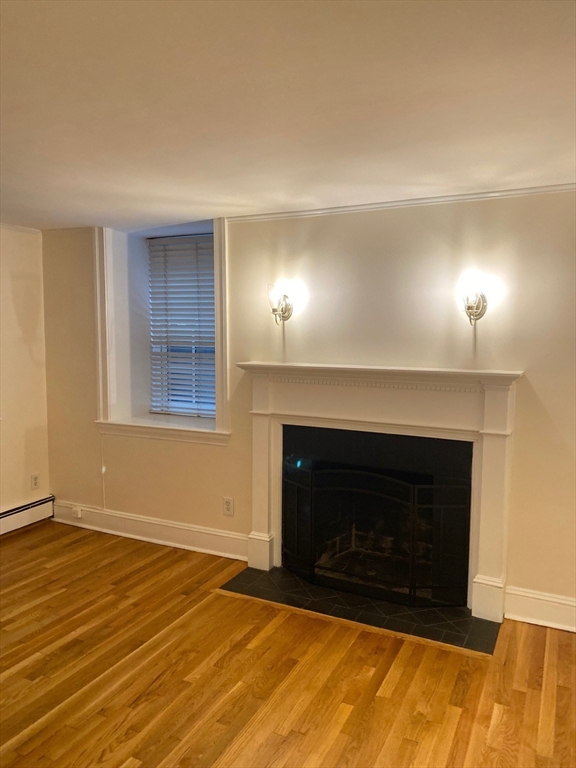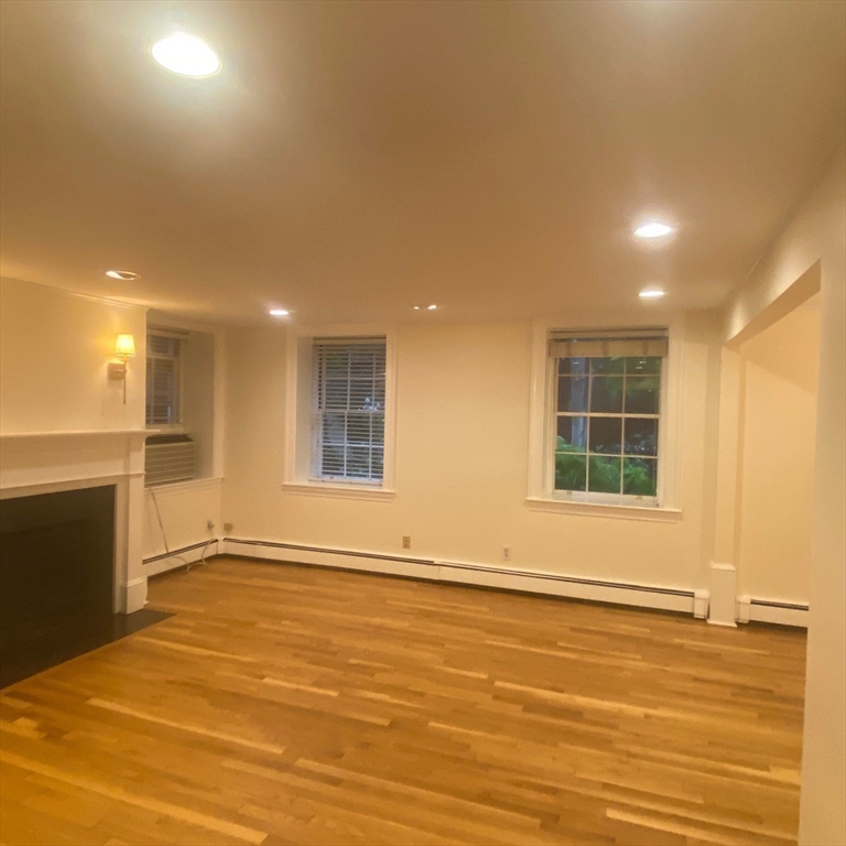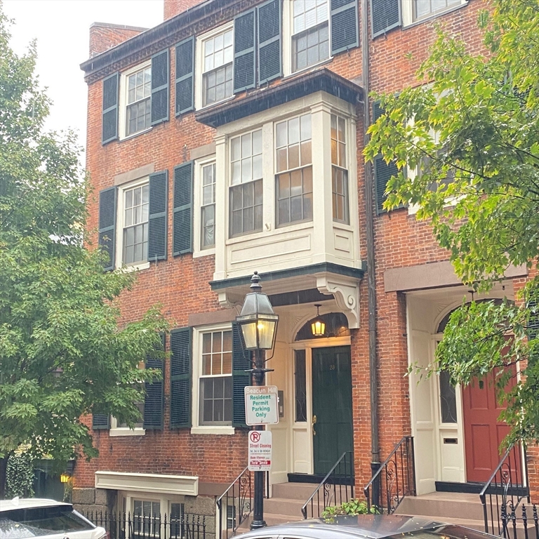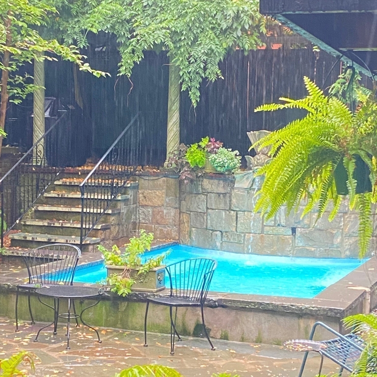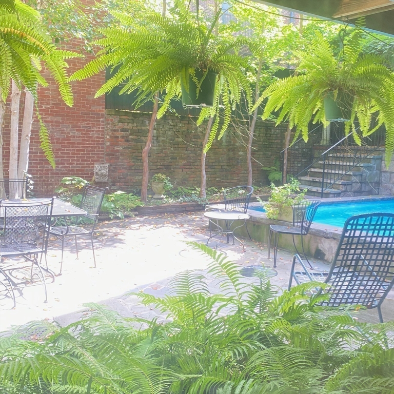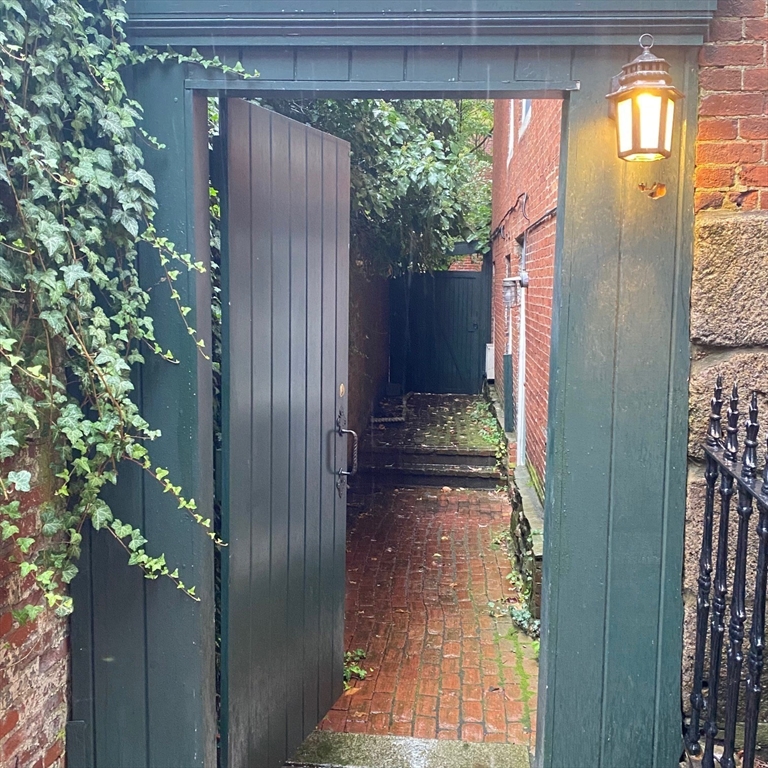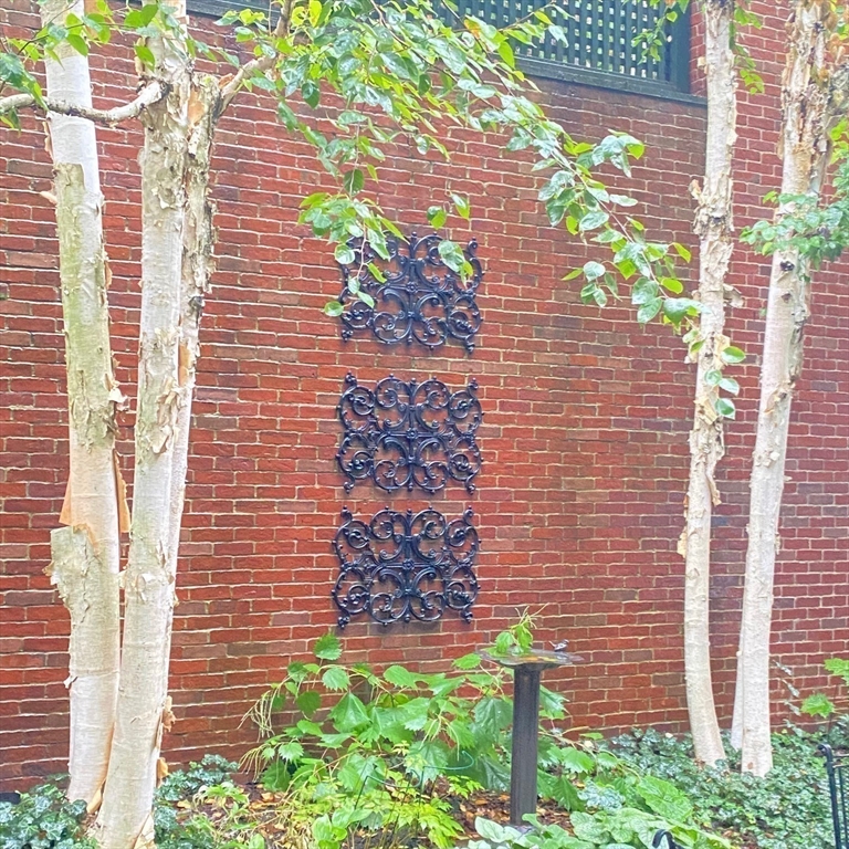 Spacious, classic European style two-bedroom garden unit on upper Joy Street. Accessed through a private brick passageway, the unit door opens into a small foyer with coat closet leading to a large sunk-in living room with fireplace, refinished oak floors and separate dining area. All looking out on to a beautiful, well-manicured common garden with mature plantings and a lovely pool with fountain, seating area and grill. Galley style kitchen with electric range, dishwasher, microwave, stainless steel refrigerator, granite counter tops and wood cabinets. Two side by side bedrooms, one with decorative fireplace and each with a double closet and refinished oak floors. Bath with tub and shower. Hall closet with full size stack washer and dryer. The 21-23 Joy Street Condominium Association is professionally managed. There are 8 units in total. Cats allowed. No dogs.