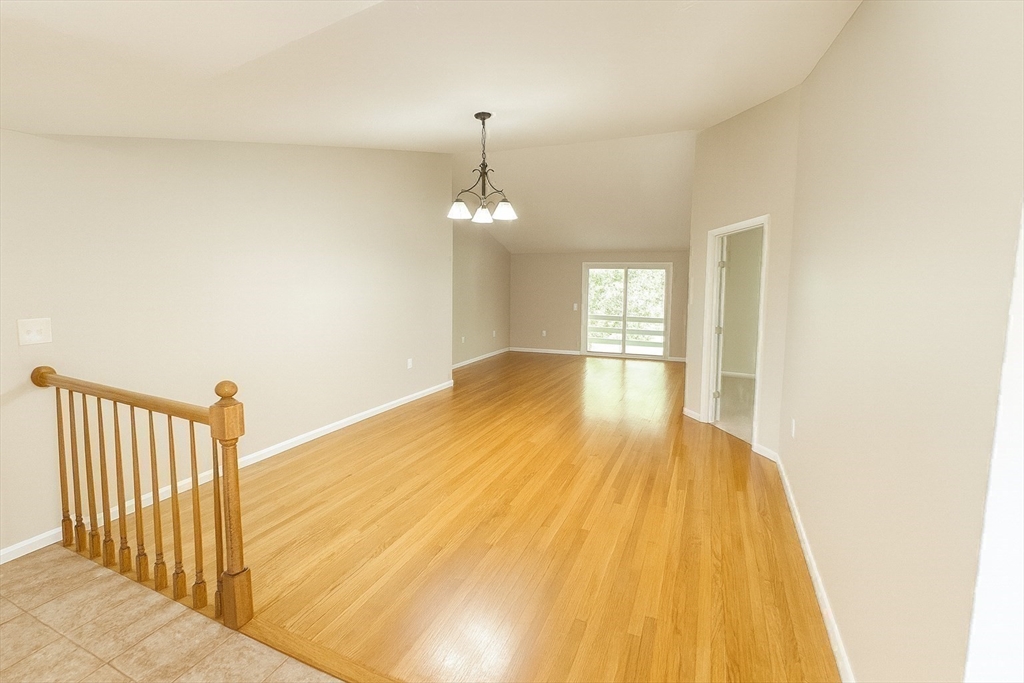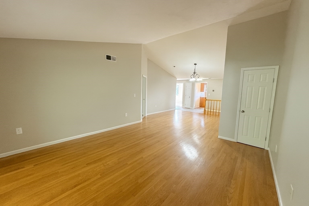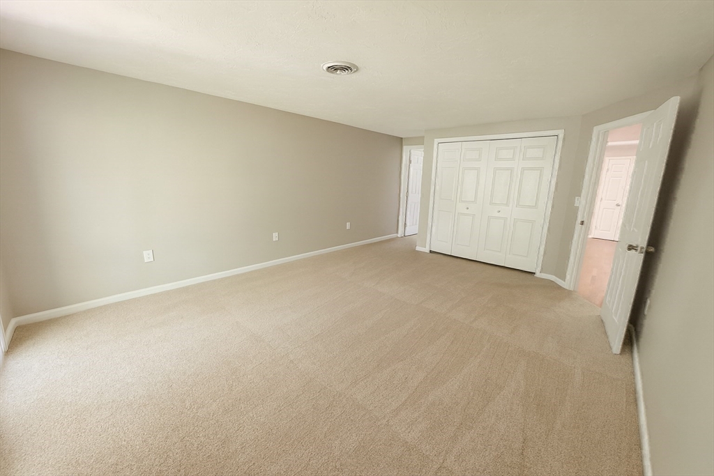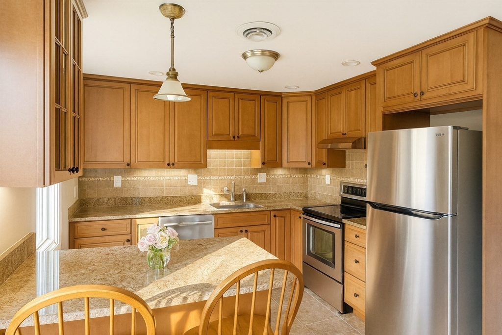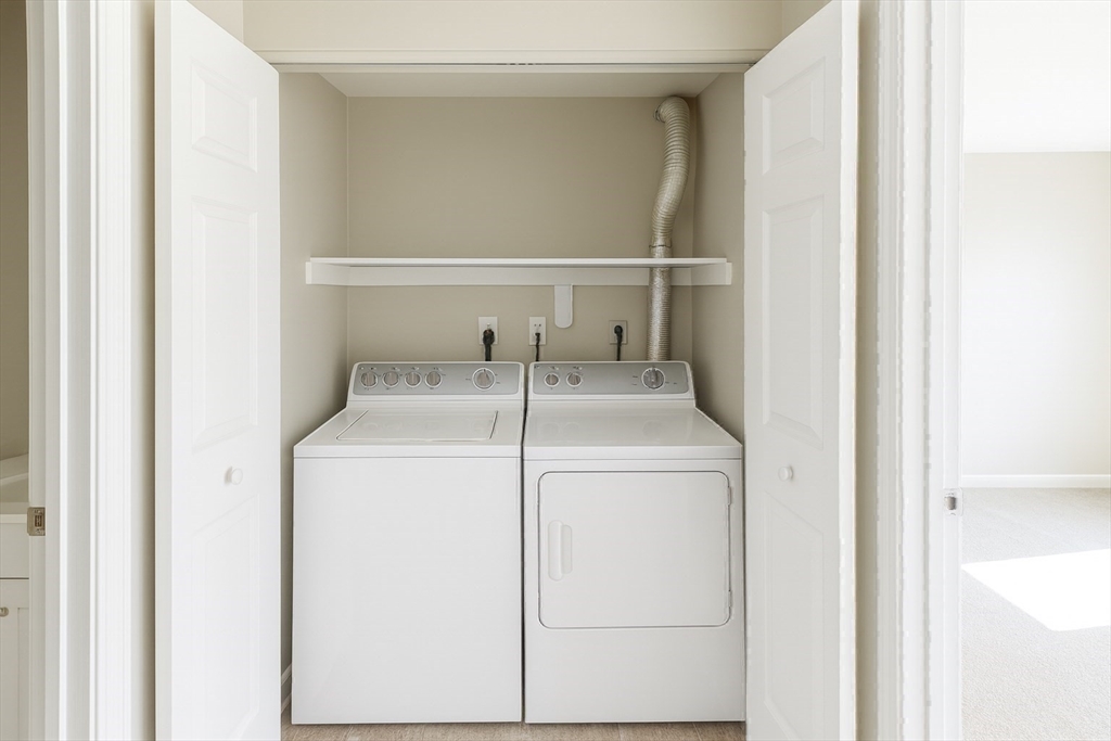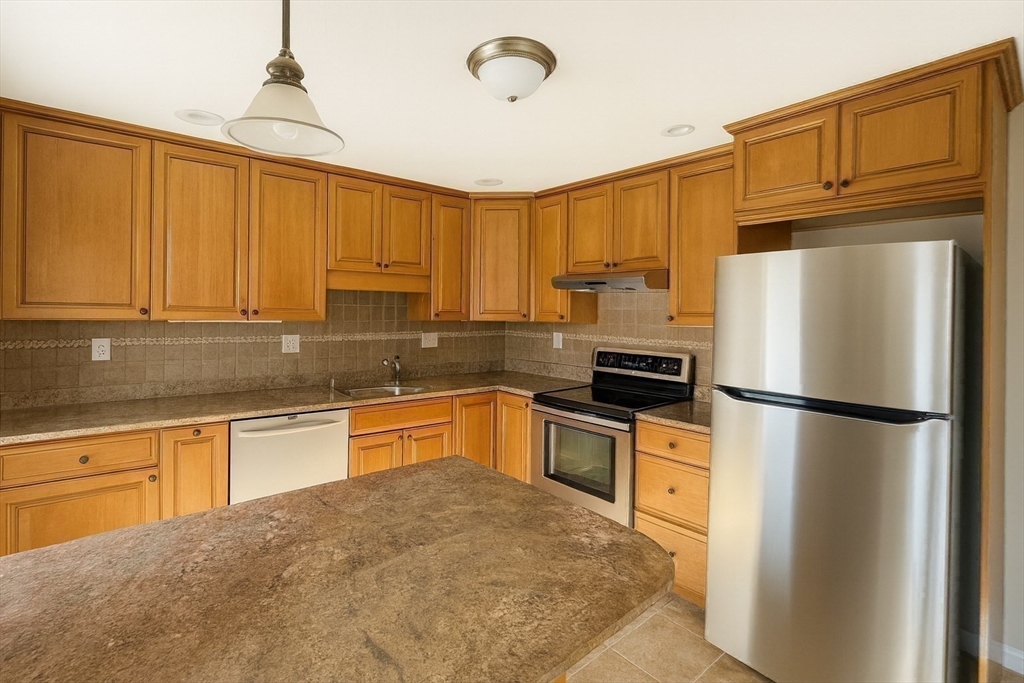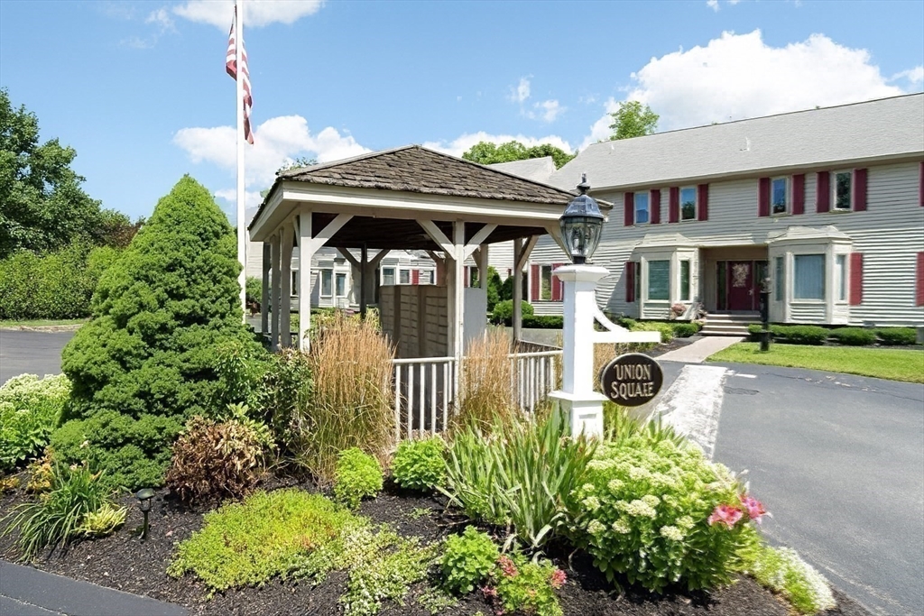 Welcome to 46 Union Square! This freshly painted 2-bedroom, 2-bath condo offers 1,056 sq. ft. of comfortable, move-in ready living. The open concept living and dining room features vaulted ceilings, hardwood floors, and sliders to a spacious 10x23 porch perfect for entertaining or relaxing. The kitchen features stainless steel appliances, granite countertops, recess lighting, bar-style under-cabinet lighting, and a peninsula that serves as both a convenient eating area and added workspace. Brand-new carpet adds comfort to the bedrooms, including a generous primary suite with en-suite bath, ample closet space, and its own sliders opening to the porch. The second bedroom offers two closets, providing plenty of storage. Added conveniences include in-unit laundry, central A/C, extra basement storage (20x15), a deeded parking spot located right in front. Residents can also enjoy a community swimming pool. Ideally located minutes from shopping, restaurants, commuter rail, and major highways.