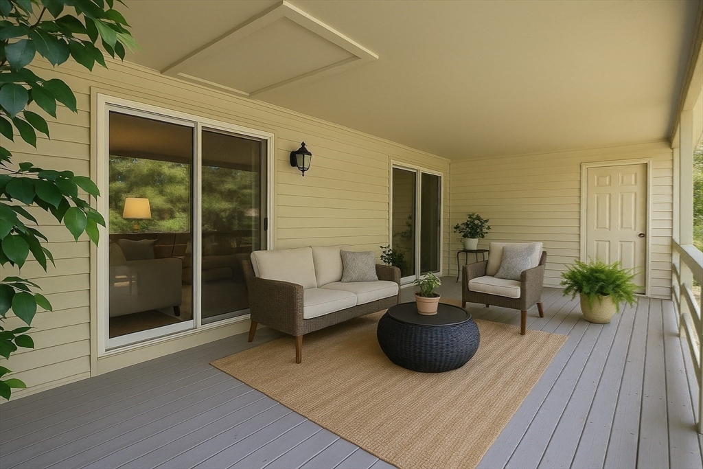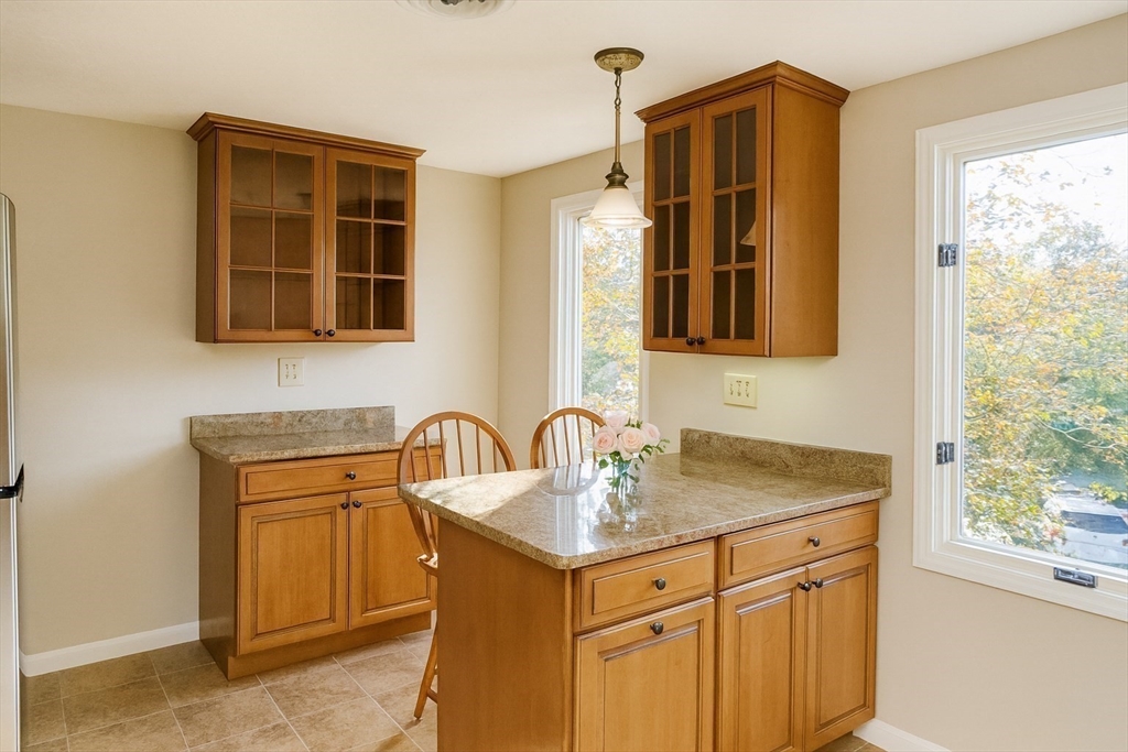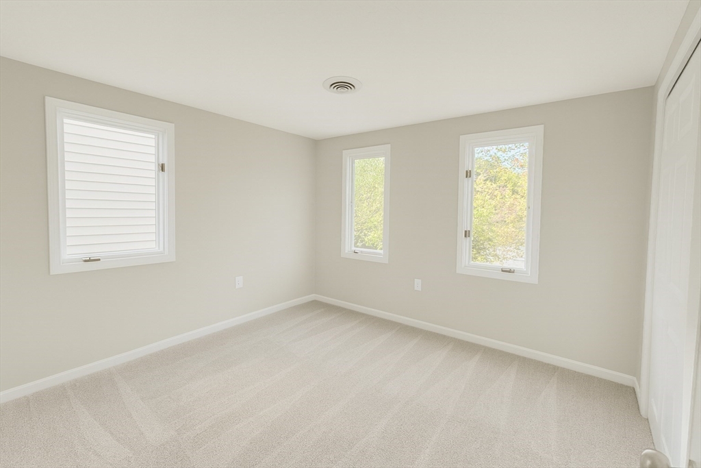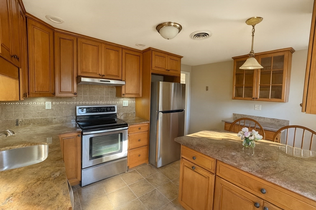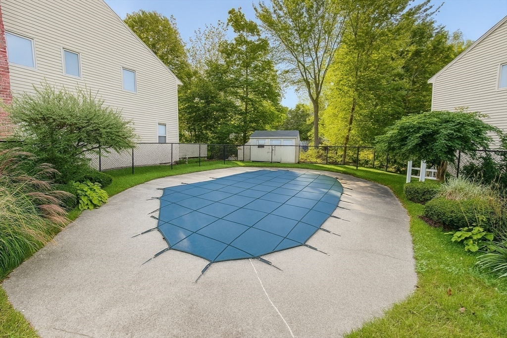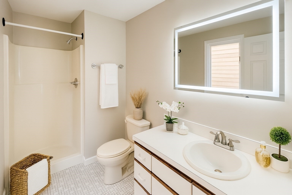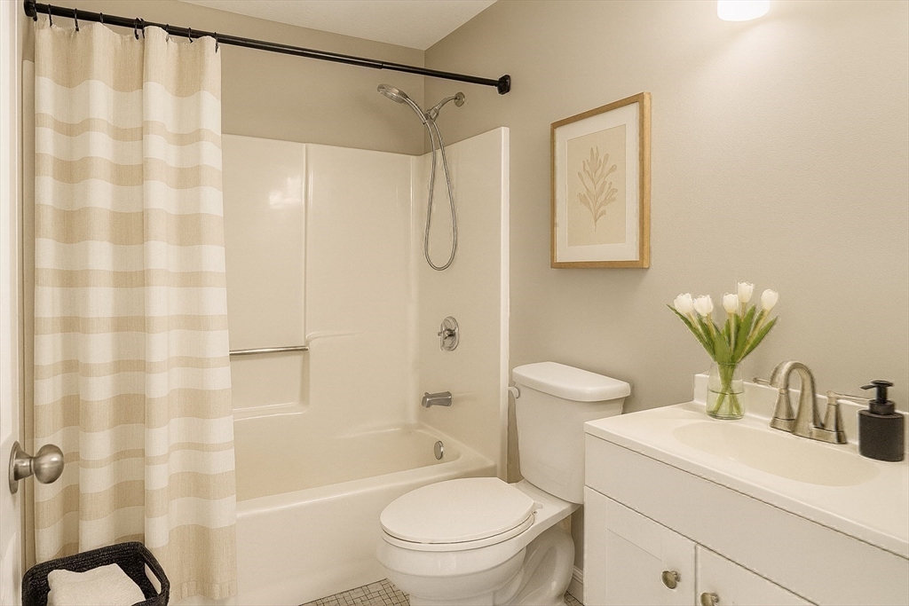 Welcome to 46 Union Square! This freshly painted 2-bedroom, 2-bath condo offers 1,056 sq. ft. of comfortable, move-in ready living. The open concept living and dining room features vaulted ceilings, hardwood floors, and sliders to a spacious 10x23 porch perfect for entertaining or relaxing. The kitchen features stainless steel appliances, granite countertops, recess lighting, bar-style under-cabinet lighting, and a peninsula that serves as both a convenient eating area and added workspace. Brand-new carpet adds comfort to the bedrooms, including a generous primary suite with en-suite bath, ample closet space, and its own sliders opening to the porch. The second bedroom offers two closets, providing plenty of storage. Added conveniences include in-unit laundry, central A/C, extra basement storage (20x15), a deeded parking spot located right in front. Residents can also enjoy a community swimming pool. Ideally located minutes from shopping, restaurants, commuter rail, and major highways.