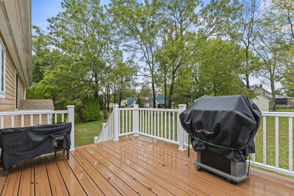 Tucked away on a quiet cul-de-sac, this spacious 4-bedroom, 3-bath home offers a flexible floor plan perfect for today’s lifestyle. The main level welcomes you with soaring cathedral ceilings, a fireplace, and an open layout that seamlessly connects the living, dining, and kitchen areas. The kitchen features a center island, gas cooking, and direct access to the deck for easy indoor-outdoor living. The primary suite includes a private bath, while two additional bedrooms share a full bath with soaking tub. The finished walk-out lower level expands your options with a fourth bedroom, full bath, and versatile living space complete with kitchenette—ideal for guests or extended family. Outside, enjoy a composite deck, porch, sprinkler system, and storage shed, all set on an oversized lot with mature landscaping. Central air, a 2-car garage, and convenient access to highways, schools, and local amenities make this home an excellent opportunity.