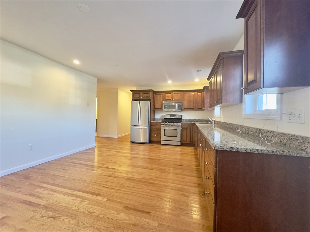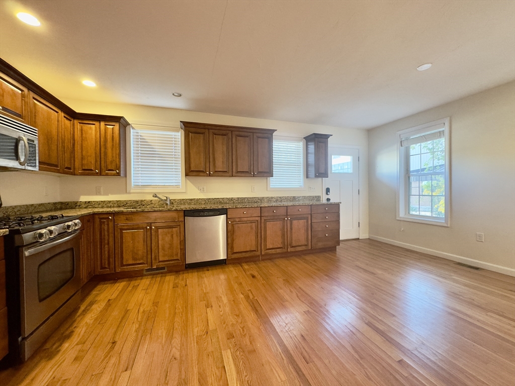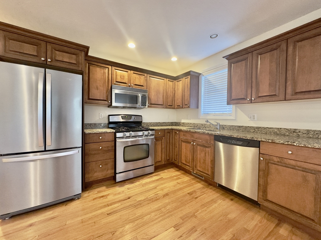 NO broker’s fee!! Opportunity to rent a sun-splashed corner unit offering 2 bedrooms & 2 bathrooms on a quiet, dead-end street yet close to all amenities. This 1,200 sqft home is the perfect blend of space and convenience. Step inside to find beautiful hardwood floors throughout, central air for year-round comfort, recessed lighting, an abundance of windows, large living room with a cozy fireplace. Down the hall are 2 generous bedrooms and two spacious full baths. The eat-in kitchen/dining area boasting custom cabinetry, granite countertop & stainless steel appliances. Enjoy your morning coffee or evening relaxation on your private back deck. Two assigned parking spots for ultimate convenience. Unit is located in a quiet, well-kept 6-unit building with professional management. Unbeatable location, close to parks, shopping, supermarkets, restaurants, public transportation & the highways.