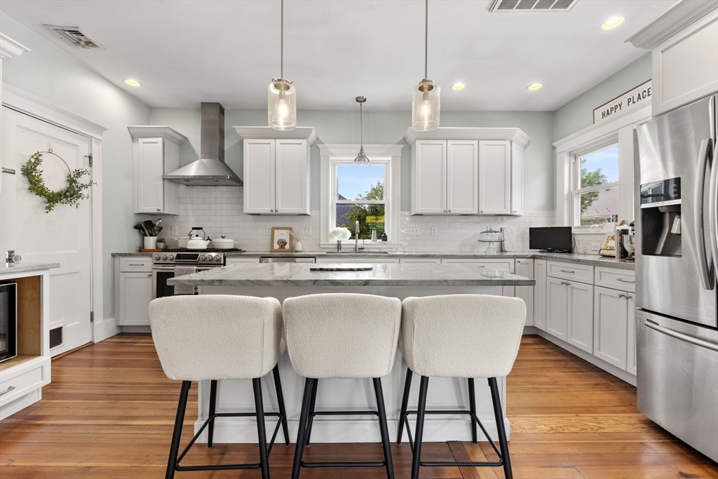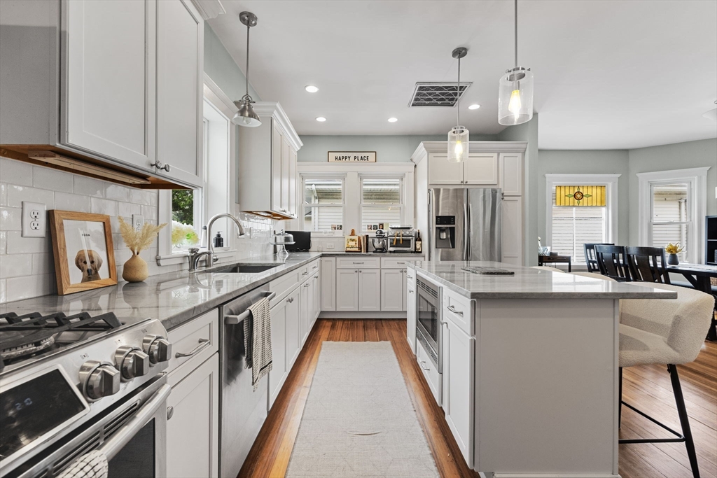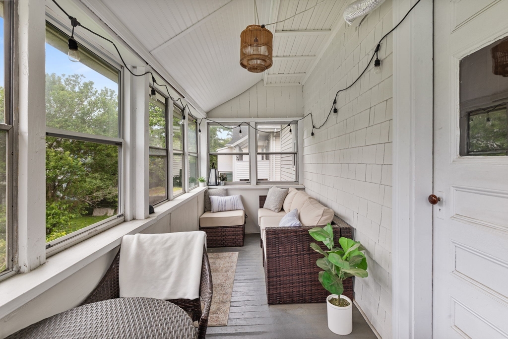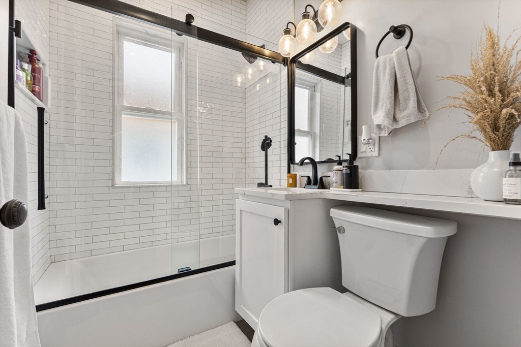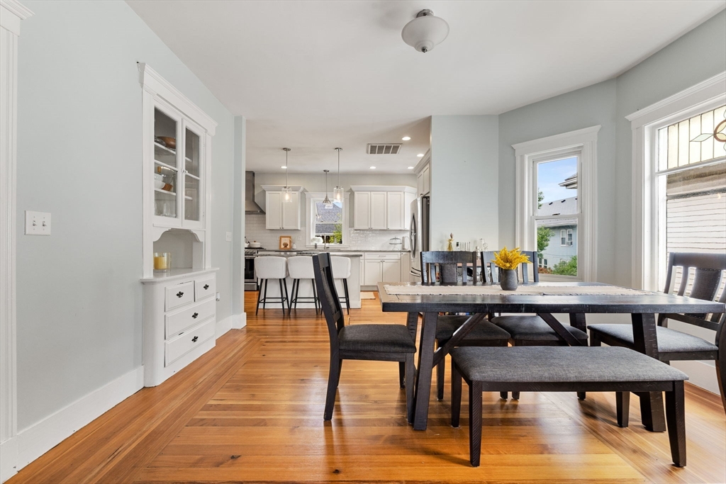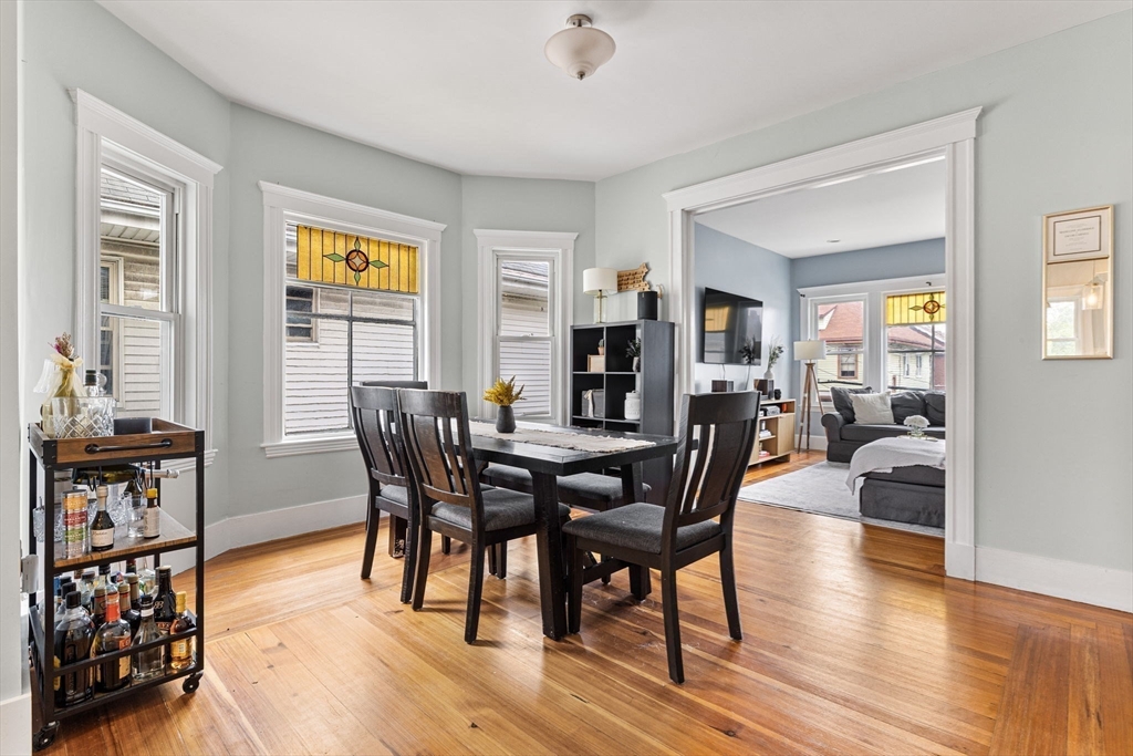 Available now! This sunny 2 bed / 1 bath top-floor unit boasts an open layout with gleaming hardwood floors, high ceilings, and abundant natural light throughout. The updated kitchen features stainless steel appliances and generous cabinet space, flowing seamlessly into the spacious living and dining areas. In addition to two well-sized bedrooms, you'll find a bonus room perfect for a home office and a separate sunroom ideal for morning coffee or unwinding at the end of the day. Additional highlights include central air, in-unit laundry, basement storage, and one off-street parking spot. Outside, enjoy a shared patio and fenced yard complete with grapevines and fruit trees. Conveniently located just minutes from downtown South Medford with easy access to the MBTA Red Line and a variety of local shops and restaurants.