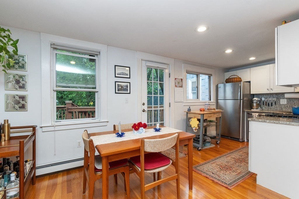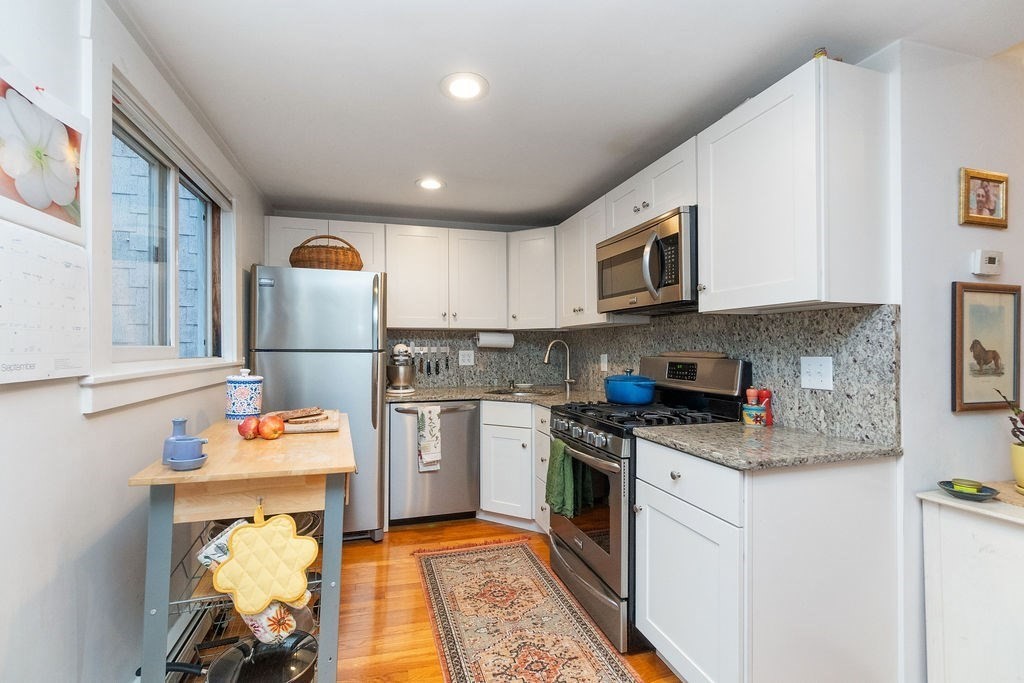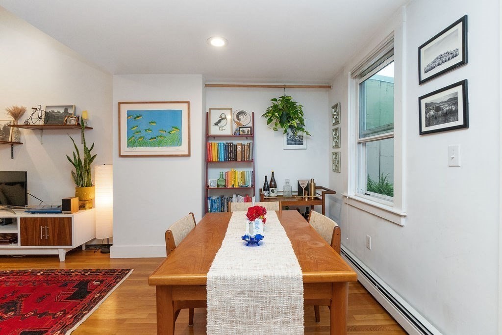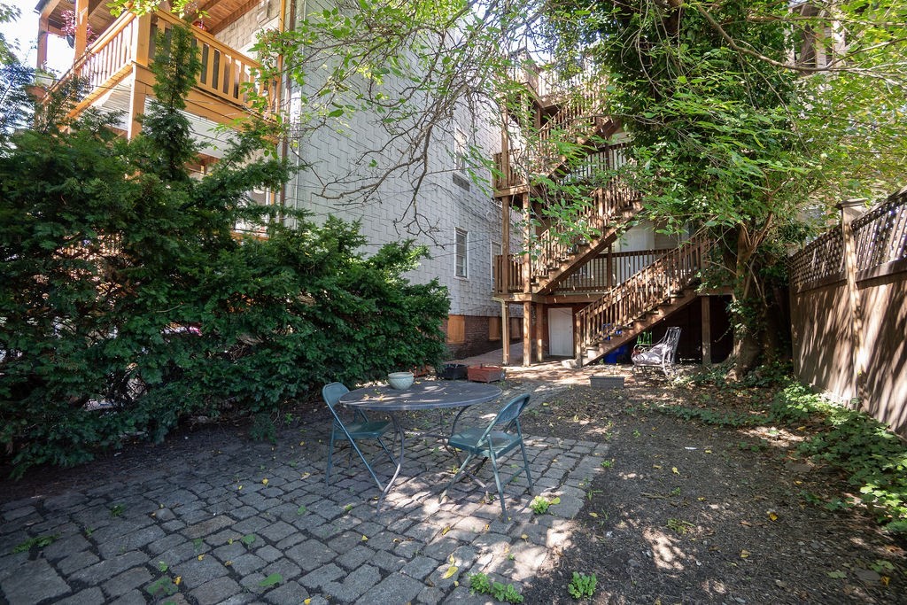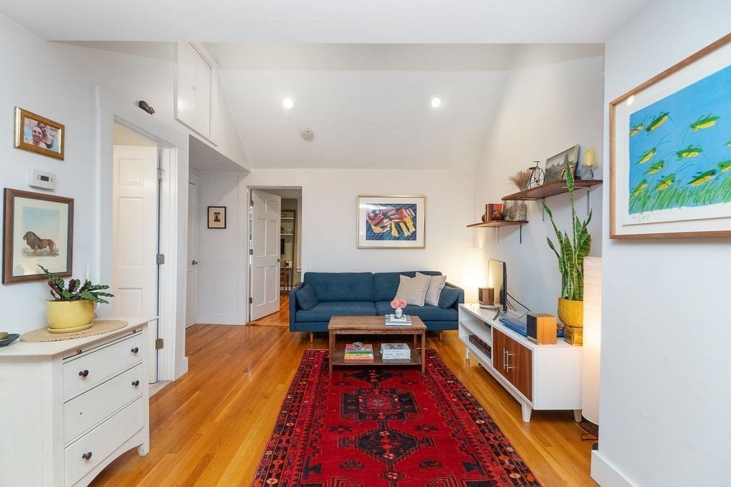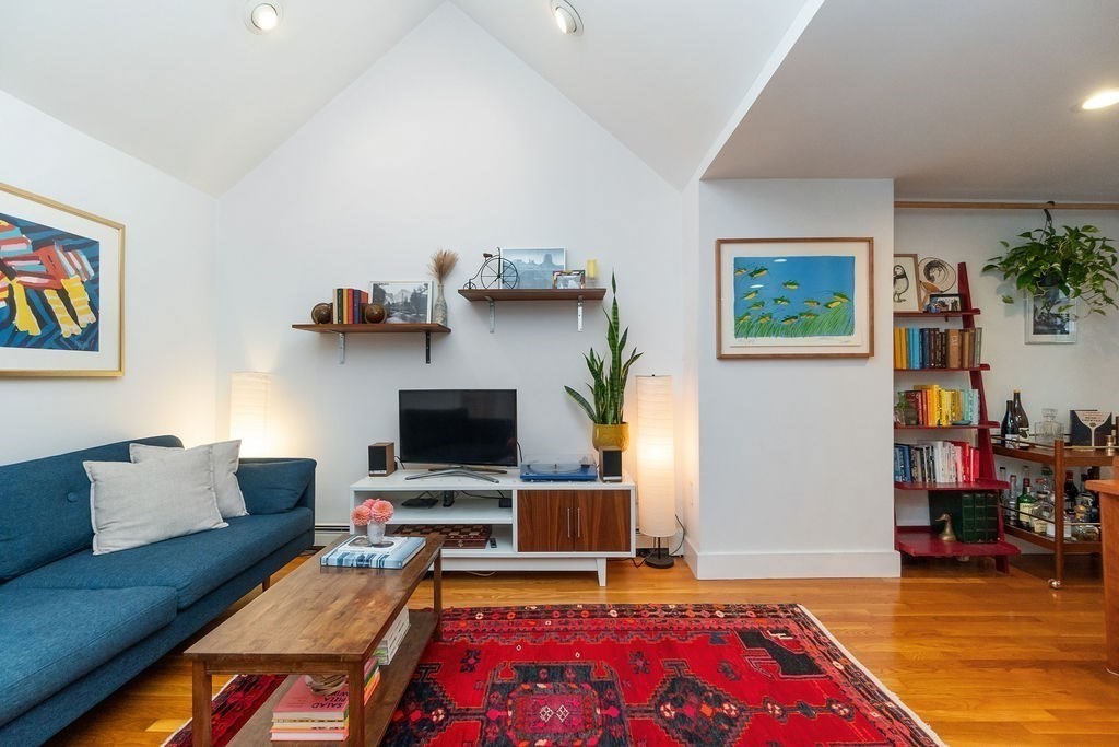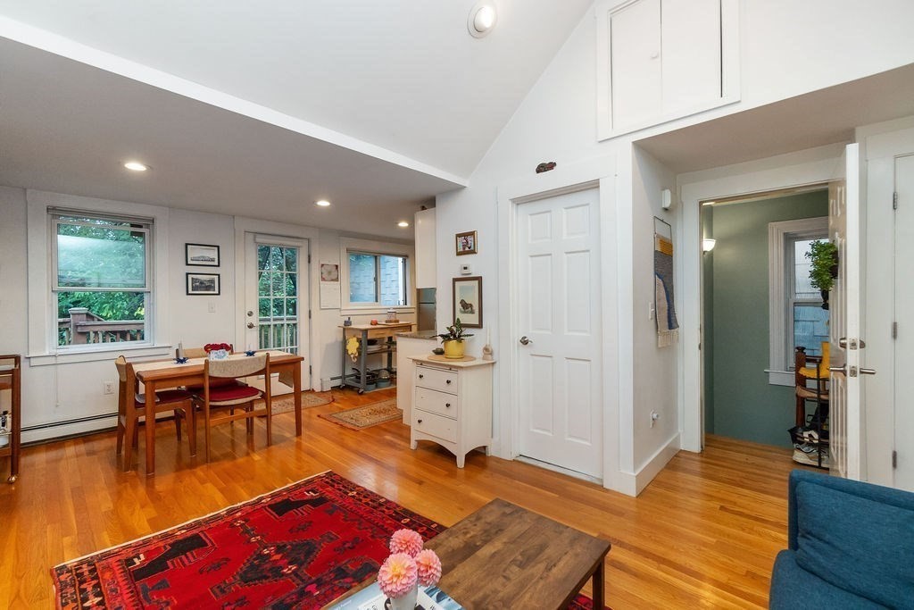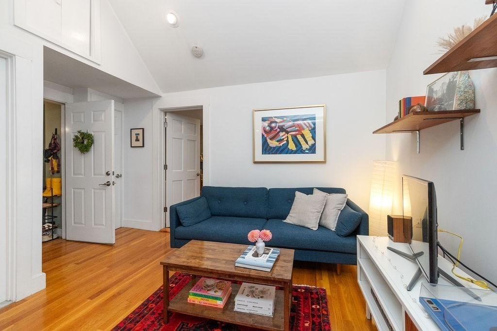 Welcome to pied-à-Trenton, a charming top-floor 1BR/1 BA, 558 SF home in historic Eagle Hill. Renovated in 2017, this light-filled unit boasts vaulted ceilings, hardwood floors, and an open living/dining layout. The alcove kitchen is outfitted with classic shaker cabinets, granite counters, stainless appliances, and gas cooking. The spacious front-facing bedroom accommodates a queen bed, desk, and features large closets. Enjoy a private 120 SF rear deck overlooking the shared yard with patio space, perfect for entertaining. Practical touches include deeded basement storage, common laundry, and a remarkably low $163/month condo fee. Nestled among the trees in one of East Boston’s most historic neighborhoods, this residence blends modern updates with timeless character, offering both comfort and convenience, but in the center of it all- just blocks to Airport, MBTA blue line for 15 minute commute downtown, pocket parks, and local eateries! Owner managed association that allows pets