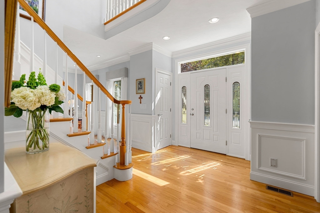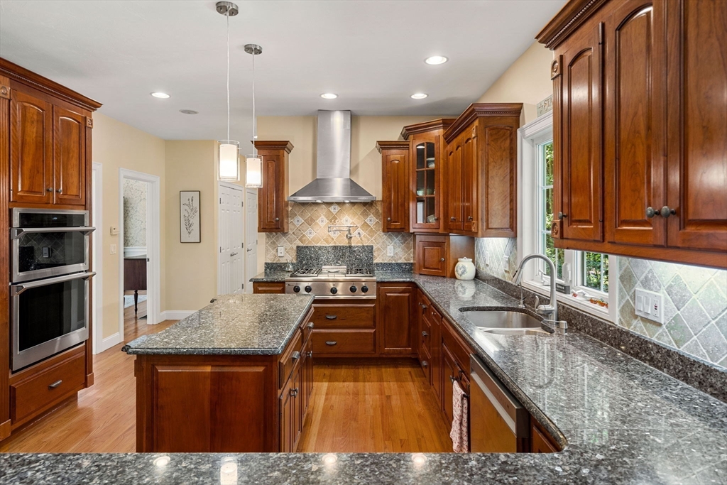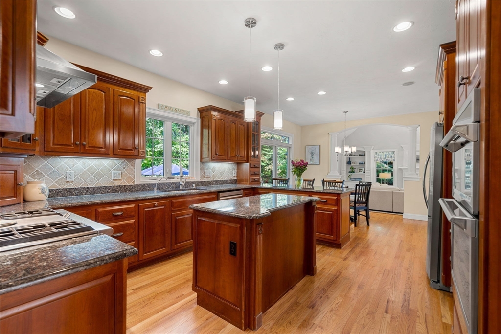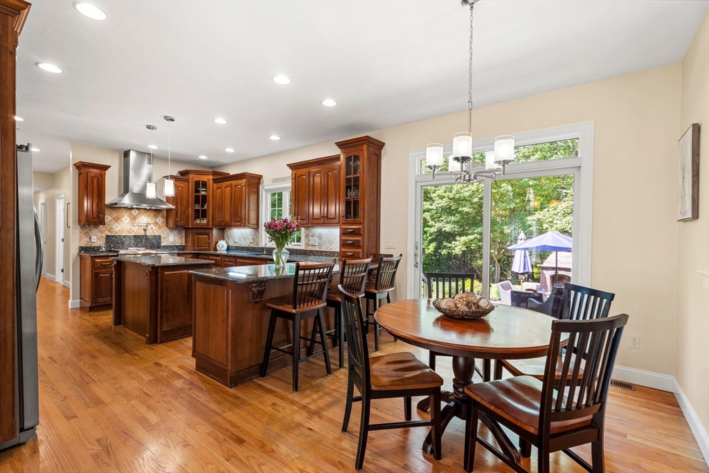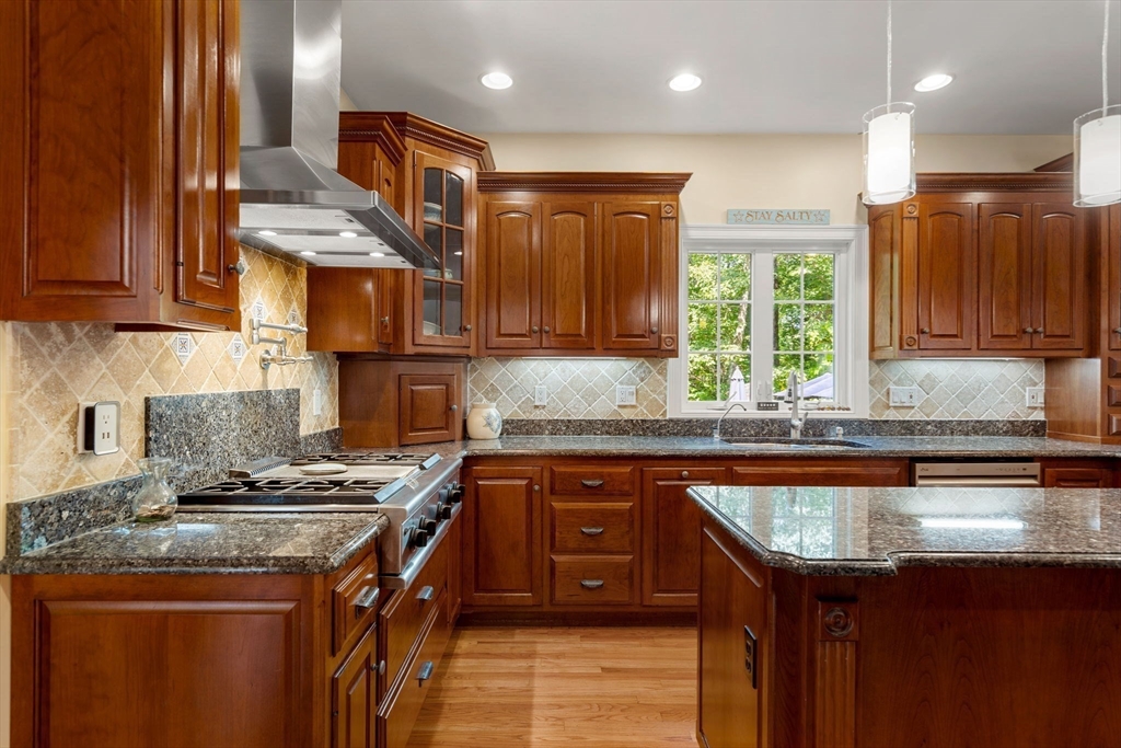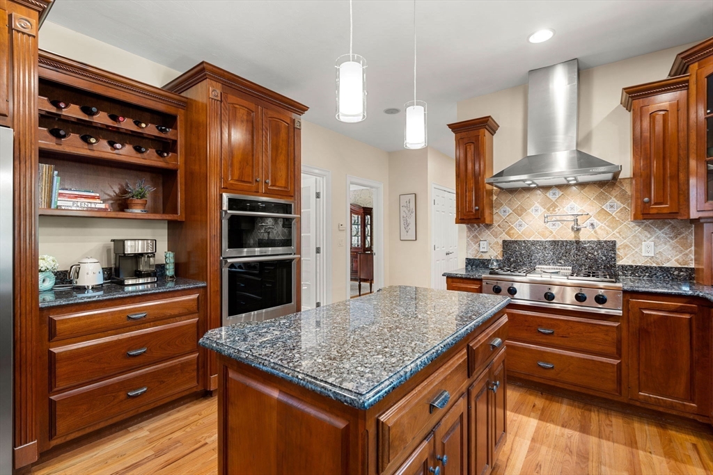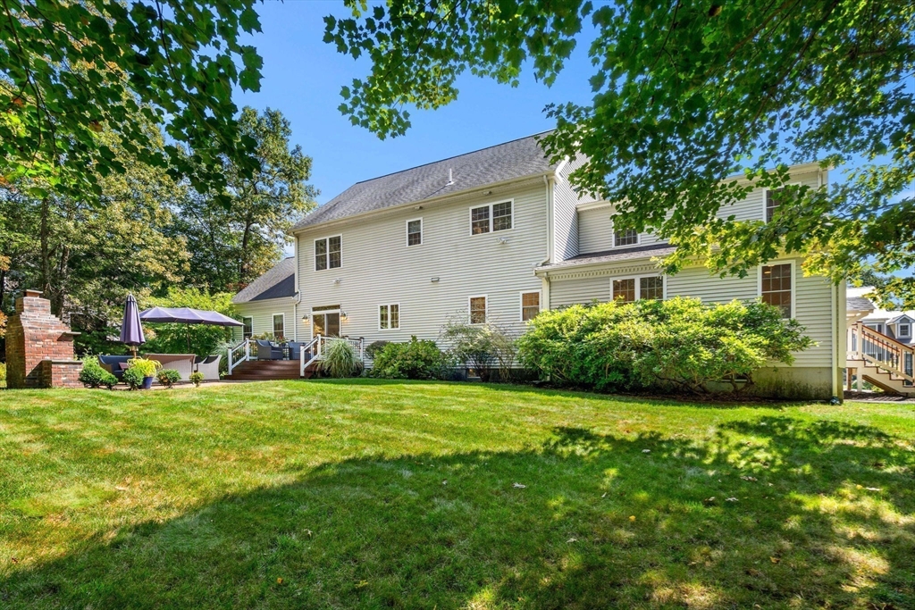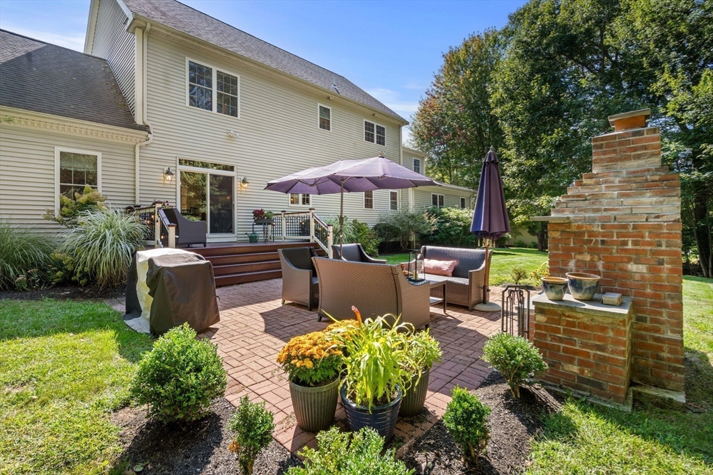 Located in a sought-after neighborhood, this custom-built home offers charm, privacy, and convenience to shopping, dining, and major routes. The grand two-story foyer leads to a formal living room and a sunlit kitchen with hardwood floors, granite counters, and custom cabinetry. Sliding doors open to a mahogany deck and patio with a built-in fireplace—perfect for outdoor entertaining. The vaulted family room features a fireplace and wet bar. The main level also includes a full bath, laundry, mudroom, and a 5th bedroom or office. Upstairs, the spacious primary suite includes a luxurious en suite bath and walk-in closet. Three additional bedrooms share a full bath. Oversized windows fill the home with natural light. The full unfinished basement offers expansion potential. Enjoy peace of mind with a one-year "everything under the roof" warranty included.