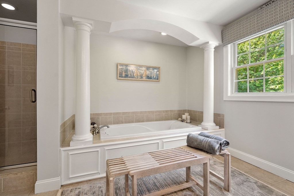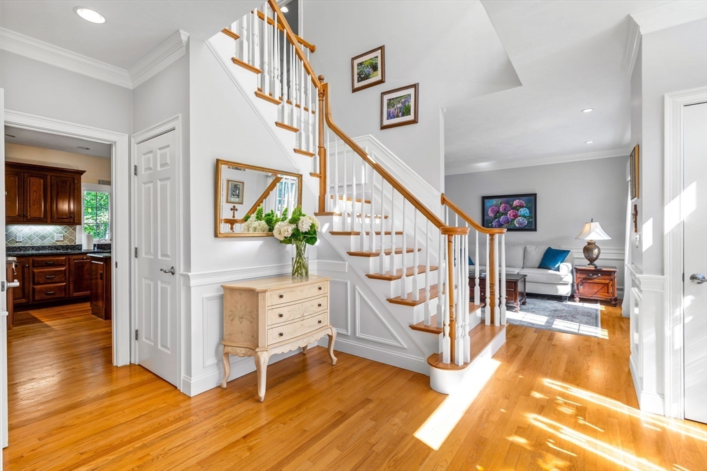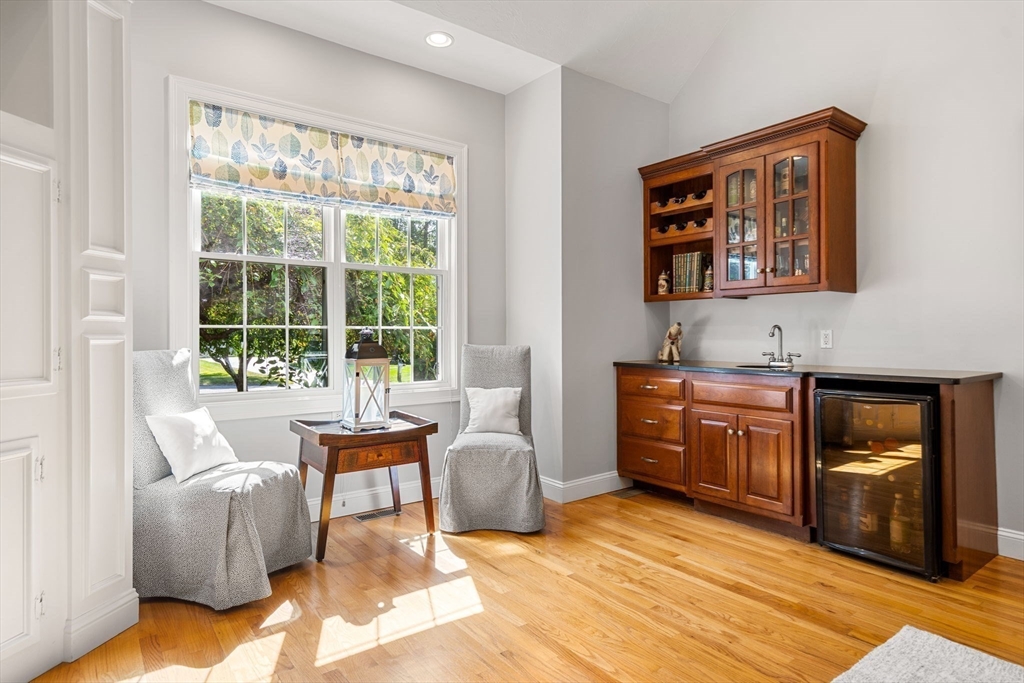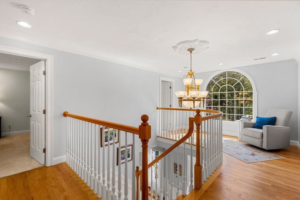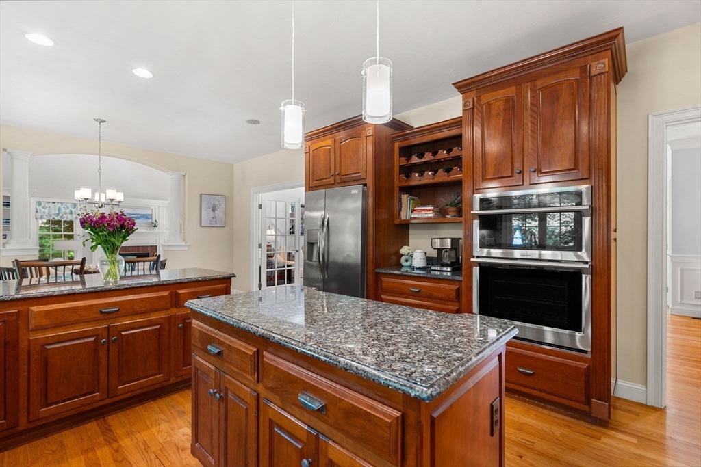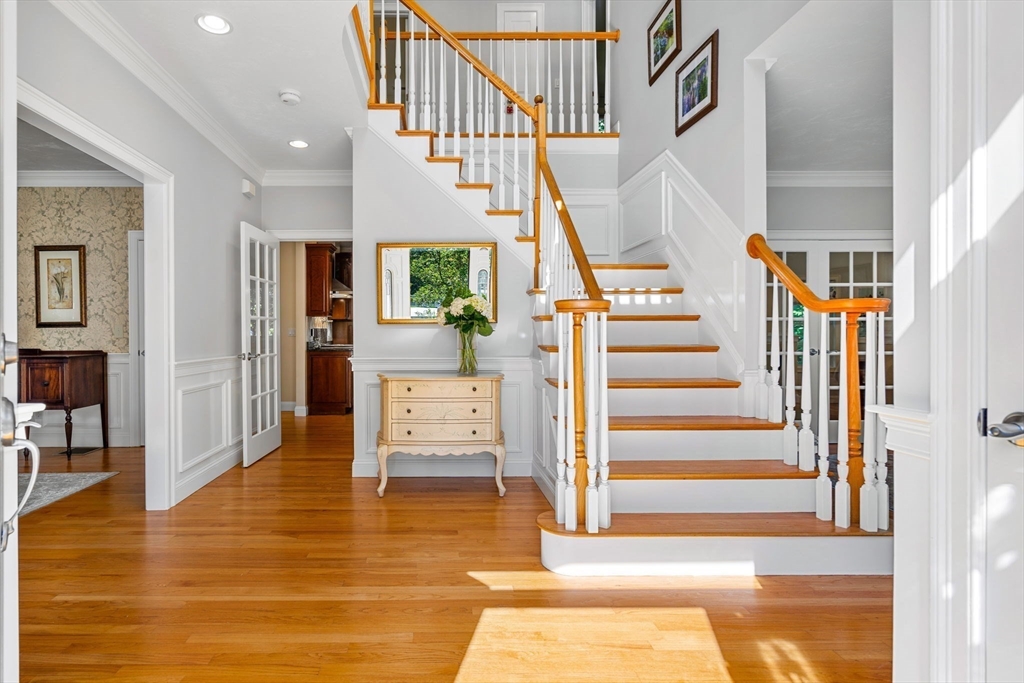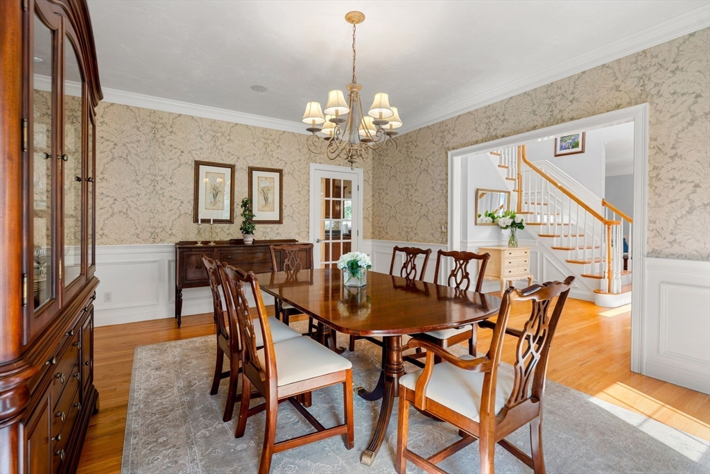 Located in a sought-after neighborhood, this custom-built home offers charm, privacy, and convenience to shopping, dining, and major routes. The grand two-story foyer leads to a formal living room and a sunlit kitchen with hardwood floors, granite counters, and custom cabinetry. Sliding doors open to a mahogany deck and patio with a built-in fireplace—perfect for outdoor entertaining. The vaulted family room features a fireplace and wet bar. The main level also includes a full bath, laundry, mudroom, and a 5th bedroom or office. Upstairs, the spacious primary suite includes a luxurious en suite bath and walk-in closet. Three additional bedrooms share a full bath. Oversized windows fill the home with natural light. The full unfinished basement offers expansion potential. Enjoy peace of mind with a one-year "everything under the roof" warranty included.