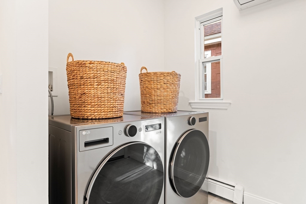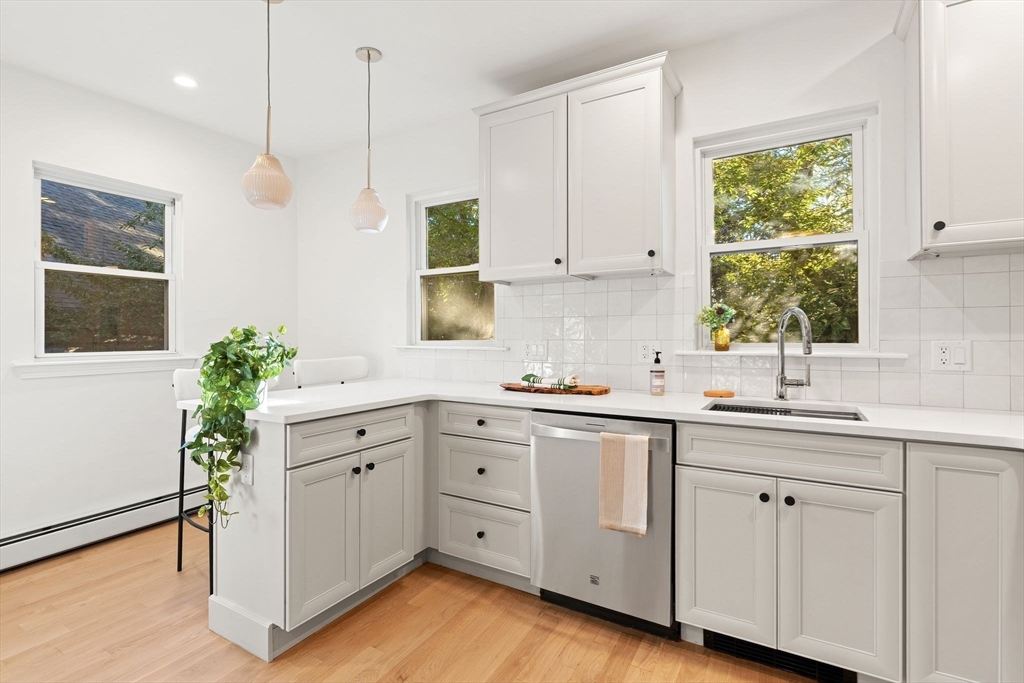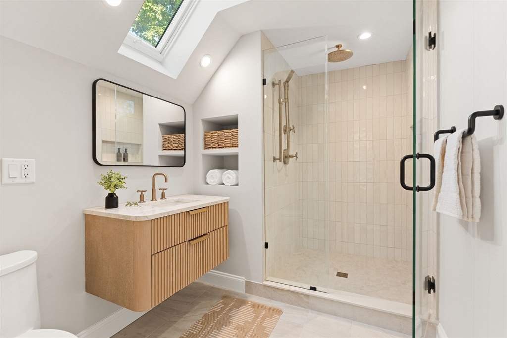 Uber stylish, bi-level condo with 2 beds + study, 2 baths, tucked away on a side street in JP. Located just mins to the Arboretum, Centre / South St. shops, Forest Hills station & Jamaica Pond! Mid-century modern vibes blend many cosmetic updates such as refinished oak flooring, high-end fixtures & lighting, + central air. The living area welcomes you w/ an open layout, bay windows, high ceilings & sleek gas fireplace. Gorgeous kitchen has Kenmore Elite appliances, tiled backsplash, and custom hood fan. The main level also includes one bedroom, convenient study, in-unit laundry room, & stunning tiled bath featuring a floating vanity. Relax in your luxurious top floor suite among skylights, a second gas fireplace, custom walk-in closet, and glass shower w/ Kohler Purist fixtures. Unit also has a mudroom, private patio, walkout basement + large prvt storage room. This was a 2015 full reno & 2025 refresh, and is a new condo conversion offering 2 units. Don’t miss this exceptional home!