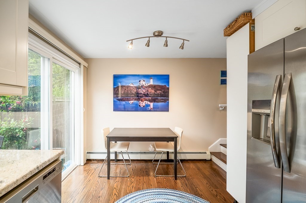 This updated 2 bedroom condo offers a rare opportunity to embrace living in the quaint village of MBTS. Renovated in 2016 with wide plank red oak hardwood floors throughout and a sun-filled modern kitchen with granite countertops and stainless steel appliances, this unique offering provides the best of simplified easy living. A cozy electric fireplace in the living room adds ambiance and character. The second floor boasts 2 bedrooms and an updated bathroom with a tiled tub/shower and granite topped single vanity. Large closet space in both bedrooms with a pull down attic for extra storage. The kitchen slider leads to a sunny patio bursting with flowering plants for quiet outdoor dining or a bit of relaxing. In unit laundry closet is off the kitchen. Ample closet space for the hot water heater, coats and a large pantry keep everything tidy. Don't miss seeing this great opportunity to live in MBTS!