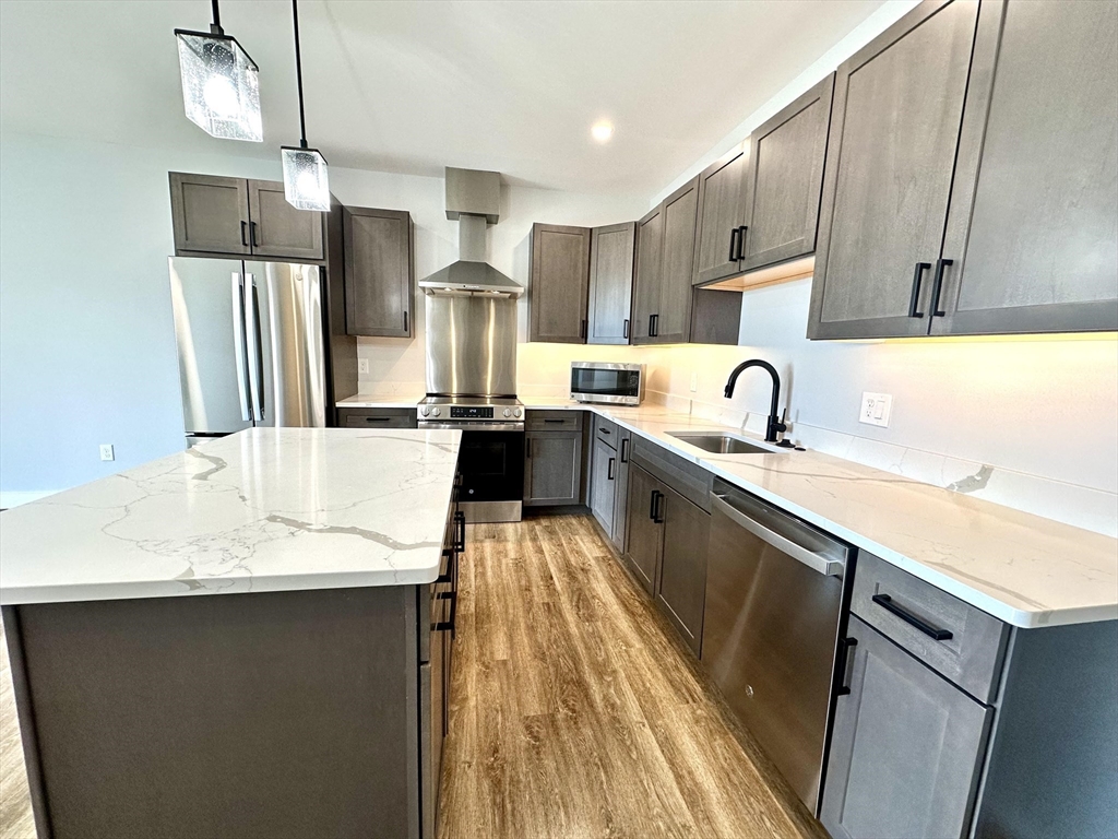 BRAND NEW boutique, mixed-use building in downtown Natick. Unit 302 is a south facing, corner unit. Kitchen has soft-closing cabinets (w/ under lighting), QUARTZ counters, STAINLESS STEEL appliances, center island & an open floor plan w/ high ceilings, LVP flooring, recessed lighting & big windows. IN-UNIT WASHER AND DRYER. Central forced air heat & COOLING. The building has an elevator & GARAGE PARKING FOR ONLY 1 is underground (no option for 2nd car at the building). PET FREINDLY BUILDING. Rent INCLUDES water, sewer, hot water, trash & recycling (tenant to pay only electricity). There is no additional storge space at the building. Snow and ice melt away w/ RADIANT HEATED walk way & driveway. Relax on the ROOF DECK with furniture and grill provided by the owner. The ground level is commercal space w/ future businesses to open & there are 3 upper levels floors with apartments. Great location close to other shops, restaurants, MBTA service, the Common, weekend farmers market & more.