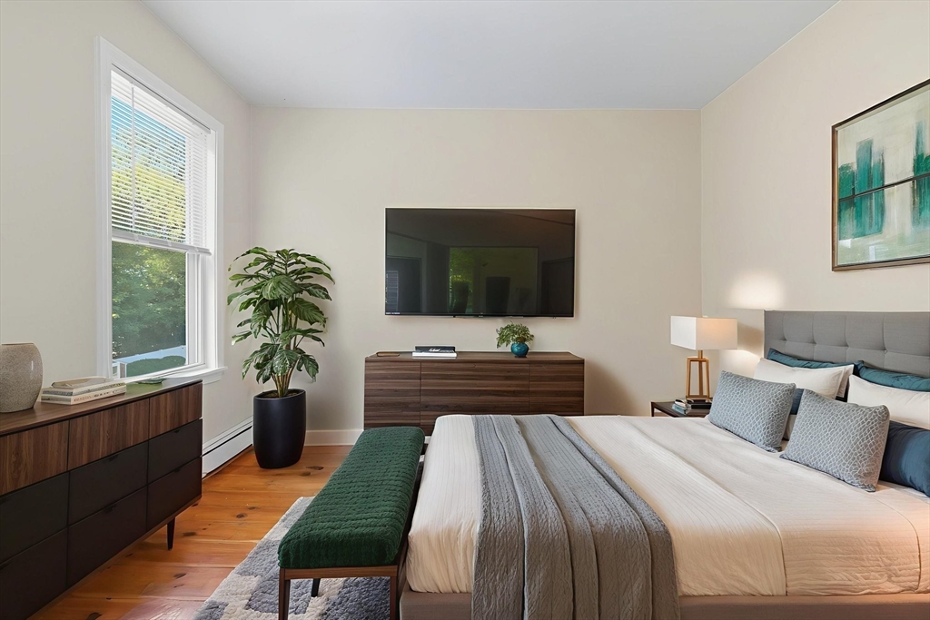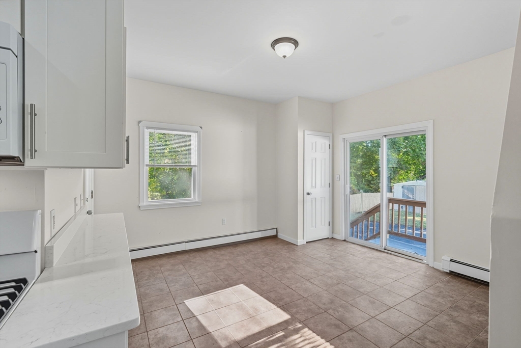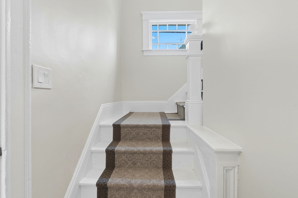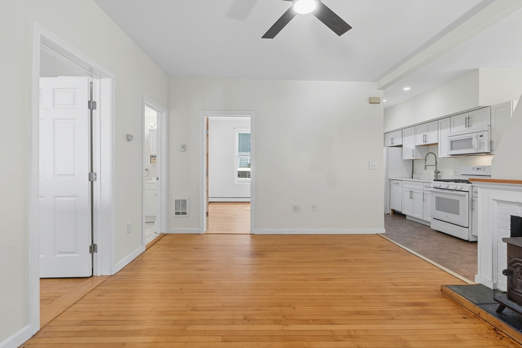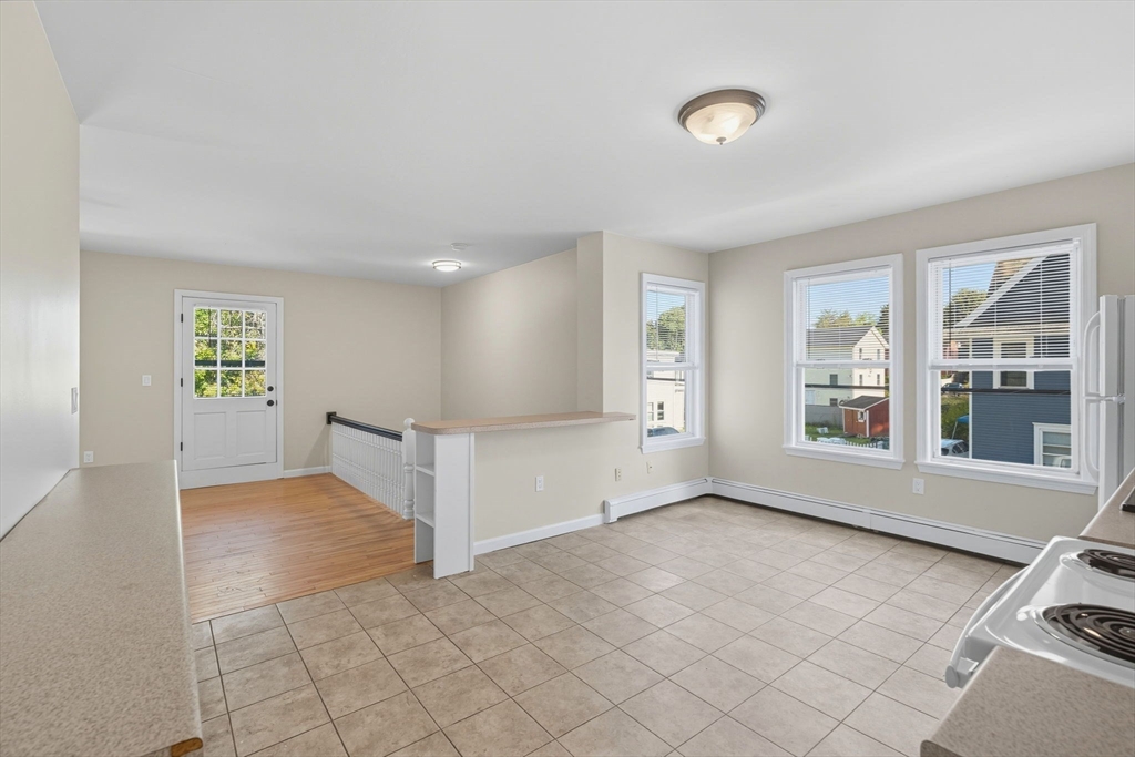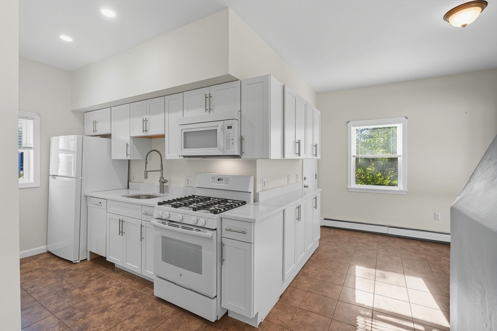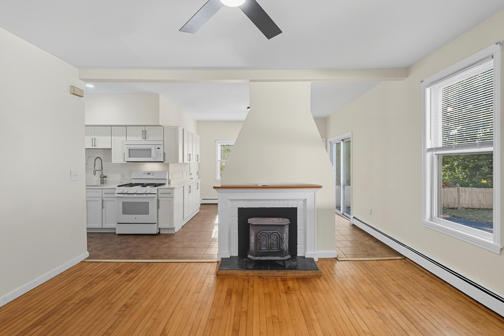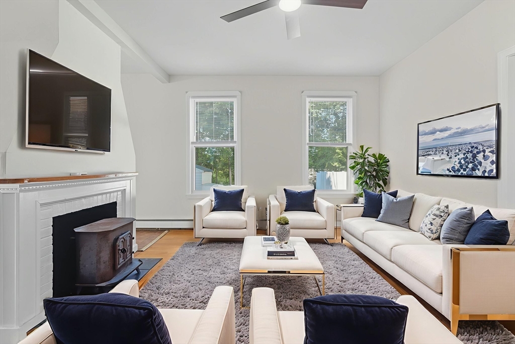 Unique, bright and spacious layout for this well maintained and thoughtfully updated 2-family home just seconds to downtown shops and restaurants and moments to Rte 495. The first floor unit features an open concept living/dining/kitchen with fresh white cabinets and quartz counter tops. There is also a wood stove for cozy nights. Access to the large yard is via the private back deck or from the 3 season sunroom located off the primary bedroom. The second floor unit is freshly painted, with two good sized bedrooms, updated bath and hardwood flooring throughout. A big living room opens to both a large eat-in kitchen with abundant white cabinetry and a private roof deck overlooking the fenced yard. This unit also has a mudroom entry on the first floor and a walk-up attic for great storage and for potential future finished living space. Young heating systems, extra storage and laundry hookups in the basement. New fencing. This is the perfect property for an investor or an owner occupant.