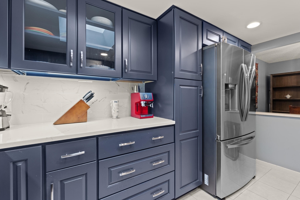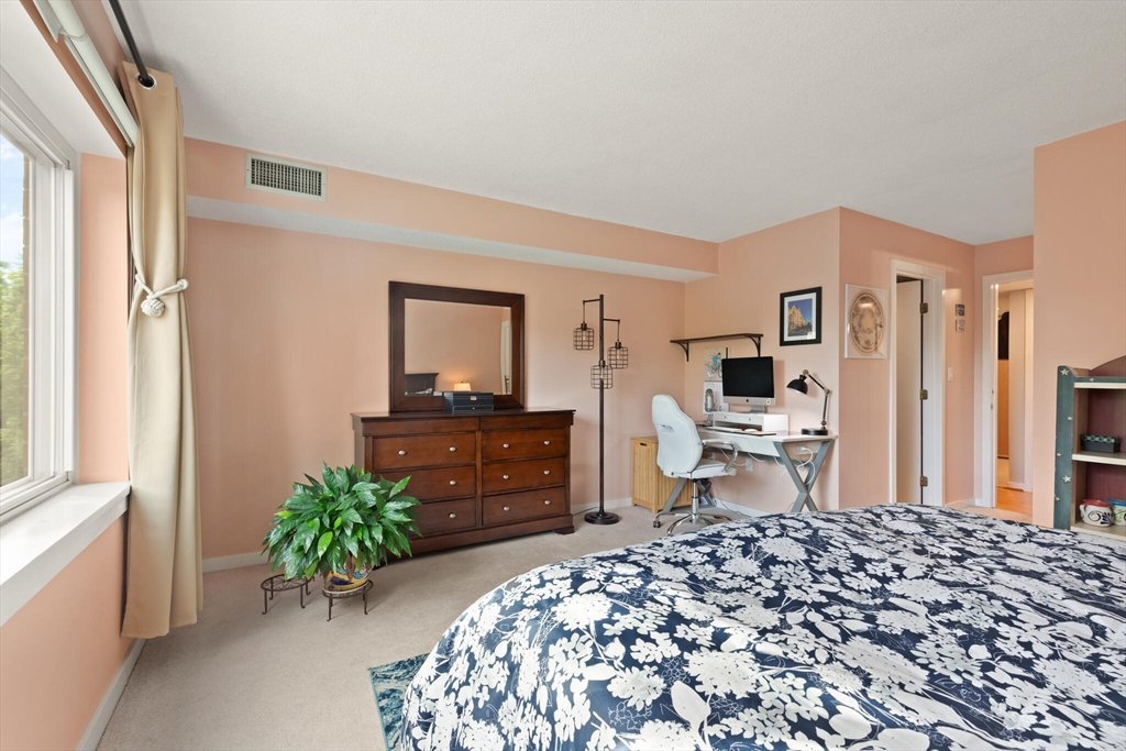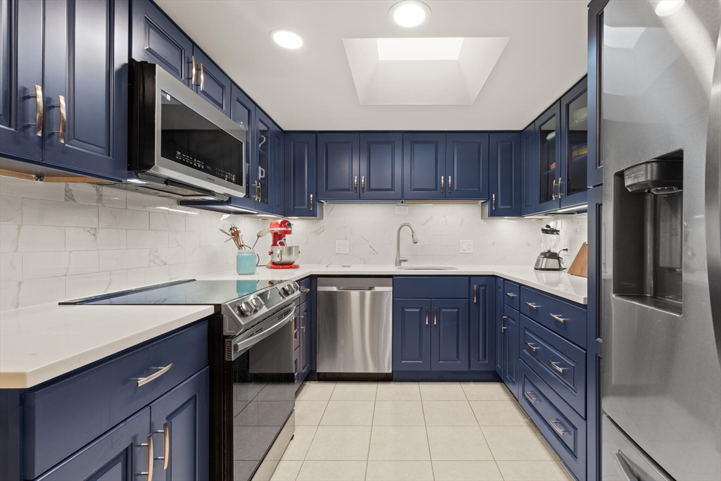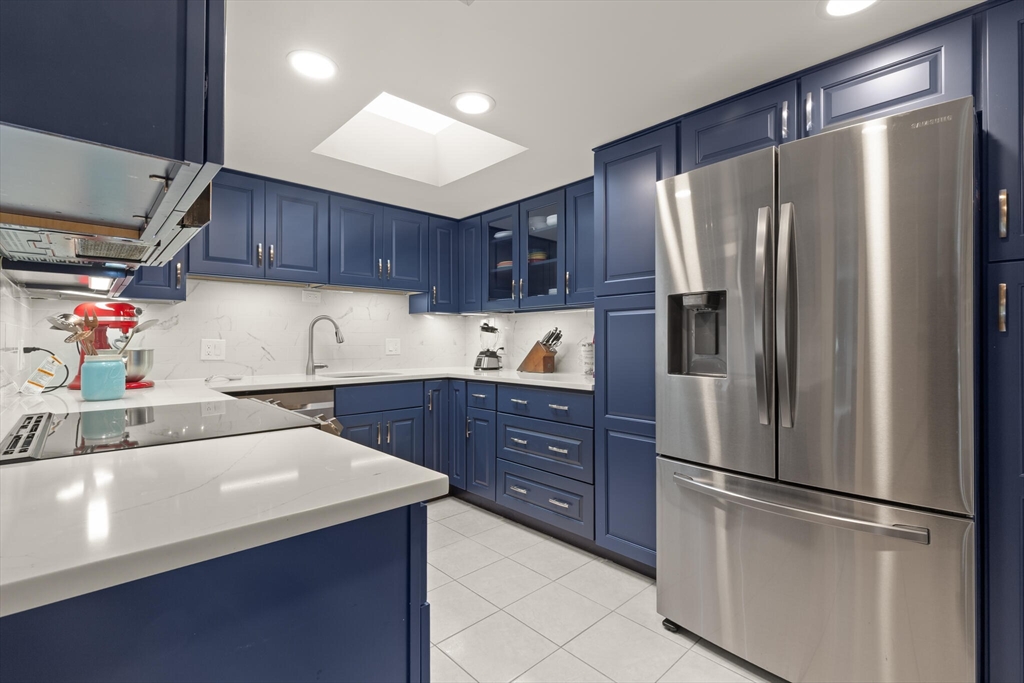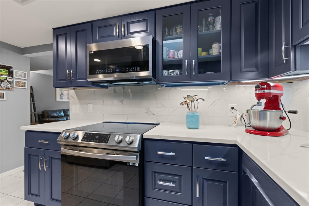 Remodeled 2-bedroom, 2 bath unit located at Place Lane Condominiums. Features: Kitchen with New Avance soft close cabinets, quartz countertops, tiled backsplash, recessed lighting, skylight, s.s. appliances, - convection stove. Large Dining room, living room is very spacious w. a fireplace and a slider to the 11 x 4 balcony. Master bedroom suite is carpeted, and has a full bath with new vanity, countertop, toilet, glass tub enclosure, also a walk-in closet plus a 2nd closet. 2nd bedroom has carpet and a double closet. Laundry area has a stackable washer/dryer. Updated Gas heating system and hot water tank. Central air and Central vac. New windows thought the unit. Enjoy all the Place Lane has to offer. large clubroom, inground pool, tennis court and extra storage. Conveniently located near Rt 128/93., bus and train. Stop by the Open Houses Friday 4:30-6pm, Saturday 12-2 pm, and Sunday 1-3pm