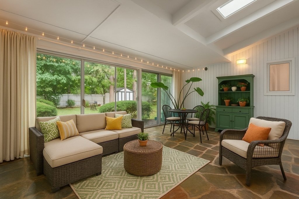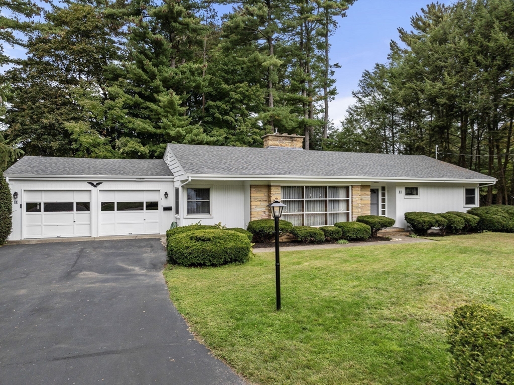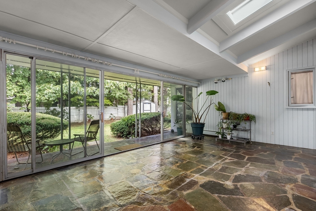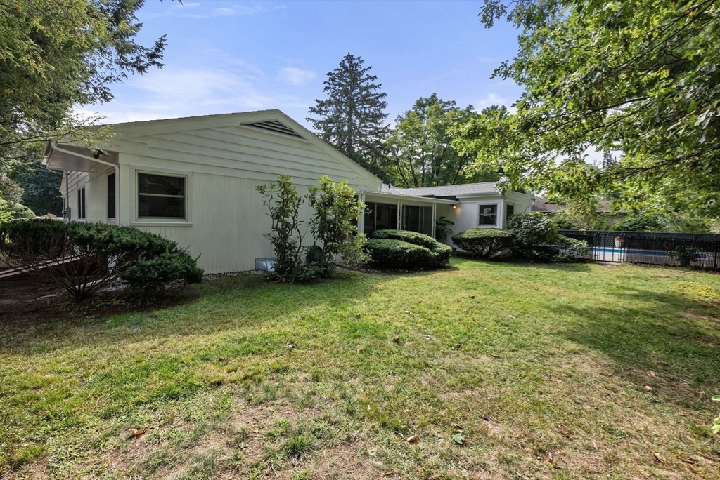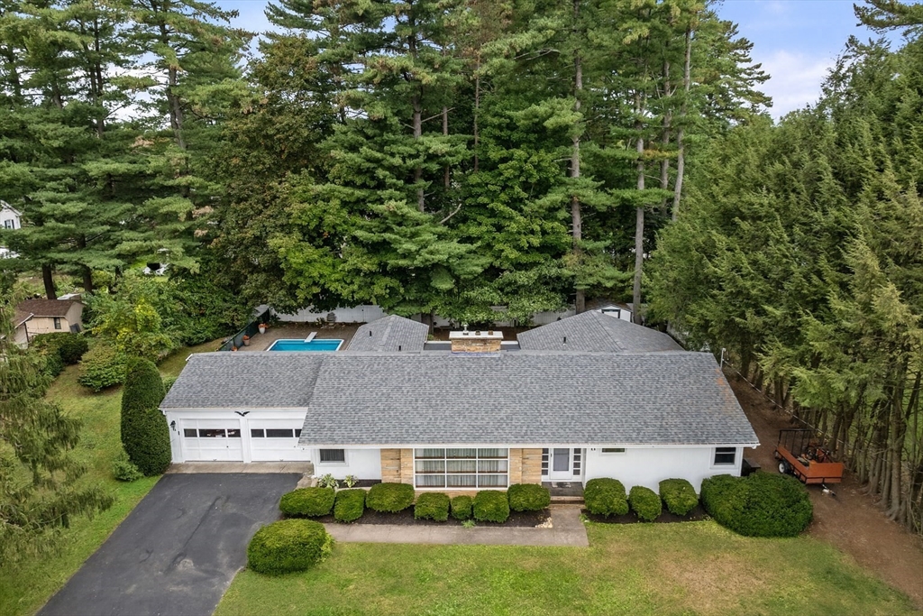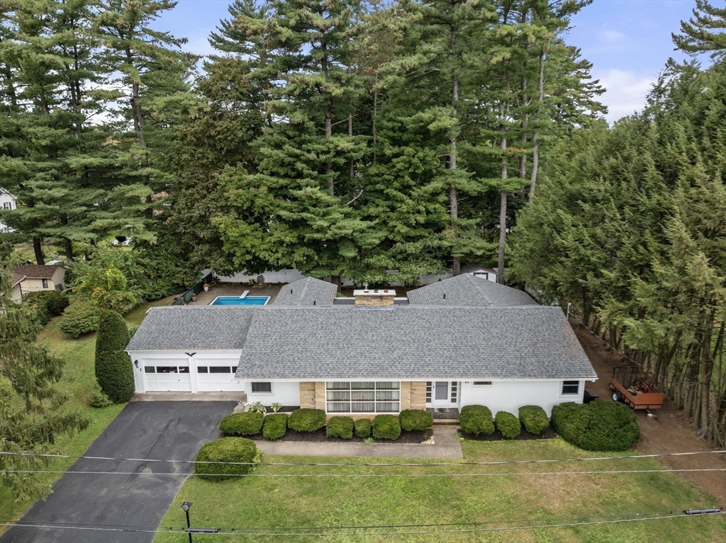 Tucked away on a quiet cul-de-sac, this approx. 3,250 sq ft Westfield ranch offers 4 bedrooms and 3 full baths in a flexible floor plan. The heart of the home is a stunning family room and enclosed patio with an expansive moving glass wall system which fills the area with natural light and lush views—blending indoor and outdoor living for year-round entertaining or relaxation. Vaulted ceilings with exposed beams, hardwood floors, and stone fireplaces add warmth and character. The kitchen features ample storage, stainless and classic appliances, and flows to a bright Great room. Spacious bedrooms boast oversized closets, built-ins, and sparkling baths. A finished lower level provides a large recreation room and generous storage. Outside, enjoy a private yard with patio and amazing in-ground pool for resort-style fun. Two-car garage, central air, and storage shed complete this home combining New England charm with distinctive architectural flair. Open House Saturday 10/4/25 from 12-2!
