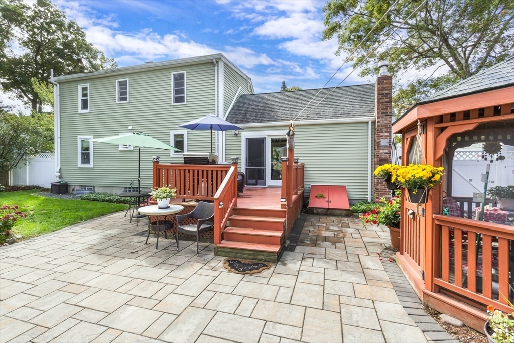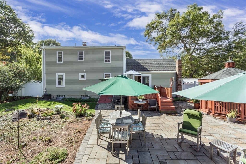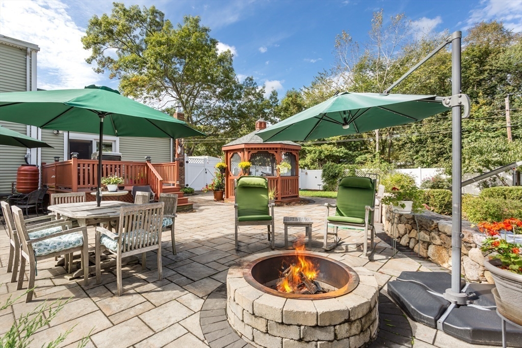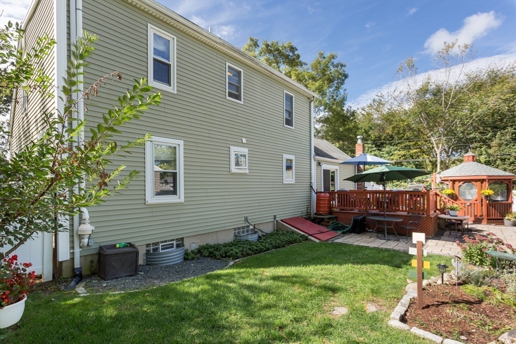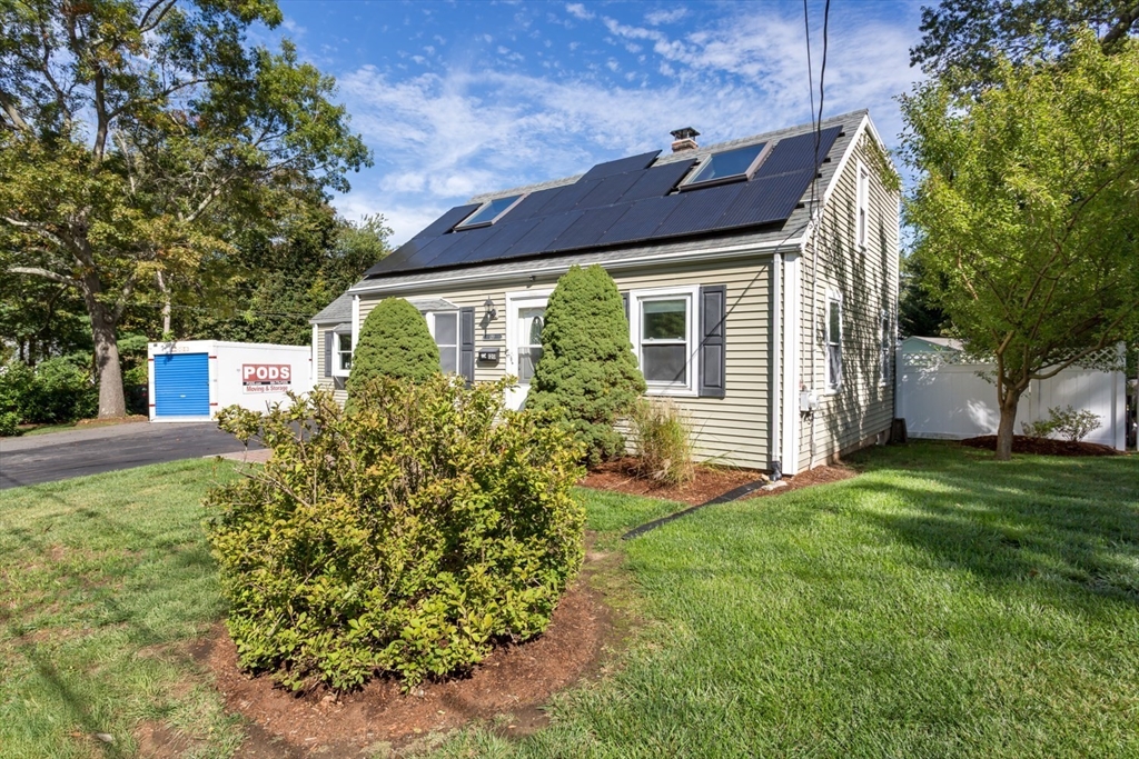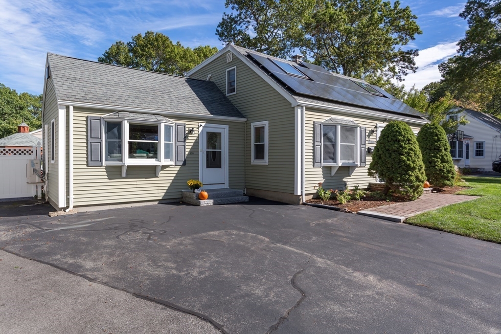 Looking for an inviting home in a desirable neighborhood? This 4 bedroom 2 bath Cape combines classic charm with modern updates. The bright open concept floor plan offers many possibilities for gatherings. The propane gas fireplaced family room offers a cozy place to watch your favorite program or enjoy a fire on a winter night. It has an efficient kitchen with upgraded solid oak cabinets, granite counters, wood floors, built-in pantry cabinets and stainless steel appliances. It opens to a bright full sized dining room. Two bedrooms on the 1st floor give a main suite option, if desired. The family room leads out to a beautiful deck with a distictive natural stone (250SF) patio, fire pit, screened gazebo and fenced yard surrounded by vegetable gardens, fruit trees and perennials. This home includes an efficient 2018-heat pump with two heads for both cooling and heating. Two Solar Panel Arrays-2015 are owned, 2010-Propane Stove and Boiler, 2015-Roof. Easy accesss to MBTA Boston, Rte 95.
