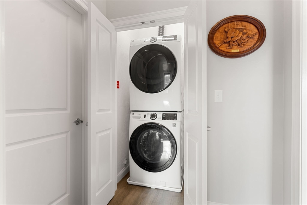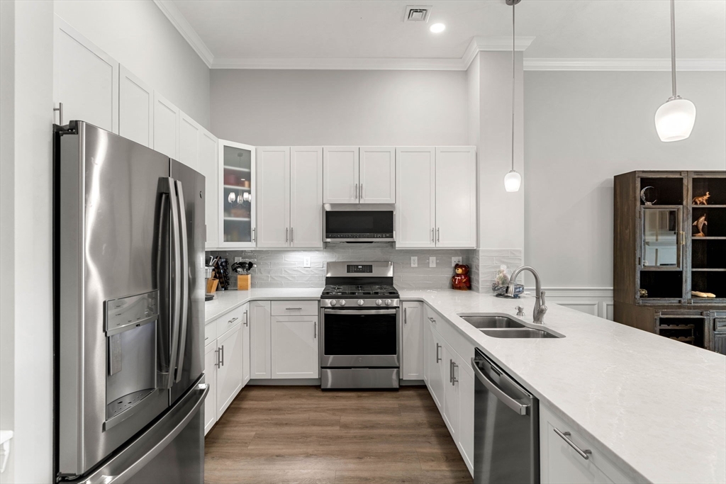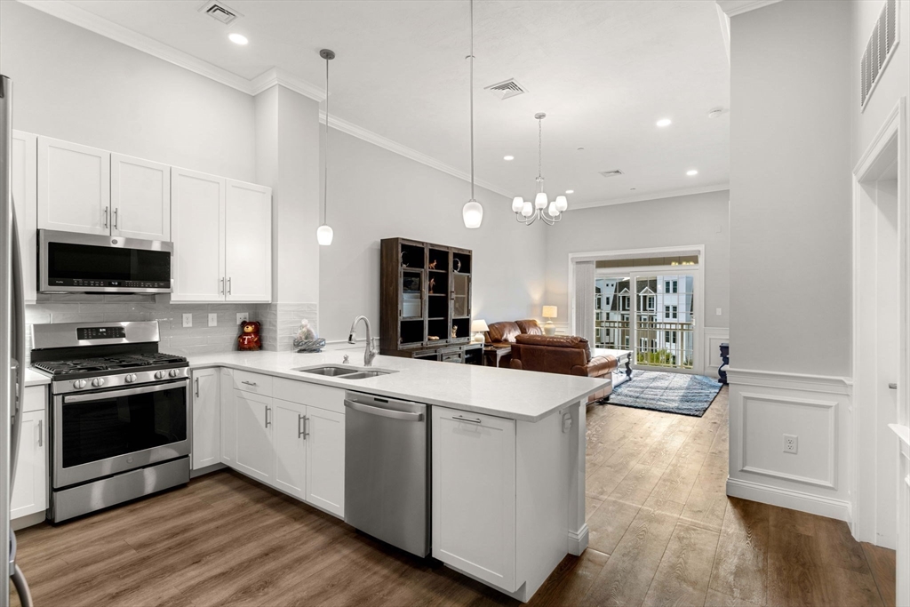 Welcome to the Wellington Woods community. Minutes from Boston, this stylish 1-bedroom home offers soaring 11.5 ft ceilings, beautiful moldings, quartz countertops with counter seating for casual dining, SS appliances, wide-plank luxury flooring, a custom closet, private balcony, home office space, deeded parking, and extra storage. Community amenities include an elevator, clubhouse, private screening room, fitness center, co-working spaces, sports court, pool, outdoor grilling and fire pit areas, EV charging stations, a gated dog park, and playground. All at an affordable HOA fee. Enjoy easy access to Assembly Row, major highways, and Wellington Station. This well maintained, quiet community is an oasis tucked away from the hustle and bustle yet convenient to local shopping and restaurants.