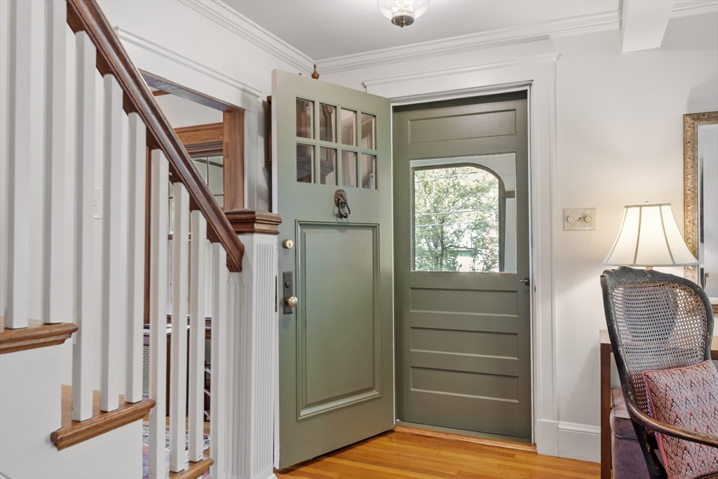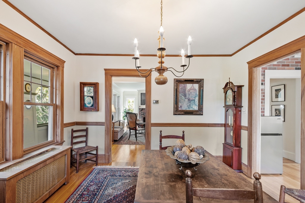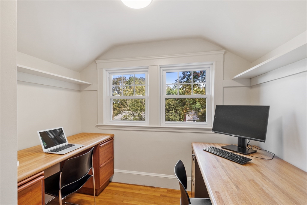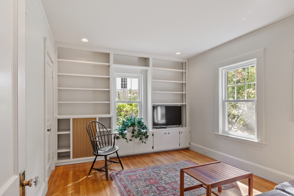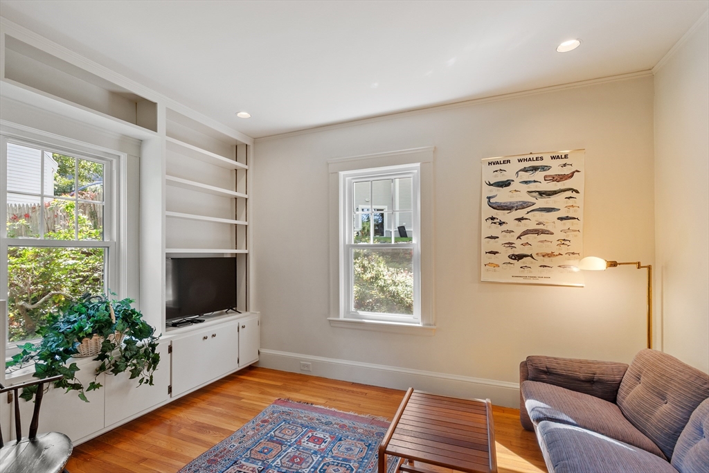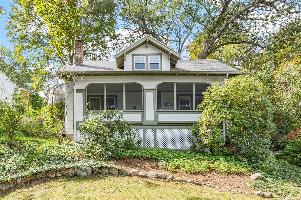 On sought-after Follen Hill, this fine 1928 home is recognized as one of few examples of the Bungalow style of architecture in Lexington. Outside, note the deep eaves, bracketed side gables and a room-sized screened front porch with distinctive columned woodwork. A gracious living room invites you to sit by the fireplace and is complemented by a formal dining room. The eat-in kitchen was redone by the owner with particular quality and includes an oversized bay window that overlooks a charming backyard. The first floor also has a delightful retro full bath and a bedroom/den with a wall of custom bookcases, cabinet and double closets. Upstairs, find a generous primary bedroom with an adjoining 2-person office. There is a bath and a sunny second bedroom with two walk-in closets. The lower level has another custom room with recessed lighting, diagonal fir walls and a full bath with jetted tub. Enjoy living near Wilson Farm, public transportation, Route 2 and the Bikeway. Welcome home!