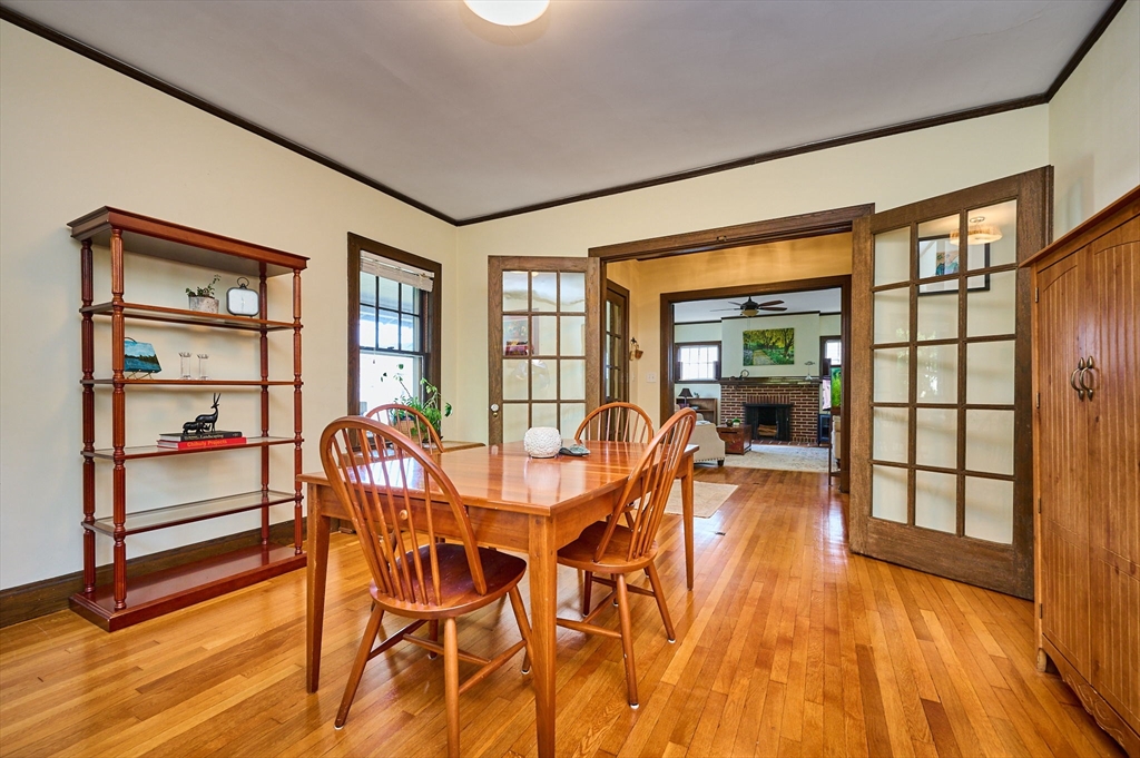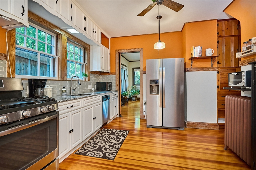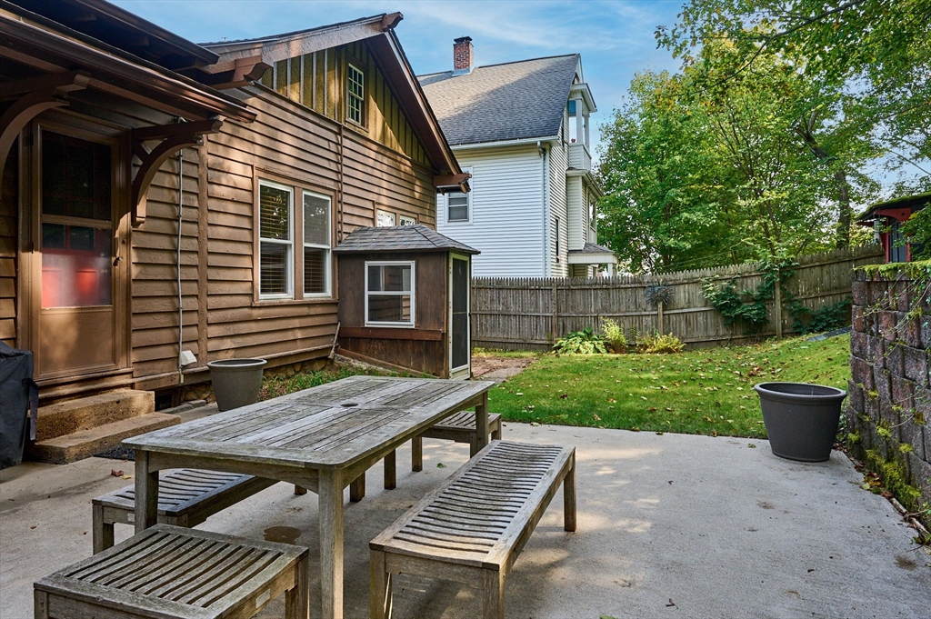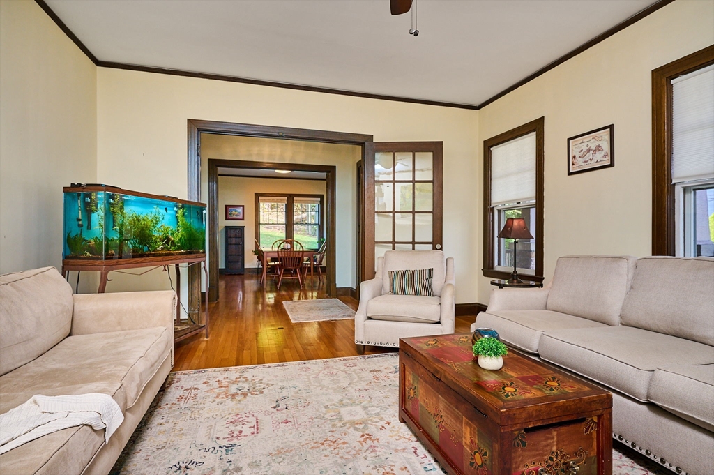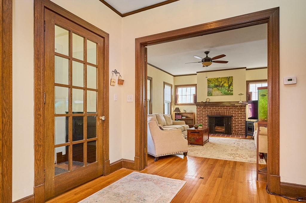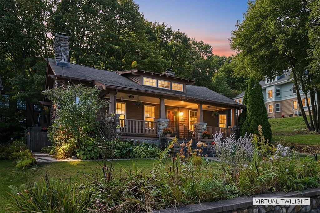 A true Craftsman-era gem, this home showcases timeless character with 9’ ceilings, substantial woodwork, French doors, and beautiful hardwood floors throughout. A deep front porch with stone piers welcomes you into a formal vestibule and gracious front hall. The spacious living room with fireplace flows to a handsome dining room, while the sunny kitchen offers granite counters, crisp white cabinets, glass tile backsplash, stainless appliances, built-in pantry, and breakfast nook. Two generous bedrooms and a tiled bath with built-in storage complete the main level. Additional highlights include a walk-up attic, usable walkout basement, efficient gas heat and hot water, and a fully fenced backyard with patio and shed. A practical, flowing floorplan with large rooms and classic details make this home both charming and functional with a convenient location near the hospital, high school, shopping, and highway access.