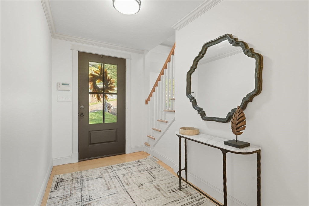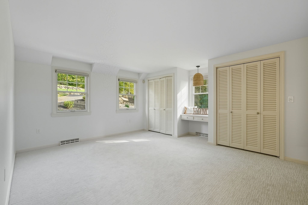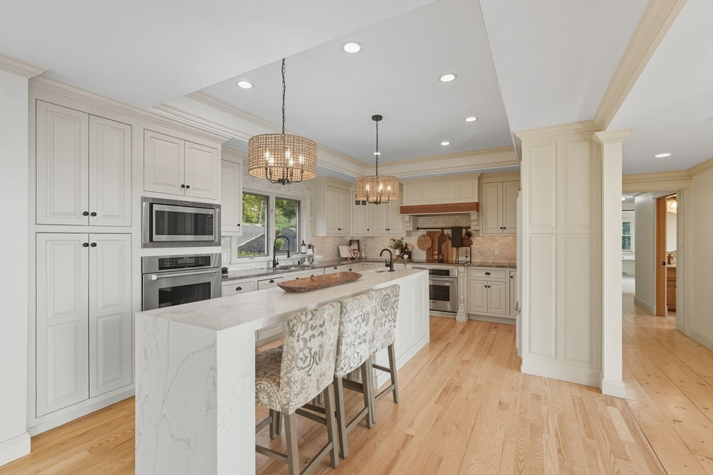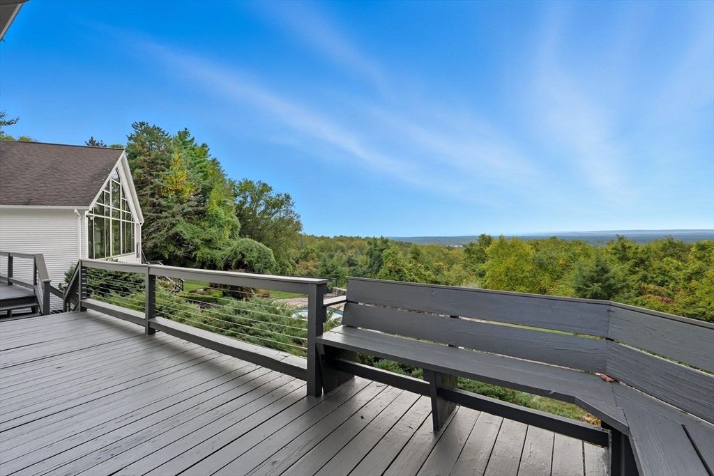 This luxurious single-family residence in Wilbraham presents an exceptional opportunity to own a home in great condition. The living room stands as a testament to architectural design, featuring a fireplace that serves as a warm focal point, while the beamed, high, and vaulted wood ceilings create an atmosphere of spaciousness and grandeur; floor to ceiling windows bathe the room in natural light, complemented by the refined touch of crown molding. The kitchen is a chef's dream, boasting a large kitchen island with stone countertops, a built-in refrigerator, and floor to ceiling windows that illuminate the space. The bathrooms offer a spa-like experience, each thoughtfully designed with a walk-in shower and double vanity. Master Suite with walk in closet and sun set views. The walk out basement is finished with full bathroom and brand new carpet. The pool has a brand new pump and ready for use. The views in this house are one of a kind, and picture perfect!