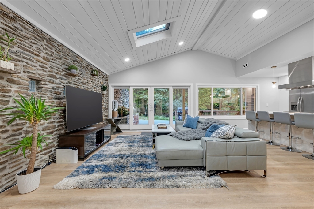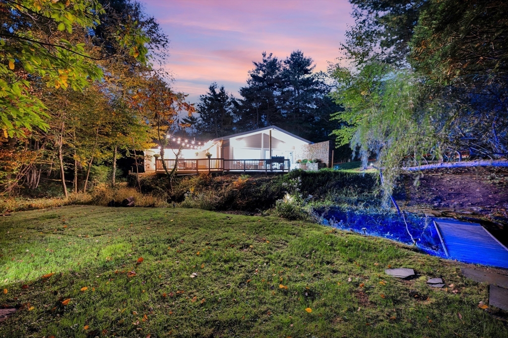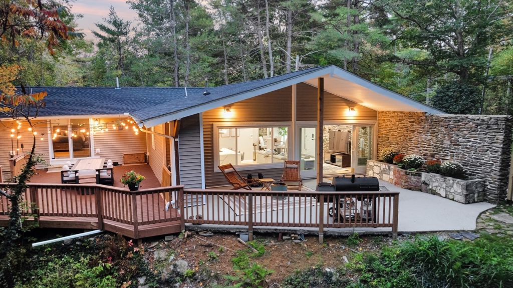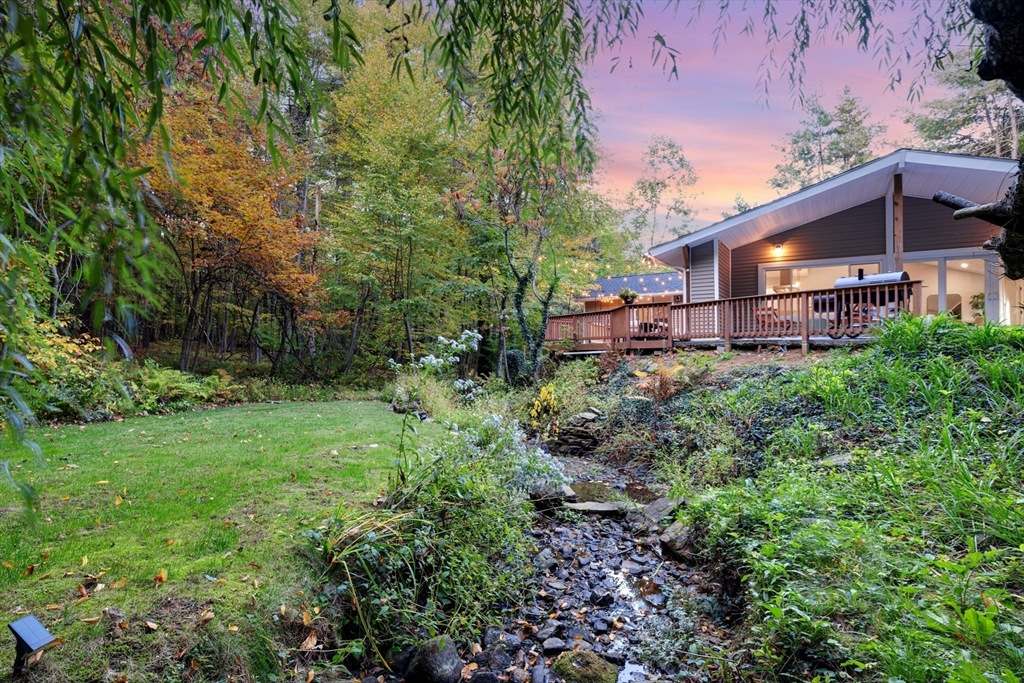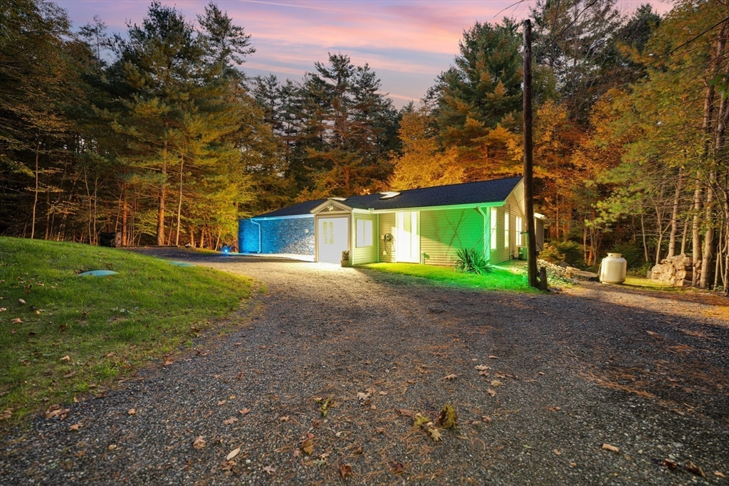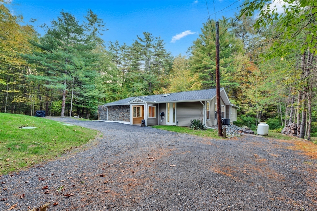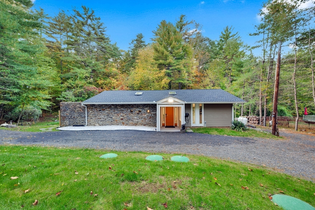Looking for something extraordinary? This stunning wooded retreat offers a fully remodeled, turnkey Contemporary Ranch w/ 3 bedrooms and 2 baths. Perfectly set in a prime central location near Old Sturbridge Village, this home abuts conservation land and walking trails, creating an ideal backdrop for nature lovers. Enjoy seamless indoor-outdoor living w/ a covered patio and composite deck overlooking a tranquil brook. The open-concept design features vaulted ceilings, recessed lighting, central air, continuous flooring, and a soothing neutral palette throughout. The chef’s kitchen is a showstopper—double waterfall quartz island, stainless appliances, sleek European cabinetry, and a spacious walk-in pantry. The vaulted primary suite boasts a private bath, walk-in closet, and direct deck access. Two additional bedrooms with double closets, a full bath, and a laundry closet complete the thoughtful layout. Pride of ownership shines throughout—this one-of-a-kind home is truly move-in ready