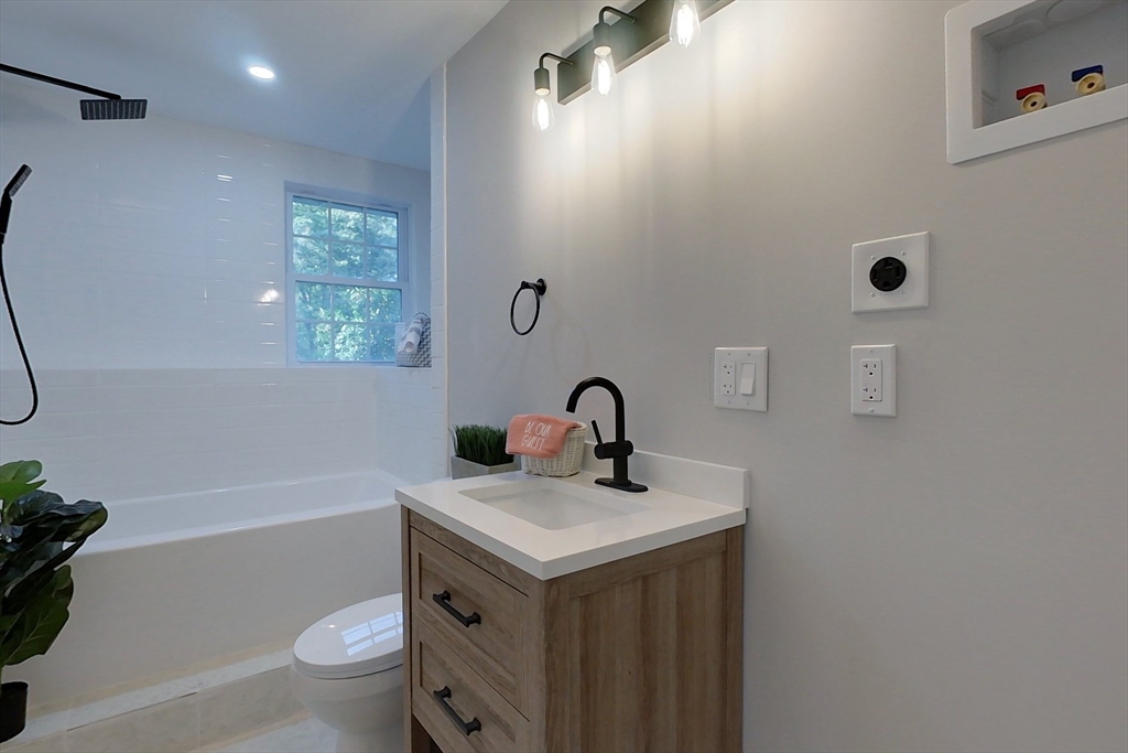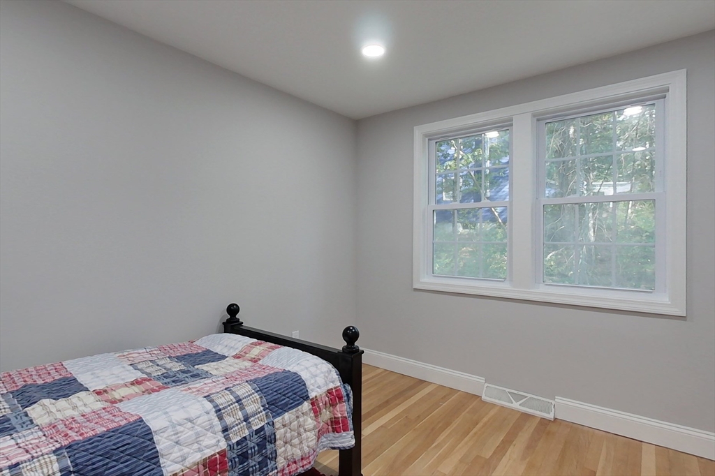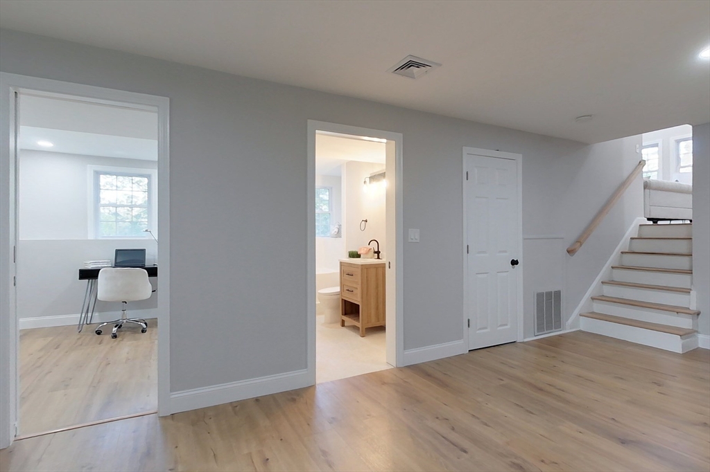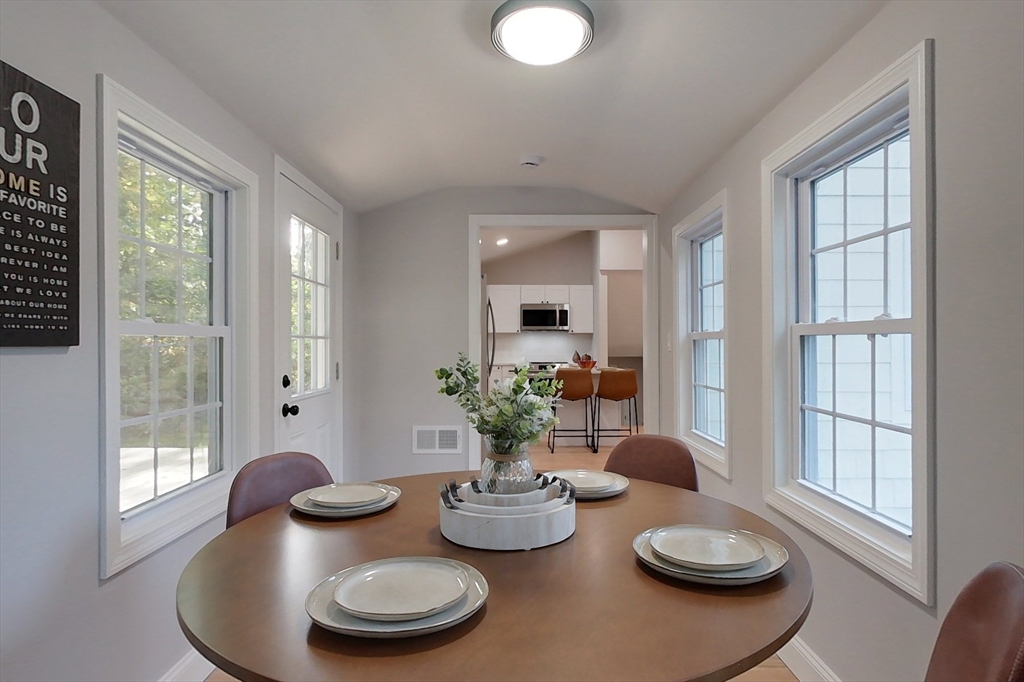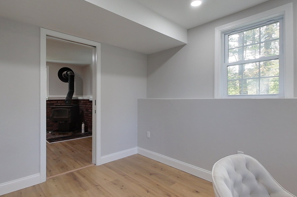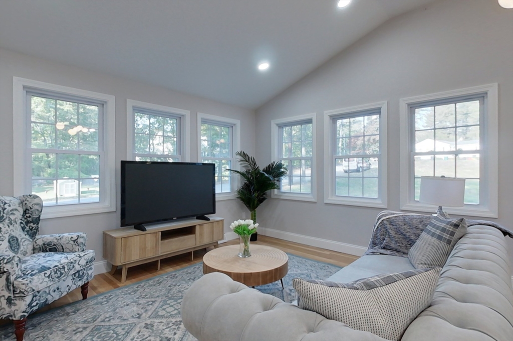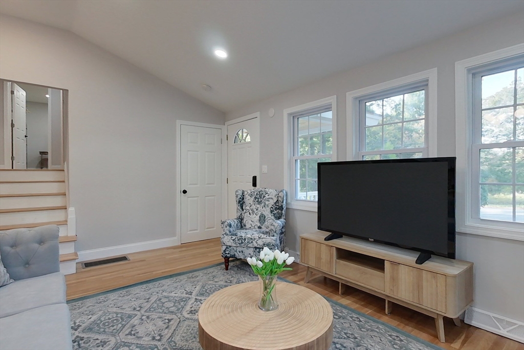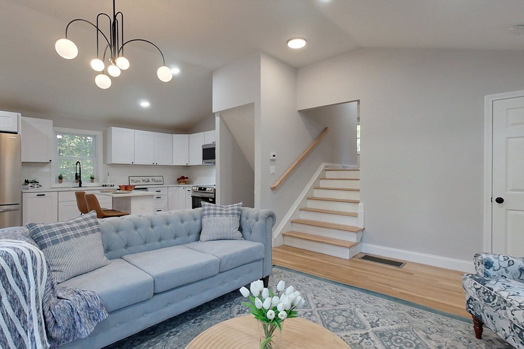Enter into this renovated raised ranch, beautifully set on just under a 1/2 acre w/ the perfect balance of privacy & location. Light flooring leads into the open concept living room featuring cathedral ceilings, recessed lighting & plenty of windows flooding the space w/ natural light. The kitchen showcases white shaker cabinets, new appliances, a quaint island & opens to a dining area/enclosed porch wrapped in windows. Up a few steps, find 3 DRMS & a stunning full BA w/ a custom-tiled walk-in shower, glass surround & built-in seating. The finished lower level adds 400+ sq. ft. of living space, including a bonus room w/ a woodstove on a brick hearth, an office/flex room, full BA & a utility room. Additional highlights include central AC, a new roof & a low-level deck for outdoor enjoyment. All tucked back from the bustle of town, yet close to shops, schools, dining, & just minutes to Route 3. Showings begin at an Open House Sat 10/4 from 11-1pm w/ & Sun 10/5 from 2-4pm.